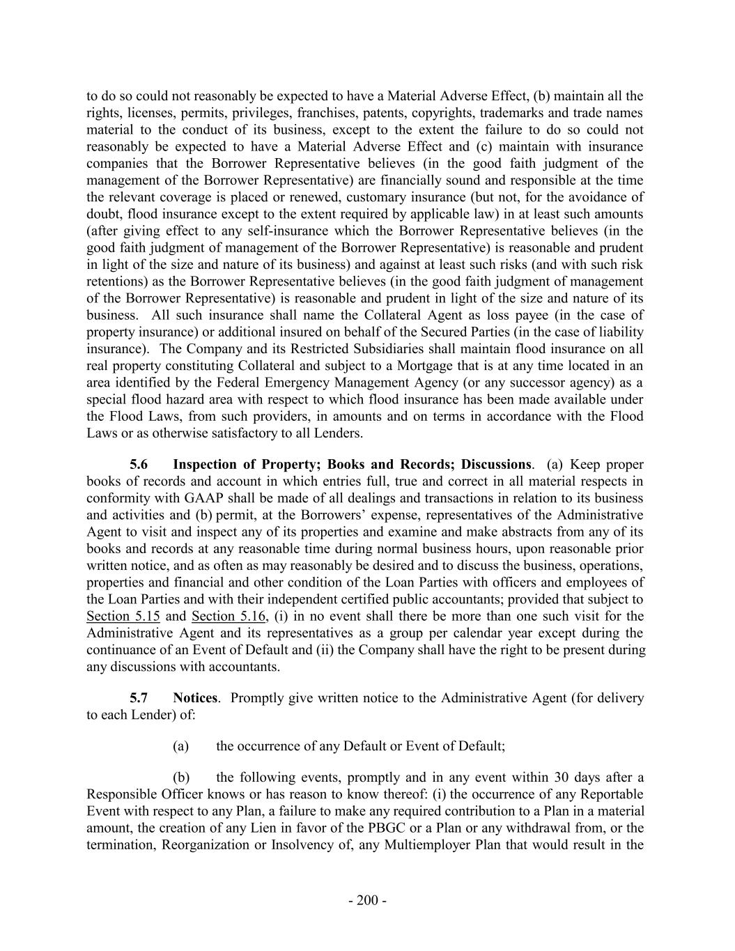 to do so could not reasonably be expected to have a Material Adverse Effect, (b) maintain all the rights, licenses, permits, privileges, franchises, patents, copyrights, trademarks and trade names material to the conduct of its business, except to the extent the failure to do so could not reasonably be expected to have a Material Adverse Effect and (c) maintain with insurance companies that the Borrower Representative believes (in the good faith judgment of the management of the Borrower Representative) are financially sound and responsible at the time the relevant coverage is placed or renewed, customary insurance (but not, for the avoidance of doubt, flood insurance except to the extent required by applicable law) in at least such amounts (after giving effect to any self-insurance which the Borrower Representative believes (in the good faith judgment of management of the Borrower Representative) is reasonable and prudent in light of the size and nature of its business) and against at least such risks (and with such risk retentions) as the Borrower Representative believes (in the good faith judgment of management of the Borrower Representative) is reasonable and prudent in light of the size and nature of its business. All such insurance shall name the Collateral Agent as loss payee (in the case of property insurance) or additional insured on behalf of the Secured Parties (in the case of liability insurance). The Company and its Restricted Subsidiaries shall maintain flood insurance on all real property constituting Collateral and subject to a Mortgage that is at any time located in an area identified by the Federal Emergency Management Agency (or any successor agency) as a special flood hazard area with respect to which flood insurance has been made available under the Flood Laws, from such providers, in amounts and on terms in accordance with the Flood Laws or as otherwise satisfactory to all Lenders. 5.6 Inspection of Property; Books and Records; Discussions. (a) Keep proper books of records and account in which entries full, true and correct in all material respects in conformity with GAAP shall be made of all dealings and transactions in relation to its business and activities and (b) permit, at the Borrowers’ expense, representatives of the Administrative Agent to visit and inspect any of its properties and examine and make abstracts from any of its books and records at any reasonable time during normal business hours, upon reasonable prior written notice, and as often as may reasonably be desired and to discuss the business, operations, properties and financial and other condition of the Loan Parties with officers and employees of the Loan Parties and with their independent certified public accountants; provided that subject to Section 5.15 and Section 5.16, (i) in no event shall there be more than one such visit for the Administrative Agent and its representatives as a group per calendar year except during the continuance of an Event of Default and (ii) the Company shall have the right to be present during any discussions with accountants. 5.7 Notices. Promptly give written notice to the Administrative Agent (for delivery to each Lender) of: (a) the occurrence of any Default or Event of Default; (b) the following events, promptly and in any event within 30 days after a Responsible Officer knows or has reason to know thereof: (i) the occurrence of any Reportable Event with respect to any Plan, a failure to make any required contribution to a Plan in a material amount, the creation of any Lien in favor of the PBGC or a Plan or any withdrawal from, or the termination, Reorganization or Insolvency of, any Multiemployer Plan that would result in the - 200 -