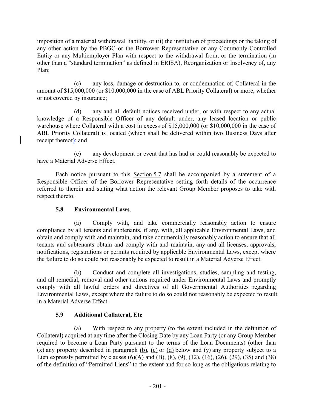 imposition of a material withdrawal liability, or (ii) the institution of proceedings or the taking of any other action by the PBGC or the Borrower Representative or any Commonly Controlled Entity or any Multiemployer Plan with respect to the withdrawal from, or the termination (in other than a “standard termination” as defined in ERISA), Reorganization or Insolvency of, any Plan; (c) any loss, damage or destruction to, or condemnation of, Collateral in the amount of $15,000,000 (or $10,000,000 in the case of ABL Priority Collateral) or more, whether or not covered by insurance; (d) any and all default notices received under, or with respect to any actual knowledge of a Responsible Officer of any default under, any leased location or public warehouse where Collateral with a cost in excess of $15,000,000 (or $10,000,000 in the case of ABL Priority Collateral) is located (which shall be delivered within two Business Days after receipt thereof); and (e) any development or event that has had or could reasonably be expected to have a Material Adverse Effect. Each notice pursuant to this Section 5.7 shall be accompanied by a statement of a Responsible Officer of the Borrower Representative setting forth details of the occurrence referred to therein and stating what action the relevant Group Member proposes to take with respect thereto. 5.8 Environmental Laws. (a) Comply with, and take commercially reasonably action to ensure compliance by all tenants and subtenants, if any, with, all applicable Environmental Laws, and obtain and comply with and maintain, and take commercially reasonably action to ensure that all tenants and subtenants obtain and comply with and maintain, any and all licenses, approvals, notifications, registrations or permits required by applicable Environmental Laws, except where the failure to do so could not reasonably be expected to result in a Material Adverse Effect. (b) Conduct and complete all investigations, studies, sampling and testing, and all remedial, removal and other actions required under Environmental Laws and promptly comply with all lawful orders and directives of all Governmental Authorities regarding Environmental Laws, except where the failure to do so could not reasonably be expected to result in a Material Adverse Effect. 5.9 Additional Collateral, Etc. (a) With respect to any property (to the extent included in the definition of Collateral) acquired at any time after the Closing Date by any Loan Party (or any Group Member required to become a Loan Party pursuant to the terms of the Loan Documents) (other than (x) any property described in paragraph (b), (c) or (d) below and (y) any property subject to a Lien expressly permitted by clauses (6)(A) and (B), (8), (9), (12), (16), (26), (29), (35) and (38) of the definition of “Permitted Liens” to the extent and for so long as the obligations relating to - 201 -