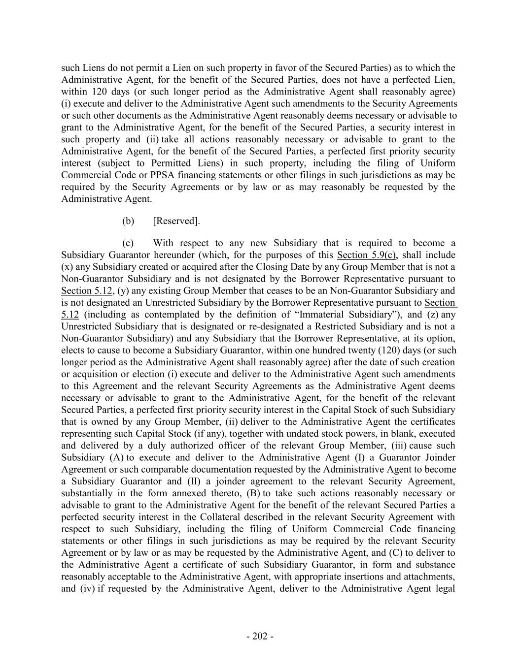 such Liens do not permit a Lien on such property in favor of the Secured Parties) as to which the Administrative Agent, for the benefit of the Secured Parties, does not have a perfected Lien, within 120 days (or such longer period as the Administrative Agent shall reasonably agree) (i) execute and deliver to the Administrative Agent such amendments to the Security Agreements or such other documents as the Administrative Agent reasonably deems necessary or advisable to grant to the Administrative Agent, for the benefit of the Secured Parties, a security interest in such property and (ii) take all actions reasonably necessary or advisable to grant to the Administrative Agent, for the benefit of the Secured Parties, a perfected first priority security interest (subject to Permitted Liens) in such property, including the filing of Uniform Commercial Code or PPSA financing statements or other filings in such jurisdictions as may be required by the Security Agreements or by law or as may reasonably be requested by the Administrative Agent. (b) [Reserved]. (c) With respect to any new Subsidiary that is required to become a Subsidiary Guarantor hereunder (which, for the purposes of this Section 5.9(c), shall include (x) any Subsidiary created or acquired after the Closing Date by any Group Member that is not a Non-Guarantor Subsidiary and is not designated by the Borrower Representative pursuant to Section 5.12, (y) any existing Group Member that ceases to be an Non-Guarantor Subsidiary and is not designated an Unrestricted Subsidiary by the Borrower Representative pursuant to Section 5.12 (including as contemplated by the definition of “Immaterial Subsidiary”), and (z) any Unrestricted Subsidiary that is designated or re-designated a Restricted Subsidiary and is not a Non-Guarantor Subsidiary) and any Subsidiary that the Borrower Representative, at its option, elects to cause to become a Subsidiary Guarantor, within one hundred twenty (120) days (or such longer period as the Administrative Agent shall reasonably agree) after the date of such creation or acquisition or election (i) execute and deliver to the Administrative Agent such amendments to this Agreement and the relevant Security Agreements as the Administrative Agent deems necessary or advisable to grant to the Administrative Agent, for the benefit of the relevant Secured Parties, a perfected first priority security interest in the Capital Stock of such Subsidiary that is owned by any Group Member, (ii) deliver to the Administrative Agent the certificates representing such Capital Stock (if any), together with undated stock powers, in blank, executed and delivered by a duly authorized officer of the relevant Group Member, (iii) cause such Subsidiary (A) to execute and deliver to the Administrative Agent (I) a Guarantor Joinder Agreement or such comparable documentation requested by the Administrative Agent to become a Subsidiary Guarantor and (II) a joinder agreement to the relevant Security Agreement, substantially in the form annexed thereto, (B) to take such actions reasonably necessary or advisable to grant to the Administrative Agent for the benefit of the relevant Secured Parties a perfected security interest in the Collateral described in the relevant Security Agreement with respect to such Subsidiary, including the filing of Uniform Commercial Code financing statements or other filings in such jurisdictions as may be required by the relevant Security Agreement or by law or as may be requested by the Administrative Agent, and (C) to deliver to the Administrative Agent a certificate of such Subsidiary Guarantor, in form and substance reasonably acceptable to the Administrative Agent, with appropriate insertions and attachments, and (iv) if requested by the Administrative Agent, deliver to the Administrative Agent legal - 202 -