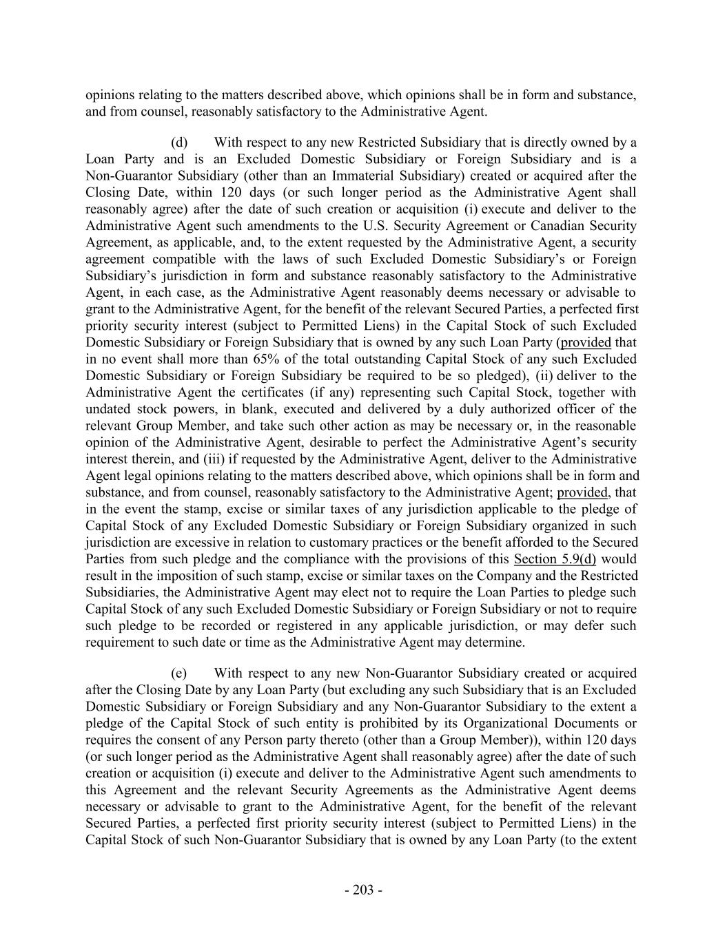 opinions relating to the matters described above, which opinions shall be in form and substance, and from counsel, reasonably satisfactory to the Administrative Agent. (d) With respect to any new Restricted Subsidiary that is directly owned by a Loan Party and is an Excluded Domestic Subsidiary or Foreign Subsidiary and is a Non-Guarantor Subsidiary (other than an Immaterial Subsidiary) created or acquired after the Closing Date, within 120 days (or such longer period as the Administrative Agent shall reasonably agree) after the date of such creation or acquisition (i) execute and deliver to the Administrative Agent such amendments to the U.S. Security Agreement or Canadian Security Agreement, as applicable, and, to the extent requested by the Administrative Agent, a security agreement compatible with the laws of such Excluded Domestic Subsidiary’s or Foreign Subsidiary’s jurisdiction in form and substance reasonably satisfactory to the Administrative Agent, in each case, as the Administrative Agent reasonably deems necessary or advisable to grant to the Administrative Agent, for the benefit of the relevant Secured Parties, a perfected first priority security interest (subject to Permitted Liens) in the Capital Stock of such Excluded Domestic Subsidiary or Foreign Subsidiary that is owned by any such Loan Party (provided that in no event shall more than 65% of the total outstanding Capital Stock of any such Excluded Domestic Subsidiary or Foreign Subsidiary be required to be so pledged), (ii) deliver to the Administrative Agent the certificates (if any) representing such Capital Stock, together with undated stock powers, in blank, executed and delivered by a duly authorized officer of the relevant Group Member, and take such other action as may be necessary or, in the reasonable opinion of the Administrative Agent, desirable to perfect the Administrative Agent’s security interest therein, and (iii) if requested by the Administrative Agent, deliver to the Administrative Agent legal opinions relating to the matters described above, which opinions shall be in form and substance, and from counsel, reasonably satisfactory to the Administrative Agent; provided, that in the event the stamp, excise or similar taxes of any jurisdiction applicable to the pledge of Capital Stock of any Excluded Domestic Subsidiary or Foreign Subsidiary organized in such jurisdiction are excessive in relation to customary practices or the benefit afforded to the Secured Parties from such pledge and the compliance with the provisions of this Section 5.9(d) would result in the imposition of such stamp, excise or similar taxes on the Company and the Restricted Subsidiaries, the Administrative Agent may elect not to require the Loan Parties to pledge such Capital Stock of any such Excluded Domestic Subsidiary or Foreign Subsidiary or not to require such pledge to be recorded or registered in any applicable jurisdiction, or may defer such requirement to such date or time as the Administrative Agent may determine. (e) With respect to any new Non-Guarantor Subsidiary created or acquired after the Closing Date by any Loan Party (but excluding any such Subsidiary that is an Excluded Domestic Subsidiary or Foreign Subsidiary and any Non-Guarantor Subsidiary to the extent a pledge of the Capital Stock of such entity is prohibited by its Organizational Documents or requires the consent of any Person party thereto (other than a Group Member)), within 120 days (or such longer period as the Administrative Agent shall reasonably agree) after the date of such creation or acquisition (i) execute and deliver to the Administrative Agent such amendments to this Agreement and the relevant Security Agreements as the Administrative Agent deems necessary or advisable to grant to the Administrative Agent, for the benefit of the relevant Secured Parties, a perfected first priority security interest (subject to Permitted Liens) in the Capital Stock of such Non-Guarantor Subsidiary that is owned by any Loan Party (to the extent - 203 -