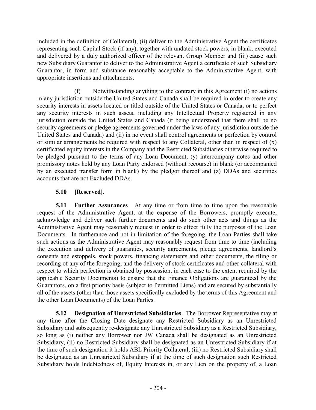 included in the definition of Collateral), (ii) deliver to the Administrative Agent the certificates representing such Capital Stock (if any), together with undated stock powers, in blank, executed and delivered by a duly authorized officer of the relevant Group Member and (iii) cause such new Subsidiary Guarantor to deliver to the Administrative Agent a certificate of such Subsidiary Guarantor, in form and substance reasonably acceptable to the Administrative Agent, with appropriate insertions and attachments. (f) Notwithstanding anything to the contrary in this Agreement (i) no actions in any jurisdiction outside the United States and Canada shall be required in order to create any security interests in assets located or titled outside of the United States or Canada, or to perfect any security interests in such assets, including any Intellectual Property registered in any jurisdiction outside the United States and Canada (it being understood that there shall be no security agreements or pledge agreements governed under the laws of any jurisdiction outside the United States and Canada) and (ii) in no event shall control agreements or perfection by control or similar arrangements be required with respect to any Collateral, other than in respect of (x) certificated equity interests in the Company and the Restricted Subsidiaries otherwise required to be pledged pursuant to the terms of any Loan Document, (y) intercompany notes and other promissory notes held by any Loan Party endorsed (without recourse) in blank (or accompanied by an executed transfer form in blank) by the pledgor thereof and (z) DDAs and securities accounts that are not Excluded DDAs. 5.10 [Reserved]. 5.11 Further Assurances. At any time or from time to time upon the reasonable request of the Administrative Agent, at the expense of the Borrowers, promptly execute, acknowledge and deliver such further documents and do such other acts and things as the Administrative Agent may reasonably request in order to effect fully the purposes of the Loan Documents. In furtherance and not in limitation of the foregoing, the Loan Parties shall take such actions as the Administrative Agent may reasonably request from time to time (including the execution and delivery of guaranties, security agreements, pledge agreements, landlord’s consents and estoppels, stock powers, financing statements and other documents, the filing or recording of any of the foregoing, and the delivery of stock certificates and other collateral with respect to which perfection is obtained by possession, in each case to the extent required by the applicable Security Documents) to ensure that the Finance Obligations are guaranteed by the Guarantors, on a first priority basis (subject to Permitted Liens) and are secured by substantially all of the assets (other than those assets specifically excluded by the terms of this Agreement and the other Loan Documents) of the Loan Parties. 5.12 Designation of Unrestricted Subsidiaries. The Borrower Representative may at any time after the Closing Date designate any Restricted Subsidiary as an Unrestricted Subsidiary and subsequently re-designate any Unrestricted Subsidiary as a Restricted Subsidiary, so long as (i) neither any Borrower nor JW Canada shall be designated as an Unrestricted Subsidiary, (ii) no Restricted Subsidiary shall be designated as an Unrestricted Subsidiary if at the time of such designation it holds ABL Priority Collateral, (iii) no Restricted Subsidiary shall be designated as an Unrestricted Subsidiary if at the time of such designation such Restricted Subsidiary holds Indebtedness of, Equity Interests in, or any Lien on the property of, a Loan - 204 -