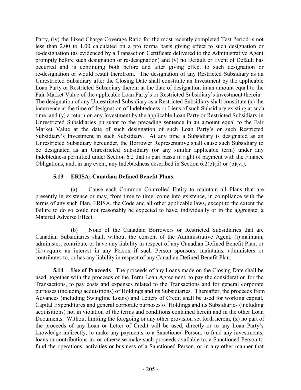Party, (iv) the Fixed Charge Coverage Ratio for the most recently completed Test Period is not less than 2.00 to 1.00 calculated on a pro forma basis giving effect to such designation or re-designation (as evidenced by a Transaction Certificate delivered to the Administrative Agent promptly before such designation or re-designation) and (v) no Default or Event of Default has occurred and is continuing both before and after giving effect to such designation or re-designation or would result therefrom. The designation of any Restricted Subsidiary as an Unrestricted Subsidiary after the Closing Date shall constitute an Investment by the applicable Loan Party or Restricted Subsidiary therein at the date of designation in an amount equal to the Fair Market Value of the applicable Loan Party’s or Restricted Subsidiary’s investment therein. The designation of any Unrestricted Subsidiary as a Restricted Subsidiary shall constitute (x) the incurrence at the time of designation of Indebtedness or Liens of such Subsidiary existing at such time, and (y) a return on any Investment by the applicable Loan Party or Restricted Subsidiary in Unrestricted Subsidiaries pursuant to the preceding sentence in an amount equal to the Fair Market Value at the date of such designation of such Loan Party’s or such Restricted Subsidiary’s Investment in such Subsidiary. At any time a Subsidiary is designated as an Unrestricted Subsidiary hereunder, the Borrower Representative shall cause such Subsidiary to be designated as an Unrestricted Subsidiary (or any similar applicable term) under any Indebtedness permitted under Section 6.2 that is pari passu in right of payment with the Finance Obligations, and, in any event, any Indebtedness described in Section 6.2(b)(ii) or (b)(vi). 5.13 ERISA; Canadian Defined Benefit Plans. (a) Cause each Common Controlled Entity to maintain all Plans that are presently in existence or may, from time to time, come into existence, in compliance with the terms of any such Plan, ERISA, the Code and all other applicable laws, except to the extent the failure to do so could not reasonably be expected to have, individually or in the aggregate, a Material Adverse Effect. (b) None of the Canadian Borrowers or Restricted Subsidiaries that are Canadian Subsidiaries shall, without the consent of the Administrative Agent, (i) maintain, administer, contribute or have any liability in respect of any Canadian Defined Benefit Plan, or (ii) acquire an interest in any Person if such Person sponsors, maintains, administers or contributes to, or has any liability in respect of any Canadian Defined Benefit Plan. 5.14 Use of Proceeds. The proceeds of any Loans made on the Closing Date shall be used, together with the proceeds of the Term Loan Agreement, to pay the consideration for the Transactions, to pay costs and expenses related to the Transactions and for general corporate purposes (including acquisitions) of Holdings and its Subsidiaries. Thereafter, the proceeds from Advances (including Swingline Loans) and Letters of Credit shall be used for working capital, Capital Expenditures and general corporate purposes of Holdings and its Subsidiaries (including acquisitions) not in violation of the terms and conditions contained herein and in the other Loan Documents. Without limiting the foregoing or any other provision set forth herein, (x) no part of the proceeds of any Loan or Letter of Credit will be used, directly or to any Loan Party’s knowledge indirectly, to make any payments to a Sanctioned Person, to fund any investments, loans or contributions in, or otherwise make such proceeds available to, a Sanctioned Person to fund the operations, activities or business of a Sanctioned Person, or in any other manner that - 205 -