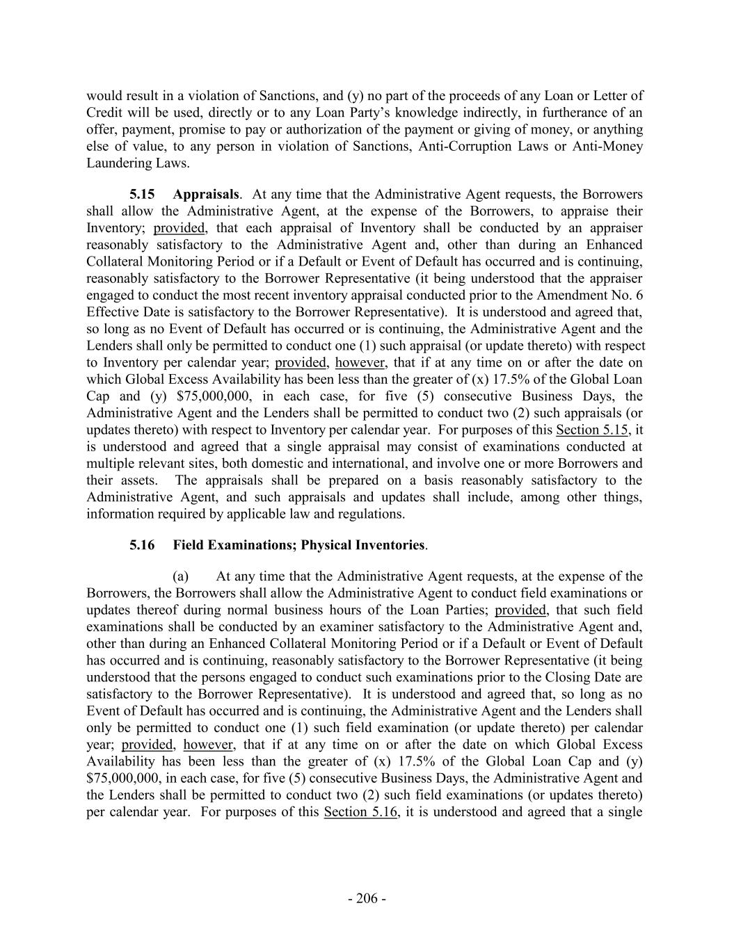 would result in a violation of Sanctions, and (y) no part of the proceeds of any Loan or Letter of Credit will be used, directly or to any Loan Party’s knowledge indirectly, in furtherance of an offer, payment, promise to pay or authorization of the payment or giving of money, or anything else of value, to any person in violation of Sanctions, Anti-Corruption Laws or Anti-Money Laundering Laws. 5.15 Appraisals. At any time that the Administrative Agent requests, the Borrowers shall allow the Administrative Agent, at the expense of the Borrowers, to appraise their Inventory; provided, that each appraisal of Inventory shall be conducted by an appraiser reasonably satisfactory to the Administrative Agent and, other than during an Enhanced Collateral Monitoring Period or if a Default or Event of Default has occurred and is continuing, reasonably satisfactory to the Borrower Representative (it being understood that the appraiser engaged to conduct the most recent inventory appraisal conducted prior to the Amendment No. 6 Effective Date is satisfactory to the Borrower Representative). It is understood and agreed that, so long as no Event of Default has occurred or is continuing, the Administrative Agent and the Lenders shall only be permitted to conduct one (1) such appraisal (or update thereto) with respect to Inventory per calendar year; provided, however, that if at any time on or after the date on which Global Excess Availability has been less than the greater of (x) 17.5% of the Global Loan Cap and (y) $75,000,000, in each case, for five (5) consecutive Business Days, the Administrative Agent and the Lenders shall be permitted to conduct two (2) such appraisals (or updates thereto) with respect to Inventory per calendar year. For purposes of this Section 5.15, it is understood and agreed that a single appraisal may consist of examinations conducted at multiple relevant sites, both domestic and international, and involve one or more Borrowers and their assets. The appraisals shall be prepared on a basis reasonably satisfactory to the Administrative Agent, and such appraisals and updates shall include, among other things, information required by applicable law and regulations. 5.16 Field Examinations; Physical Inventories. (a) At any time that the Administrative Agent requests, at the expense of the Borrowers, the Borrowers shall allow the Administrative Agent to conduct field examinations or updates thereof during normal business hours of the Loan Parties; provided, that such field examinations shall be conducted by an examiner satisfactory to the Administrative Agent and, other than during an Enhanced Collateral Monitoring Period or if a Default or Event of Default has occurred and is continuing, reasonably satisfactory to the Borrower Representative (it being understood that the persons engaged to conduct such examinations prior to the Closing Date are satisfactory to the Borrower Representative). It is understood and agreed that, so long as no Event of Default has occurred and is continuing, the Administrative Agent and the Lenders shall only be permitted to conduct one (1) such field examination (or update thereto) per calendar year; provided, however, that if at any time on or after the date on which Global Excess Availability has been less than the greater of (x) 17.5% of the Global Loan Cap and (y) $75,000,000, in each case, for five (5) consecutive Business Days, the Administrative Agent and the Lenders shall be permitted to conduct two (2) such field examinations (or updates thereto) per calendar year. For purposes of this Section 5.16, it is understood and agreed that a single - 206 -