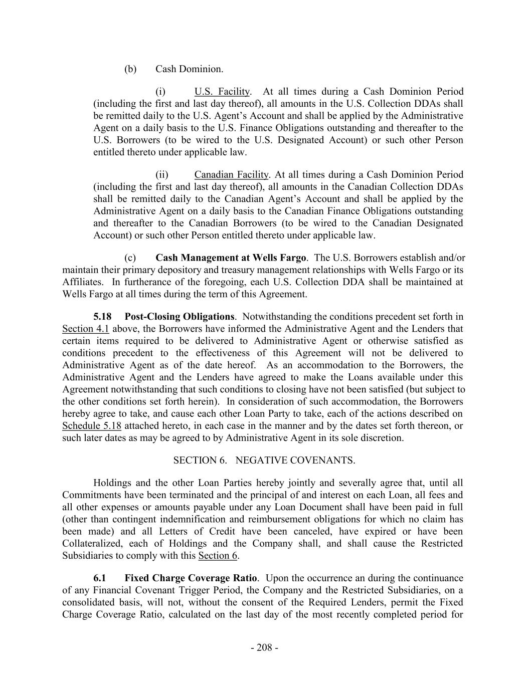 (b) Cash Dominion. (i) U.S. Facility. At all times during a Cash Dominion Period (including the first and last day thereof), all amounts in the U.S. Collection DDAs shall be remitted daily to the U.S. Agent’s Account and shall be applied by the Administrative Agent on a daily basis to the U.S. Finance Obligations outstanding and thereafter to the U.S. Borrowers (to be wired to the U.S. Designated Account) or such other Person entitled thereto under applicable law. (ii) Canadian Facility. At all times during a Cash Dominion Period (including the first and last day thereof), all amounts in the Canadian Collection DDAs shall be remitted daily to the Canadian Agent’s Account and shall be applied by the Administrative Agent on a daily basis to the Canadian Finance Obligations outstanding and thereafter to the Canadian Borrowers (to be wired to the Canadian Designated Account) or such other Person entitled thereto under applicable law. (c) Cash Management at Wells Fargo. The U.S. Borrowers establish and/or maintain their primary depository and treasury management relationships with Wells Fargo or its Affiliates. In furtherance of the foregoing, each U.S. Collection DDA shall be maintained at Wells Fargo at all times during the term of this Agreement. 5.18 Post-Closing Obligations. Notwithstanding the conditions precedent set forth in Section 4.1 above, the Borrowers have informed the Administrative Agent and the Lenders that certain items required to be delivered to Administrative Agent or otherwise satisfied as conditions precedent to the effectiveness of this Agreement will not be delivered to Administrative Agent as of the date hereof. As an accommodation to the Borrowers, the Administrative Agent and the Lenders have agreed to make the Loans available under this Agreement notwithstanding that such conditions to closing have not been satisfied (but subject to the other conditions set forth herein). In consideration of such accommodation, the Borrowers hereby agree to take, and cause each other Loan Party to take, each of the actions described on Schedule 5.18 attached hereto, in each case in the manner and by the dates set forth thereon, or such later dates as may be agreed to by Administrative Agent in its sole discretion. SECTION 6. NEGATIVE COVENANTS. Holdings and the other Loan Parties hereby jointly and severally agree that, until all Commitments have been terminated and the principal of and interest on each Loan, all fees and all other expenses or amounts payable under any Loan Document shall have been paid in full (other than contingent indemnification and reimbursement obligations for which no claim has been made) and all Letters of Credit have been canceled, have expired or have been Collateralized, each of Holdings and the Company shall, and shall cause the Restricted Subsidiaries to comply with this Section 6. 6.1 Fixed Charge Coverage Ratio. Upon the occurrence an during the continuance of any Financial Covenant Trigger Period, the Company and the Restricted Subsidiaries, on a consolidated basis, will not, without the consent of the Required Lenders, permit the Fixed Charge Coverage Ratio, calculated on the last day of the most recently completed period for - 208 -
