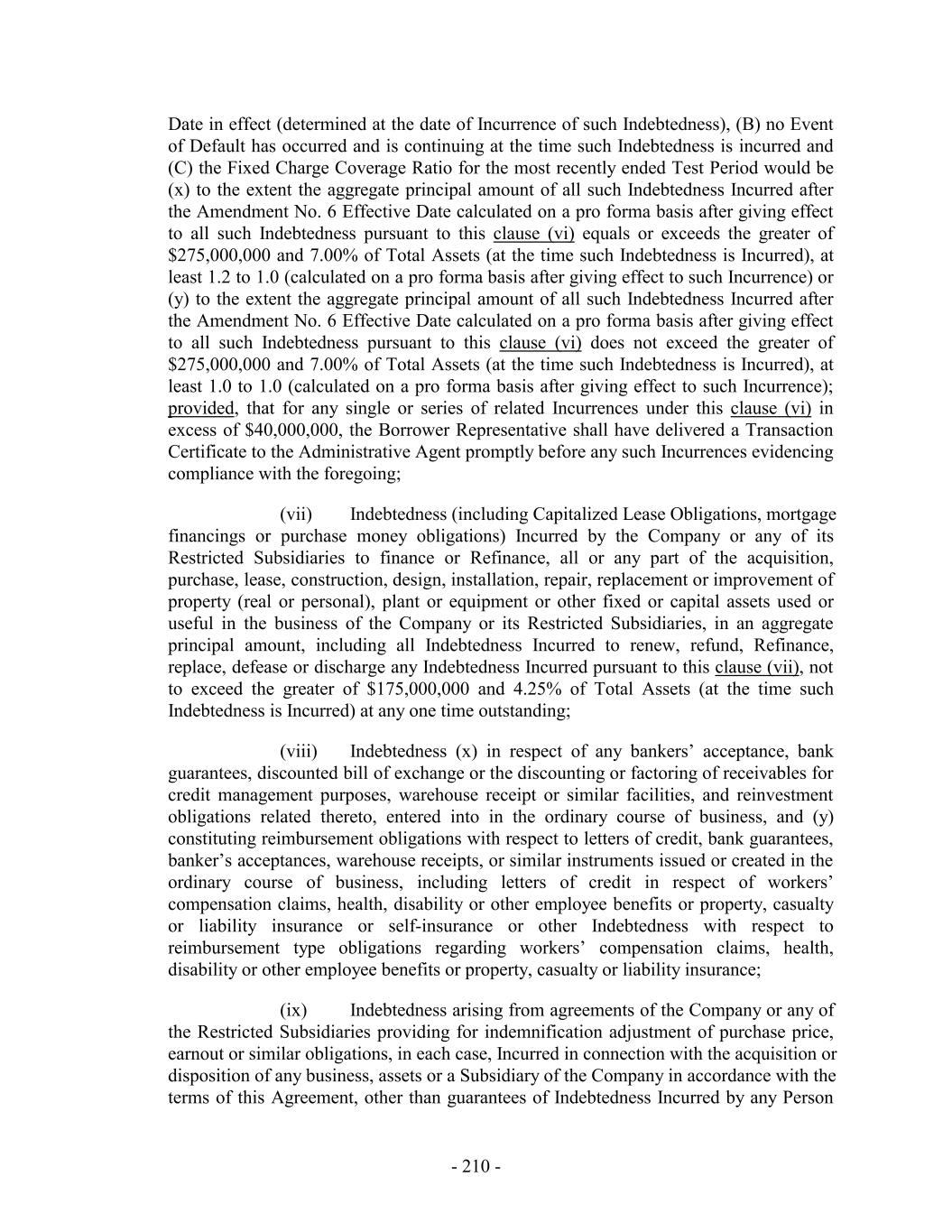 Date in effect (determined at the date of Incurrence of such Indebtedness), (B) no Event of Default has occurred and is continuing at the time such Indebtedness is incurred and (C) the Fixed Charge Coverage Ratio for the most recently ended Test Period would be (x) to the extent the aggregate principal amount of all such Indebtedness Incurred after the Amendment No. 6 Effective Date calculated on a pro forma basis after giving effect to all such Indebtedness pursuant to this clause (vi) equals or exceeds the greater of $275,000,000 and 7.00% of Total Assets (at the time such Indebtedness is Incurred), at least 1.2 to 1.0 (calculated on a pro forma basis after giving effect to such Incurrence) or (y) to the extent the aggregate principal amount of all such Indebtedness Incurred after the Amendment No. 6 Effective Date calculated on a pro forma basis after giving effect to all such Indebtedness pursuant to this clause (vi) does not exceed the greater of $275,000,000 and 7.00% of Total Assets (at the time such Indebtedness is Incurred), at least 1.0 to 1.0 (calculated on a pro forma basis after giving effect to such Incurrence); provided, that for any single or series of related Incurrences under this clause (vi) in excess of $40,000,000, the Borrower Representative shall have delivered a Transaction Certificate to the Administrative Agent promptly before any such Incurrences evidencing compliance with the foregoing; (vii) Indebtedness (including Capitalized Lease Obligations, mortgage financings or purchase money obligations) Incurred by the Company or any of its Restricted Subsidiaries to finance or Refinance, all or any part of the acquisition, purchase, lease, construction, design, installation, repair, replacement or improvement of property (real or personal), plant or equipment or other fixed or capital assets used or useful in the business of the Company or its Restricted Subsidiaries, in an aggregate principal amount, including all Indebtedness Incurred to renew, refund, Refinance, replace, defease or discharge any Indebtedness Incurred pursuant to this clause (vii), not to exceed the greater of $175,000,000 and 4.25% of Total Assets (at the time such Indebtedness is Incurred) at any one time outstanding; (viii) Indebtedness (x) in respect of any bankers’ acceptance, bank guarantees, discounted bill of exchange or the discounting or factoring of receivables for credit management purposes, warehouse receipt or similar facilities, and reinvestment obligations related thereto, entered into in the ordinary course of business, and (y) constituting reimbursement obligations with respect to letters of credit, bank guarantees, banker’s acceptances, warehouse receipts, or similar instruments issued or created in the ordinary course of business, including letters of credit in respect of workers’ compensation claims, health, disability or other employee benefits or property, casualty or liability insurance or self-insurance or other Indebtedness with respect to reimbursement type obligations regarding workers’ compensation claims, health, disability or other employee benefits or property, casualty or liability insurance; (ix) Indebtedness arising from agreements of the Company or any of the Restricted Subsidiaries providing for indemnification adjustment of purchase price, earnout or similar obligations, in each case, Incurred in connection with the acquisition or disposition of any business, assets or a Subsidiary of the Company in accordance with the terms of this Agreement, other than guarantees of Indebtedness Incurred by any Person - 210 -