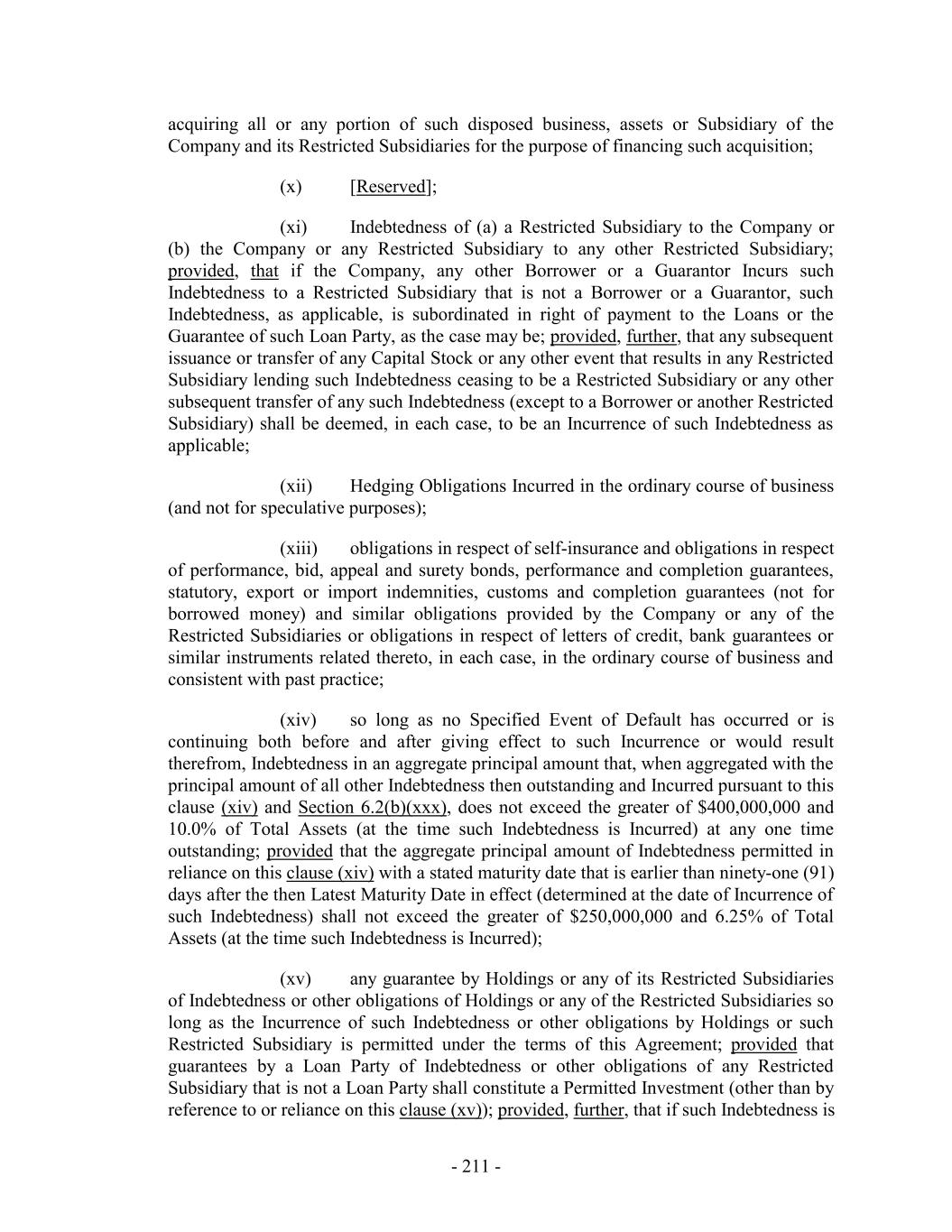 acquiring all or any portion of such disposed business, assets or Subsidiary of the Company and its Restricted Subsidiaries for the purpose of financing such acquisition; (x) [Reserved]; (xi) Indebtedness of (a) a Restricted Subsidiary to the Company or (b) the Company or any Restricted Subsidiary to any other Restricted Subsidiary; provided, that if the Company, any other Borrower or a Guarantor Incurs such Indebtedness to a Restricted Subsidiary that is not a Borrower or a Guarantor, such Indebtedness, as applicable, is subordinated in right of payment to the Loans or the Guarantee of such Loan Party, as the case may be; provided, further, that any subsequent issuance or transfer of any Capital Stock or any other event that results in any Restricted Subsidiary lending such Indebtedness ceasing to be a Restricted Subsidiary or any other subsequent transfer of any such Indebtedness (except to a Borrower or another Restricted Subsidiary) shall be deemed, in each case, to be an Incurrence of such Indebtedness as applicable; (xii) Hedging Obligations Incurred in the ordinary course of business (and not for speculative purposes); (xiii) obligations in respect of self-insurance and obligations in respect of performance, bid, appeal and surety bonds, performance and completion guarantees, statutory, export or import indemnities, customs and completion guarantees (not for borrowed money) and similar obligations provided by the Company or any of the Restricted Subsidiaries or obligations in respect of letters of credit, bank guarantees or similar instruments related thereto, in each case, in the ordinary course of business and consistent with past practice; (xiv) so long as no Specified Event of Default has occurred or is continuing both before and after giving effect to such Incurrence or would result therefrom, Indebtedness in an aggregate principal amount that, when aggregated with the principal amount of all other Indebtedness then outstanding and Incurred pursuant to this clause (xiv) and Section 6.2(b)(xxx), does not exceed the greater of $400,000,000 and 10.0% of Total Assets (at the time such Indebtedness is Incurred) at any one time outstanding; provided that the aggregate principal amount of Indebtedness permitted in reliance on this clause (xiv) with a stated maturity date that is earlier than ninety-one (91) days after the then Latest Maturity Date in effect (determined at the date of Incurrence of such Indebtedness) shall not exceed the greater of $250,000,000 and 6.25% of Total Assets (at the time such Indebtedness is Incurred); (xv) any guarantee by Holdings or any of its Restricted Subsidiaries of Indebtedness or other obligations of Holdings or any of the Restricted Subsidiaries so long as the Incurrence of such Indebtedness or other obligations by Holdings or such Restricted Subsidiary is permitted under the terms of this Agreement; provided that guarantees by a Loan Party of Indebtedness or other obligations of any Restricted Subsidiary that is not a Loan Party shall constitute a Permitted Investment (other than by reference to or reliance on this clause (xv)); provided, further, that if such Indebtedness is - 211 -
