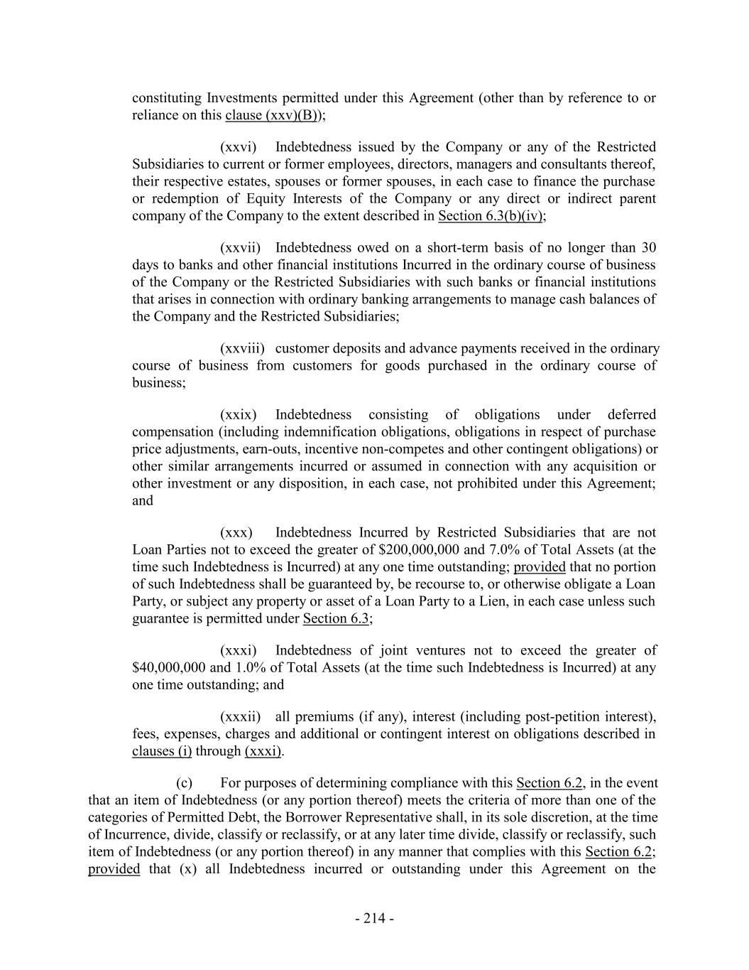 constituting Investments permitted under this Agreement (other than by reference to or reliance on this clause (xxv)(B)); (xxvi) Indebtedness issued by the Company or any of the Restricted Subsidiaries to current or former employees, directors, managers and consultants thereof, their respective estates, spouses or former spouses, in each case to finance the purchase or redemption of Equity Interests of the Company or any direct or indirect parent company of the Company to the extent described in Section 6.3(b)(iv); (xxvii) Indebtedness owed on a short-term basis of no longer than 30 days to banks and other financial institutions Incurred in the ordinary course of business of the Company or the Restricted Subsidiaries with such banks or financial institutions that arises in connection with ordinary banking arrangements to manage cash balances of the Company and the Restricted Subsidiaries; (xxviii) customer deposits and advance payments received in the ordinary course of business from customers for goods purchased in the ordinary course of business; (xxix) Indebtedness consisting of obligations under deferred compensation (including indemnification obligations, obligations in respect of purchase price adjustments, earn-outs, incentive non-competes and other contingent obligations) or other similar arrangements incurred or assumed in connection with any acquisition or other investment or any disposition, in each case, not prohibited under this Agreement; and (xxx) Indebtedness Incurred by Restricted Subsidiaries that are not Loan Parties not to exceed the greater of $200,000,000 and 7.0% of Total Assets (at the time such Indebtedness is Incurred) at any one time outstanding; provided that no portion of such Indebtedness shall be guaranteed by, be recourse to, or otherwise obligate a Loan Party, or subject any property or asset of a Loan Party to a Lien, in each case unless such guarantee is permitted under Section 6.3; (xxxi) Indebtedness of joint ventures not to exceed the greater of $40,000,000 and 1.0% of Total Assets (at the time such Indebtedness is Incurred) at any one time outstanding; and (xxxii) all premiums (if any), interest (including post-petition interest), fees, expenses, charges and additional or contingent interest on obligations described in clauses (i) through (xxxi). (c) For purposes of determining compliance with this Section 6.2, in the event that an item of Indebtedness (or any portion thereof) meets the criteria of more than one of the categories of Permitted Debt, the Borrower Representative shall, in its sole discretion, at the time of Incurrence, divide, classify or reclassify, or at any later time divide, classify or reclassify, such item of Indebtedness (or any portion thereof) in any manner that complies with this Section 6.2; provided that (x) all Indebtedness incurred or outstanding under this Agreement on the - 214 -