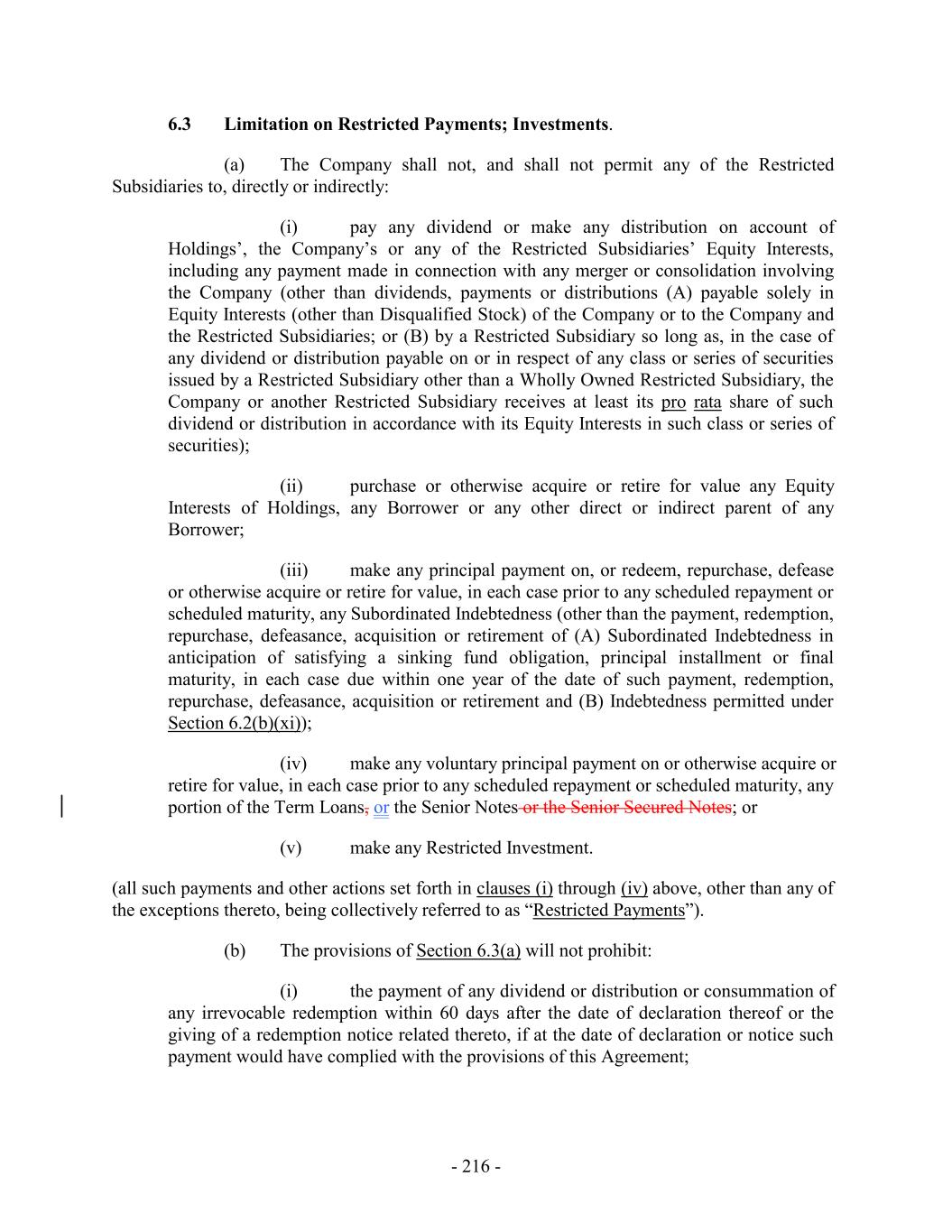 6.3 Limitation on Restricted Payments; Investments. (a) The Company shall not, and shall not permit any of the Restricted Subsidiaries to, directly or indirectly: (i) pay any dividend or make any distribution on account of Holdings’, the Company’s or any of the Restricted Subsidiaries’ Equity Interests, including any payment made in connection with any merger or consolidation involving the Company (other than dividends, payments or distributions (A) payable solely in Equity Interests (other than Disqualified Stock) of the Company or to the Company and the Restricted Subsidiaries; or (B) by a Restricted Subsidiary so long as, in the case of any dividend or distribution payable on or in respect of any class or series of securities issued by a Restricted Subsidiary other than a Wholly Owned Restricted Subsidiary, the Company or another Restricted Subsidiary receives at least its pro rata share of such dividend or distribution in accordance with its Equity Interests in such class or series of securities); (ii) purchase or otherwise acquire or retire for value any Equity Interests of Holdings, any Borrower or any other direct or indirect parent of any Borrower; (iii) make any principal payment on, or redeem, repurchase, defease or otherwise acquire or retire for value, in each case prior to any scheduled repayment or scheduled maturity, any Subordinated Indebtedness (other than the payment, redemption, repurchase, defeasance, acquisition or retirement of (A) Subordinated Indebtedness in anticipation of satisfying a sinking fund obligation, principal installment or final maturity, in each case due within one year of the date of such payment, redemption, repurchase, defeasance, acquisition or retirement and (B) Indebtedness permitted under Section 6.2(b)(xi)); (iv) make any voluntary principal payment on or otherwise acquire or retire for value, in each case prior to any scheduled repayment or scheduled maturity, any portion of the Term Loans, or the Senior Notes or the Senior Secured Notes; or (v) make any Restricted Investment. (all such payments and other actions set forth in clauses (i) through (iv) above, other than any of the exceptions thereto, being collectively referred to as “Restricted Payments”). (b) The provisions of Section 6.3(a) will not prohibit: (i) the payment of any dividend or distribution or consummation of any irrevocable redemption within 60 days after the date of declaration thereof or the giving of a redemption notice related thereto, if at the date of declaration or notice such payment would have complied with the provisions of this Agreement; - 216 -