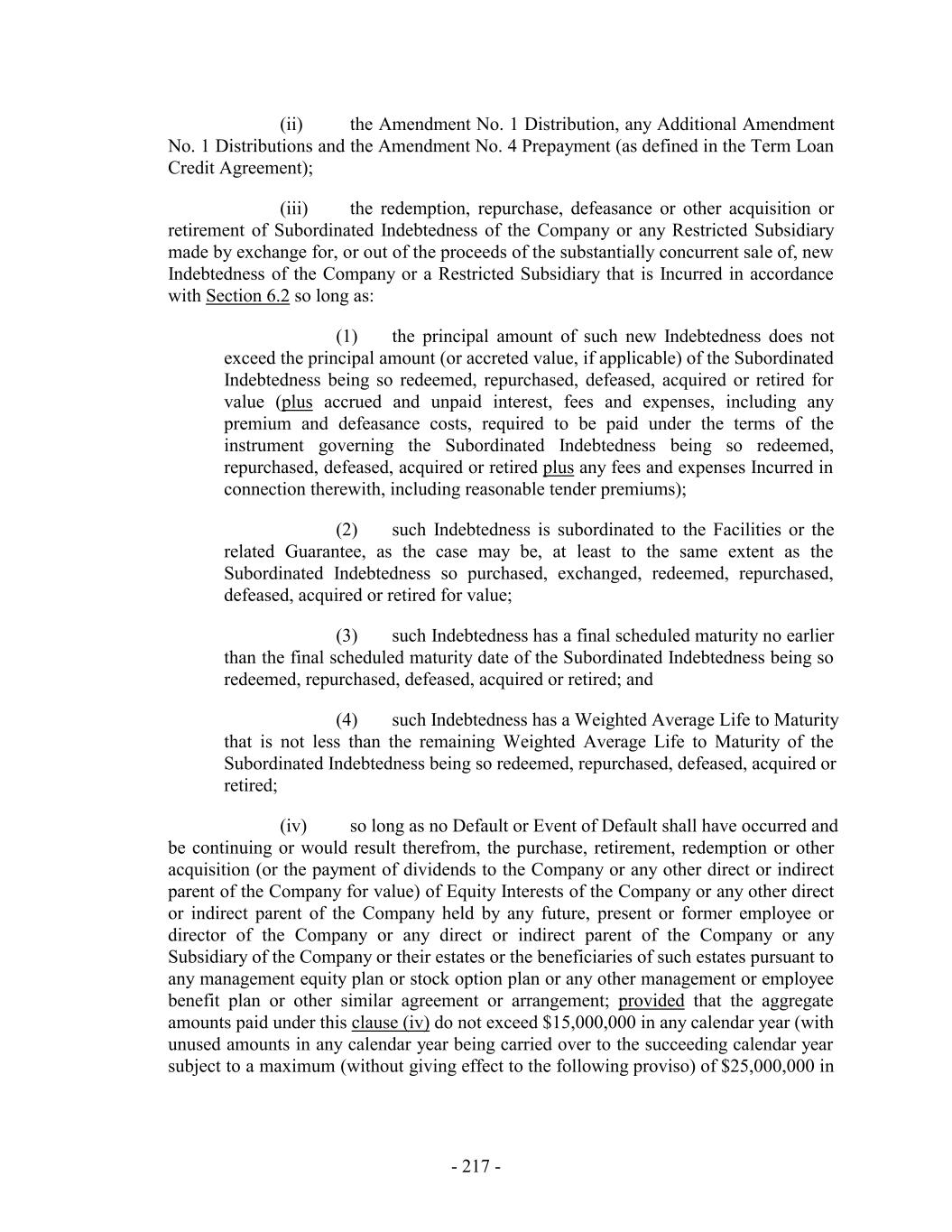 (ii) the Amendment No. 1 Distribution, any Additional Amendment No. 1 Distributions and the Amendment No. 4 Prepayment (as defined in the Term Loan Credit Agreement); (iii) the redemption, repurchase, defeasance or other acquisition or retirement of Subordinated Indebtedness of the Company or any Restricted Subsidiary made by exchange for, or out of the proceeds of the substantially concurrent sale of, new Indebtedness of the Company or a Restricted Subsidiary that is Incurred in accordance with Section 6.2 so long as: (1) the principal amount of such new Indebtedness does not exceed the principal amount (or accreted value, if applicable) of the Subordinated Indebtedness being so redeemed, repurchased, defeased, acquired or retired for value (plus accrued and unpaid interest, fees and expenses, including any premium and defeasance costs, required to be paid under the terms of the instrument governing the Subordinated Indebtedness being so redeemed, repurchased, defeased, acquired or retired plus any fees and expenses Incurred in connection therewith, including reasonable tender premiums); (2) such Indebtedness is subordinated to the Facilities or the related Guarantee, as the case may be, at least to the same extent as the Subordinated Indebtedness so purchased, exchanged, redeemed, repurchased, defeased, acquired or retired for value; (3) such Indebtedness has a final scheduled maturity no earlier than the final scheduled maturity date of the Subordinated Indebtedness being so redeemed, repurchased, defeased, acquired or retired; and (4) such Indebtedness has a Weighted Average Life to Maturity that is not less than the remaining Weighted Average Life to Maturity of the Subordinated Indebtedness being so redeemed, repurchased, defeased, acquired or retired; (iv) so long as no Default or Event of Default shall have occurred and be continuing or would result therefrom, the purchase, retirement, redemption or other acquisition (or the payment of dividends to the Company or any other direct or indirect parent of the Company for value) of Equity Interests of the Company or any other direct or indirect parent of the Company held by any future, present or former employee or director of the Company or any direct or indirect parent of the Company or any Subsidiary of the Company or their estates or the beneficiaries of such estates pursuant to any management equity plan or stock option plan or any other management or employee benefit plan or other similar agreement or arrangement; provided that the aggregate amounts paid under this clause (iv) do not exceed $15,000,000 in any calendar year (with unused amounts in any calendar year being carried over to the succeeding calendar year subject to a maximum (without giving effect to the following proviso) of $25,000,000 in - 217 -