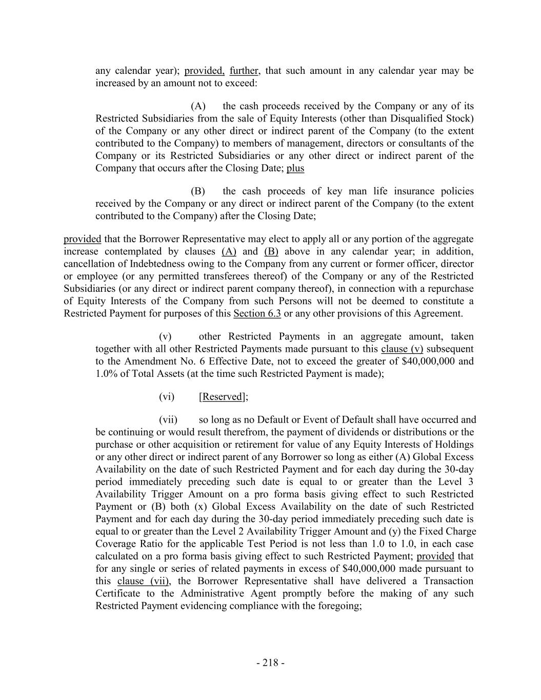any calendar year); provided, further, that such amount in any calendar year may be increased by an amount not to exceed: (A) the cash proceeds received by the Company or any of its Restricted Subsidiaries from the sale of Equity Interests (other than Disqualified Stock) of the Company or any other direct or indirect parent of the Company (to the extent contributed to the Company) to members of management, directors or consultants of the Company or its Restricted Subsidiaries or any other direct or indirect parent of the Company that occurs after the Closing Date; plus (B) the cash proceeds of key man life insurance policies received by the Company or any direct or indirect parent of the Company (to the extent contributed to the Company) after the Closing Date; provided that the Borrower Representative may elect to apply all or any portion of the aggregate increase contemplated by clauses (A) and (B) above in any calendar year; in addition, cancellation of Indebtedness owing to the Company from any current or former officer, director or employee (or any permitted transferees thereof) of the Company or any of the Restricted Subsidiaries (or any direct or indirect parent company thereof), in connection with a repurchase of Equity Interests of the Company from such Persons will not be deemed to constitute a Restricted Payment for purposes of this Section 6.3 or any other provisions of this Agreement. (v) other Restricted Payments in an aggregate amount, taken together with all other Restricted Payments made pursuant to this clause (v) subsequent to the Amendment No. 6 Effective Date, not to exceed the greater of $40,000,000 and 1.0% of Total Assets (at the time such Restricted Payment is made); (vi) [Reserved]; (vii) so long as no Default or Event of Default shall have occurred and be continuing or would result therefrom, the payment of dividends or distributions or the purchase or other acquisition or retirement for value of any Equity Interests of Holdings or any other direct or indirect parent of any Borrower so long as either (A) Global Excess Availability on the date of such Restricted Payment and for each day during the 30-day period immediately preceding such date is equal to or greater than the Level 3 Availability Trigger Amount on a pro forma basis giving effect to such Restricted Payment or (B) both (x) Global Excess Availability on the date of such Restricted Payment and for each day during the 30-day period immediately preceding such date is equal to or greater than the Level 2 Availability Trigger Amount and (y) the Fixed Charge Coverage Ratio for the applicable Test Period is not less than 1.0 to 1.0, in each case calculated on a pro forma basis giving effect to such Restricted Payment; provided that for any single or series of related payments in excess of $40,000,000 made pursuant to this clause (vii), the Borrower Representative shall have delivered a Transaction Certificate to the Administrative Agent promptly before the making of any such Restricted Payment evidencing compliance with the foregoing; - 218 -