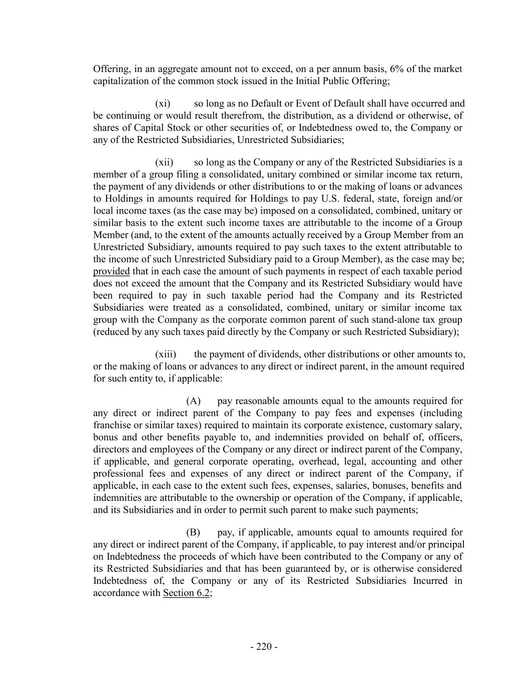 Offering, in an aggregate amount not to exceed, on a per annum basis, 6% of the market capitalization of the common stock issued in the Initial Public Offering; (xi) so long as no Default or Event of Default shall have occurred and be continuing or would result therefrom, the distribution, as a dividend or otherwise, of shares of Capital Stock or other securities of, or Indebtedness owed to, the Company or any of the Restricted Subsidiaries, Unrestricted Subsidiaries; (xii) so long as the Company or any of the Restricted Subsidiaries is a member of a group filing a consolidated, unitary combined or similar income tax return, the payment of any dividends or other distributions to or the making of loans or advances to Holdings in amounts required for Holdings to pay U.S. federal, state, foreign and/or local income taxes (as the case may be) imposed on a consolidated, combined, unitary or similar basis to the extent such income taxes are attributable to the income of a Group Member (and, to the extent of the amounts actually received by a Group Member from an Unrestricted Subsidiary, amounts required to pay such taxes to the extent attributable to the income of such Unrestricted Subsidiary paid to a Group Member), as the case may be; provided that in each case the amount of such payments in respect of each taxable period does not exceed the amount that the Company and its Restricted Subsidiary would have been required to pay in such taxable period had the Company and its Restricted Subsidiaries were treated as a consolidated, combined, unitary or similar income tax group with the Company as the corporate common parent of such stand-alone tax group (reduced by any such taxes paid directly by the Company or such Restricted Subsidiary); (xiii) the payment of dividends, other distributions or other amounts to, or the making of loans or advances to any direct or indirect parent, in the amount required for such entity to, if applicable: (A) pay reasonable amounts equal to the amounts required for any direct or indirect parent of the Company to pay fees and expenses (including franchise or similar taxes) required to maintain its corporate existence, customary salary, bonus and other benefits payable to, and indemnities provided on behalf of, officers, directors and employees of the Company or any direct or indirect parent of the Company, if applicable, and general corporate operating, overhead, legal, accounting and other professional fees and expenses of any direct or indirect parent of the Company, if applicable, in each case to the extent such fees, expenses, salaries, bonuses, benefits and indemnities are attributable to the ownership or operation of the Company, if applicable, and its Subsidiaries and in order to permit such parent to make such payments; (B) pay, if applicable, amounts equal to amounts required for any direct or indirect parent of the Company, if applicable, to pay interest and/or principal on Indebtedness the proceeds of which have been contributed to the Company or any of its Restricted Subsidiaries and that has been guaranteed by, or is otherwise considered Indebtedness of, the Company or any of its Restricted Subsidiaries Incurred in accordance with Section 6.2; - 220 -