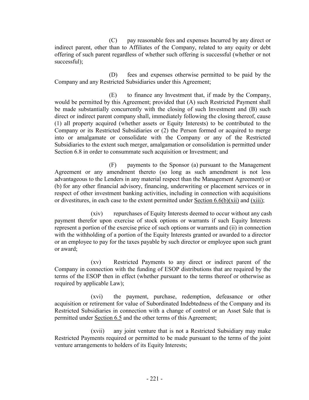 (C) pay reasonable fees and expenses Incurred by any direct or indirect parent, other than to Affiliates of the Company, related to any equity or debt offering of such parent regardless of whether such offering is successful (whether or not successful); (D) fees and expenses otherwise permitted to be paid by the Company and any Restricted Subsidiaries under this Agreement; (E) to finance any Investment that, if made by the Company, would be permitted by this Agreement; provided that (A) such Restricted Payment shall be made substantially concurrently with the closing of such Investment and (B) such direct or indirect parent company shall, immediately following the closing thereof, cause (1) all property acquired (whether assets or Equity Interests) to be contributed to the Company or its Restricted Subsidiaries or (2) the Person formed or acquired to merge into or amalgamate or consolidate with the Company or any of the Restricted Subsidiaries to the extent such merger, amalgamation or consolidation is permitted under Section 6.8 in order to consummate such acquisition or Investment; and (F) payments to the Sponsor (a) pursuant to the Management Agreement or any amendment thereto (so long as such amendment is not less advantageous to the Lenders in any material respect than the Management Agreement) or (b) for any other financial advisory, financing, underwriting or placement services or in respect of other investment banking activities, including in connection with acquisitions or divestitures, in each case to the extent permitted under Section 6.6(b)(xii) and (xiii); (xiv) repurchases of Equity Interests deemed to occur without any cash payment therefor upon exercise of stock options or warrants if such Equity Interests represent a portion of the exercise price of such options or warrants and (ii) in connection with the withholding of a portion of the Equity Interests granted or awarded to a director or an employee to pay for the taxes payable by such director or employee upon such grant or award; (xv) Restricted Payments to any direct or indirect parent of the Company in connection with the funding of ESOP distributions that are required by the terms of the ESOP then in effect (whether pursuant to the terms thereof or otherwise as required by applicable Law); (xvi) the payment, purchase, redemption, defeasance or other acquisition or retirement for value of Subordinated Indebtedness of the Company and its Restricted Subsidiaries in connection with a change of control or an Asset Sale that is permitted under Section 6.5 and the other terms of this Agreement; (xvii) any joint venture that is not a Restricted Subsidiary may make Restricted Payments required or permitted to be made pursuant to the terms of the joint venture arrangements to holders of its Equity Interests; - 221 -