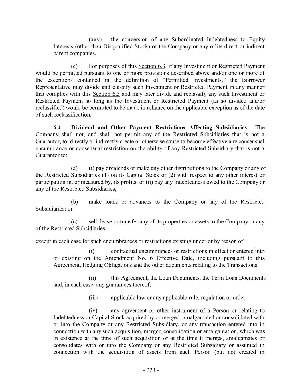 (xxv) the conversion of any Subordinated Indebtedness to Equity Interests (other than Disqualified Stock) of the Company or any of its direct or indirect parent companies. (c) For purposes of this Section 6.3, if any Investment or Restricted Payment would be permitted pursuant to one or more provisions described above and/or one or more of the exceptions contained in the definition of “Permitted Investments,” the Borrower Representative may divide and classify such Investment or Restricted Payment in any manner that complies with this Section 6.3 and may later divide and reclassify any such Investment or Restricted Payment so long as the Investment or Restricted Payment (as so divided and/or reclassified) would be permitted to be made in reliance on the applicable exception as of the date of such reclassification. 6.4 Dividend and Other Payment Restrictions Affecting Subsidiaries. The Company shall not, and shall not permit any of the Restricted Subsidiaries that is not a Guarantor, to, directly or indirectly create or otherwise cause to become effective any consensual encumbrance or consensual restriction on the ability of any Restricted Subsidiary that is not a Guarantor to: (a) (i) pay dividends or make any other distributions to the Company or any of the Restricted Subsidiaries (1) on its Capital Stock or (2) with respect to any other interest or participation in, or measured by, its profits; or (ii) pay any Indebtedness owed to the Company or any of the Restricted Subsidiaries; (b) make loans or advances to the Company or any of the Restricted Subsidiaries; or (c) sell, lease or transfer any of its properties or assets to the Company or any of the Restricted Subsidiaries; except in each case for such encumbrances or restrictions existing under or by reason of: (i) contractual encumbrances or restrictions in effect or entered into or existing on the Amendment No. 6 Effective Date, including pursuant to this Agreement, Hedging Obligations and the other documents relating to the Transactions; (ii) this Agreement, the Loan Documents, the Term Loan Documents and, in each case, any guarantees thereof; (iii) applicable law or any applicable rule, regulation or order; (iv) any agreement or other instrument of a Person or relating to Indebtedness or Capital Stock acquired by or merged, amalgamated or consolidated with or into the Company or any Restricted Subsidiary, or any transaction entered into in connection with any such acquisition, merger, consolidation or amalgamation, which was in existence at the time of such acquisition or at the time it merges, amalgamates or consolidates with or into the Company or any Restricted Subsidiary or assumed in connection with the acquisition of assets from such Person (but not created in - 223 -