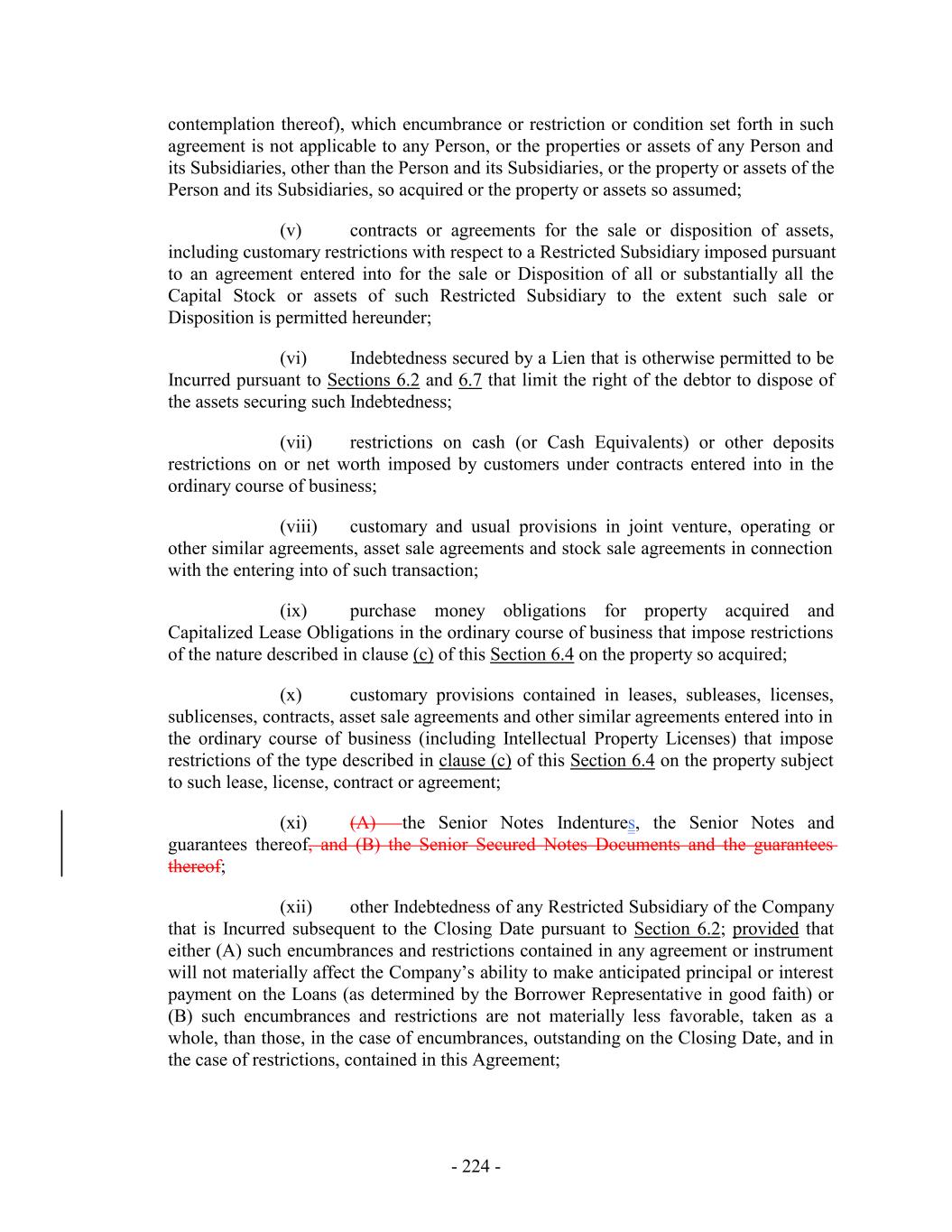 contemplation thereof), which encumbrance or restriction or condition set forth in such agreement is not applicable to any Person, or the properties or assets of any Person and its Subsidiaries, other than the Person and its Subsidiaries, or the property or assets of the Person and its Subsidiaries, so acquired or the property or assets so assumed; (v) contracts or agreements for the sale or disposition of assets, including customary restrictions with respect to a Restricted Subsidiary imposed pursuant to an agreement entered into for the sale or Disposition of all or substantially all the Capital Stock or assets of such Restricted Subsidiary to the extent such sale or Disposition is permitted hereunder; (vi) Indebtedness secured by a Lien that is otherwise permitted to be Incurred pursuant to Sections 6.2 and 6.7 that limit the right of the debtor to dispose of the assets securing such Indebtedness; (vii) restrictions on cash (or Cash Equivalents) or other deposits restrictions on or net worth imposed by customers under contracts entered into in the ordinary course of business; (viii) customary and usual provisions in joint venture, operating or other similar agreements, asset sale agreements and stock sale agreements in connection with the entering into of such transaction; (ix) purchase money obligations for property acquired and Capitalized Lease Obligations in the ordinary course of business that impose restrictions of the nature described in clause (c) of this Section 6.4 on the property so acquired; (x) customary provisions contained in leases, subleases, licenses, sublicenses, contracts, asset sale agreements and other similar agreements entered into in the ordinary course of business (including Intellectual Property Licenses) that impose restrictions of the type described in clause (c) of this Section 6.4 on the property subject to such lease, license, contract or agreement; (xi) (A) the Senior Notes Indentures, the Senior Notes and guarantees thereof, and (B) the Senior Secured Notes Documents and the guarantees thereof; (xii) other Indebtedness of any Restricted Subsidiary of the Company that is Incurred subsequent to the Closing Date pursuant to Section 6.2; provided that either (A) such encumbrances and restrictions contained in any agreement or instrument will not materially affect the Company’s ability to make anticipated principal or interest payment on the Loans (as determined by the Borrower Representative in good faith) or (B) such encumbrances and restrictions are not materially less favorable, taken as a whole, than those, in the case of encumbrances, outstanding on the Closing Date, and in the case of restrictions, contained in this Agreement; - 224 -
