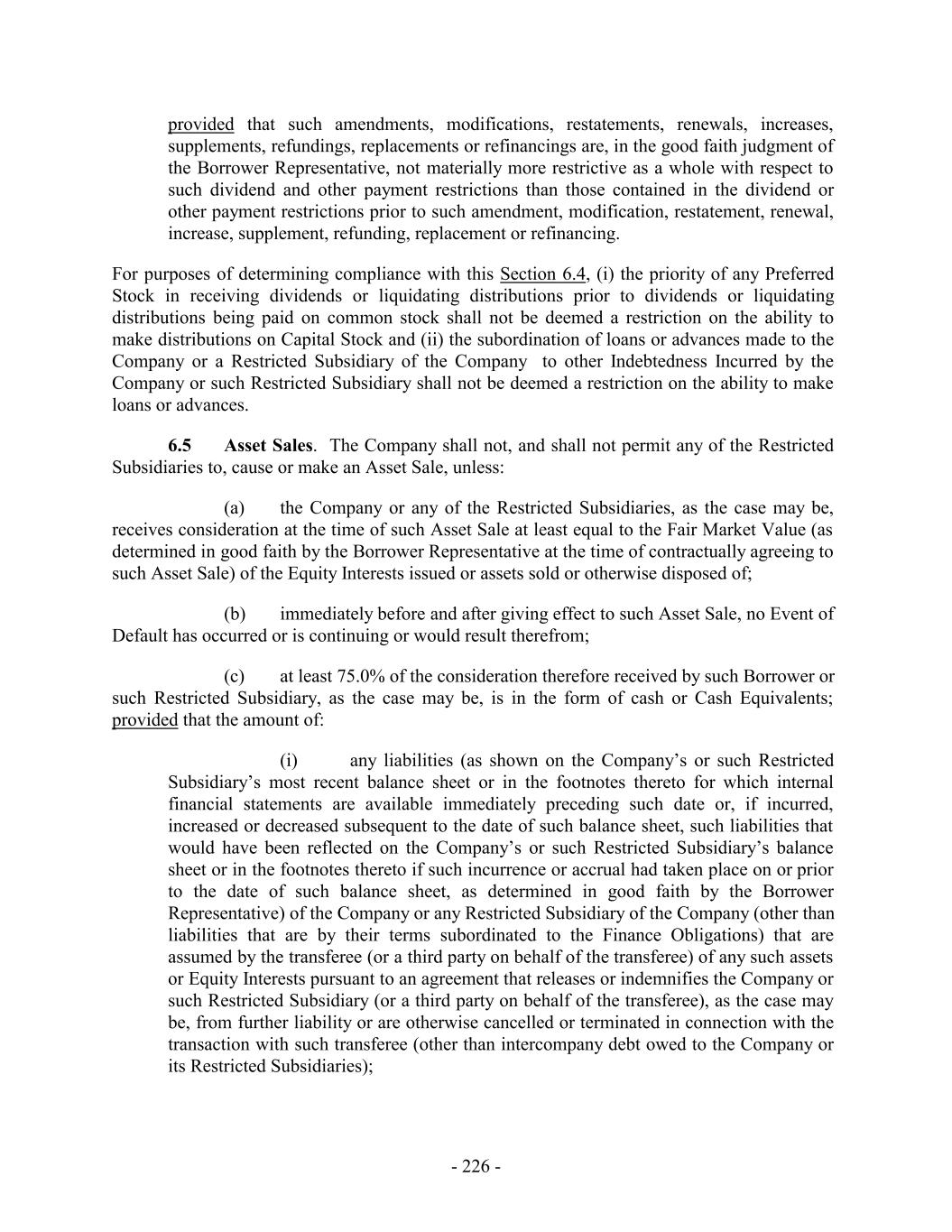 provided that such amendments, modifications, restatements, renewals, increases, supplements, refundings, replacements or refinancings are, in the good faith judgment of the Borrower Representative, not materially more restrictive as a whole with respect to such dividend and other payment restrictions than those contained in the dividend or other payment restrictions prior to such amendment, modification, restatement, renewal, increase, supplement, refunding, replacement or refinancing. For purposes of determining compliance with this Section 6.4, (i) the priority of any Preferred Stock in receiving dividends or liquidating distributions prior to dividends or liquidating distributions being paid on common stock shall not be deemed a restriction on the ability to make distributions on Capital Stock and (ii) the subordination of loans or advances made to the Company or a Restricted Subsidiary of the Company to other Indebtedness Incurred by the Company or such Restricted Subsidiary shall not be deemed a restriction on the ability to make loans or advances. 6.5 Asset Sales. The Company shall not, and shall not permit any of the Restricted Subsidiaries to, cause or make an Asset Sale, unless: (a) the Company or any of the Restricted Subsidiaries, as the case may be, receives consideration at the time of such Asset Sale at least equal to the Fair Market Value (as determined in good faith by the Borrower Representative at the time of contractually agreeing to such Asset Sale) of the Equity Interests issued or assets sold or otherwise disposed of; (b) immediately before and after giving effect to such Asset Sale, no Event of Default has occurred or is continuing or would result therefrom; (c) at least 75.0% of the consideration therefore received by such Borrower or such Restricted Subsidiary, as the case may be, is in the form of cash or Cash Equivalents; provided that the amount of: (i) any liabilities (as shown on the Company’s or such Restricted Subsidiary’s most recent balance sheet or in the footnotes thereto for which internal financial statements are available immediately preceding such date or, if incurred, increased or decreased subsequent to the date of such balance sheet, such liabilities that would have been reflected on the Company’s or such Restricted Subsidiary’s balance sheet or in the footnotes thereto if such incurrence or accrual had taken place on or prior to the date of such balance sheet, as determined in good faith by the Borrower Representative) of the Company or any Restricted Subsidiary of the Company (other than liabilities that are by their terms subordinated to the Finance Obligations) that are assumed by the transferee (or a third party on behalf of the transferee) of any such assets or Equity Interests pursuant to an agreement that releases or indemnifies the Company or such Restricted Subsidiary (or a third party on behalf of the transferee), as the case may be, from further liability or are otherwise cancelled or terminated in connection with the transaction with such transferee (other than intercompany debt owed to the Company or its Restricted Subsidiaries); - 226 -