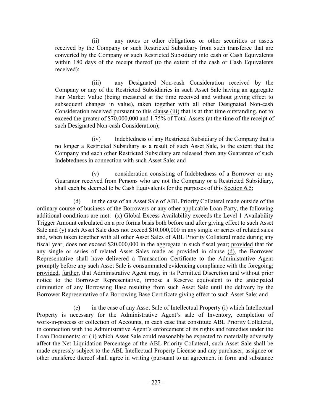 (ii) any notes or other obligations or other securities or assets received by the Company or such Restricted Subsidiary from such transferee that are converted by the Company or such Restricted Subsidiary into cash or Cash Equivalents within 180 days of the receipt thereof (to the extent of the cash or Cash Equivalents received); (iii) any Designated Non-cash Consideration received by the Company or any of the Restricted Subsidiaries in such Asset Sale having an aggregate Fair Market Value (being measured at the time received and without giving effect to subsequent changes in value), taken together with all other Designated Non-cash Consideration received pursuant to this clause (iii) that is at that time outstanding, not to exceed the greater of $70,000,000 and 1.75% of Total Assets (at the time of the receipt of such Designated Non-cash Consideration); (iv) Indebtedness of any Restricted Subsidiary of the Company that is no longer a Restricted Subsidiary as a result of such Asset Sale, to the extent that the Company and each other Restricted Subsidiary are released from any Guarantee of such Indebtedness in connection with such Asset Sale; and (v) consideration consisting of Indebtedness of a Borrower or any Guarantor received from Persons who are not the Company or a Restricted Subsidiary, shall each be deemed to be Cash Equivalents for the purposes of this Section 6.5; (d) in the case of an Asset Sale of ABL Priority Collateral made outside of the ordinary course of business of the Borrowers or any other applicable Loan Party, the following additional conditions are met: (x) Global Excess Availability exceeds the Level 1 Availability Trigger Amount calculated on a pro forma basis both before and after giving effect to such Asset Sale and (y) such Asset Sale does not exceed $10,000,000 in any single or series of related sales and, when taken together with all other Asset Sales of ABL Priority Collateral made during any fiscal year, does not exceed $20,000,000 in the aggregate in such fiscal year; provided that for any single or series of related Asset Sales made as provided in clause (d), the Borrower Representative shall have delivered a Transaction Certificate to the Administrative Agent promptly before any such Asset Sale is consummated evidencing compliance with the foregoing; provided, further, that Administrative Agent may, in its Permitted Discretion and without prior notice to the Borrower Representative, impose a Reserve equivalent to the anticipated diminution of any Borrowing Base resulting from such Asset Sale until the delivery by the Borrower Representative of a Borrowing Base Certificate giving effect to such Asset Sale; and (e) in the case of any Asset Sale of Intellectual Property (i) which Intellectual Property is necessary for the Administrative Agent’s sale of Inventory, completion of work-in-process or collection of Accounts, in each case that constitute ABL Priority Collateral, in connection with the Administrative Agent’s enforcement of its rights and remedies under the Loan Documents; or (ii) which Asset Sale could reasonably be expected to materially adversely affect the Net Liquidation Percentage of the ABL Priority Collateral, such Asset Sale shall be made expressly subject to the ABL Intellectual Property License and any purchaser, assignee or other transferee thereof shall agree in writing (pursuant to an agreement in form and substance - 227 -