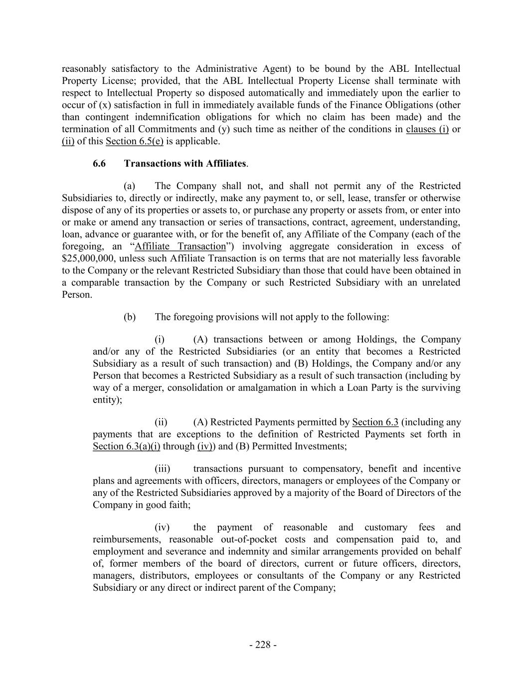 reasonably satisfactory to the Administrative Agent) to be bound by the ABL Intellectual Property License; provided, that the ABL Intellectual Property License shall terminate with respect to Intellectual Property so disposed automatically and immediately upon the earlier to occur of (x) satisfaction in full in immediately available funds of the Finance Obligations (other than contingent indemnification obligations for which no claim has been made) and the termination of all Commitments and (y) such time as neither of the conditions in clauses (i) or (ii) of this Section 6.5(e) is applicable. 6.6 Transactions with Affiliates. (a) The Company shall not, and shall not permit any of the Restricted Subsidiaries to, directly or indirectly, make any payment to, or sell, lease, transfer or otherwise dispose of any of its properties or assets to, or purchase any property or assets from, or enter into or make or amend any transaction or series of transactions, contract, agreement, understanding, loan, advance or guarantee with, or for the benefit of, any Affiliate of the Company (each of the foregoing, an “Affiliate Transaction”) involving aggregate consideration in excess of $25,000,000, unless such Affiliate Transaction is on terms that are not materially less favorable to the Company or the relevant Restricted Subsidiary than those that could have been obtained in a comparable transaction by the Company or such Restricted Subsidiary with an unrelated Person. (b) The foregoing provisions will not apply to the following: (i) (A) transactions between or among Holdings, the Company and/or any of the Restricted Subsidiaries (or an entity that becomes a Restricted Subsidiary as a result of such transaction) and (B) Holdings, the Company and/or any Person that becomes a Restricted Subsidiary as a result of such transaction (including by way of a merger, consolidation or amalgamation in which a Loan Party is the surviving entity); (ii) (A) Restricted Payments permitted by Section 6.3 (including any payments that are exceptions to the definition of Restricted Payments set forth in Section 6.3(a)(i) through (iv)) and (B) Permitted Investments; (iii) transactions pursuant to compensatory, benefit and incentive plans and agreements with officers, directors, managers or employees of the Company or any of the Restricted Subsidiaries approved by a majority of the Board of Directors of the Company in good faith; (iv) the payment of reasonable and customary fees and reimbursements, reasonable out-of-pocket costs and compensation paid to, and employment and severance and indemnity and similar arrangements provided on behalf of, former members of the board of directors, current or future officers, directors, managers, distributors, employees or consultants of the Company or any Restricted Subsidiary or any direct or indirect parent of the Company; - 228 -