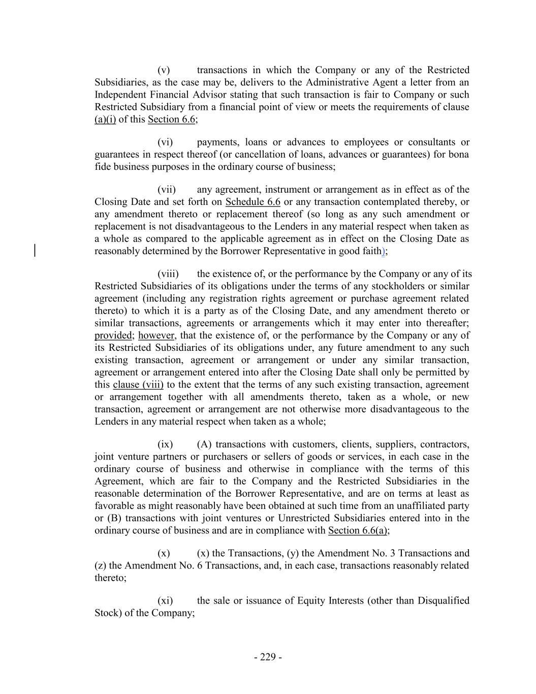 (v) transactions in which the Company or any of the Restricted Subsidiaries, as the case may be, delivers to the Administrative Agent a letter from an Independent Financial Advisor stating that such transaction is fair to Company or such Restricted Subsidiary from a financial point of view or meets the requirements of clause (a)(i) of this Section 6.6; (vi) payments, loans or advances to employees or consultants or guarantees in respect thereof (or cancellation of loans, advances or guarantees) for bona fide business purposes in the ordinary course of business; (vii) any agreement, instrument or arrangement as in effect as of the Closing Date and set forth on Schedule 6.6 or any transaction contemplated thereby, or any amendment thereto or replacement thereof (so long as any such amendment or replacement is not disadvantageous to the Lenders in any material respect when taken as a whole as compared to the applicable agreement as in effect on the Closing Date as reasonably determined by the Borrower Representative in good faith); (viii) the existence of, or the performance by the Company or any of its Restricted Subsidiaries of its obligations under the terms of any stockholders or similar agreement (including any registration rights agreement or purchase agreement related thereto) to which it is a party as of the Closing Date, and any amendment thereto or similar transactions, agreements or arrangements which it may enter into thereafter; provided; however, that the existence of, or the performance by the Company or any of its Restricted Subsidiaries of its obligations under, any future amendment to any such existing transaction, agreement or arrangement or under any similar transaction, agreement or arrangement entered into after the Closing Date shall only be permitted by this clause (viii) to the extent that the terms of any such existing transaction, agreement or arrangement together with all amendments thereto, taken as a whole, or new transaction, agreement or arrangement are not otherwise more disadvantageous to the Lenders in any material respect when taken as a whole; (ix) (A) transactions with customers, clients, suppliers, contractors, joint venture partners or purchasers or sellers of goods or services, in each case in the ordinary course of business and otherwise in compliance with the terms of this Agreement, which are fair to the Company and the Restricted Subsidiaries in the reasonable determination of the Borrower Representative, and are on terms at least as favorable as might reasonably have been obtained at such time from an unaffiliated party or (B) transactions with joint ventures or Unrestricted Subsidiaries entered into in the ordinary course of business and are in compliance with Section 6.6(a); (x) (x) the Transactions, (y) the Amendment No. 3 Transactions and (z) the Amendment No. 6 Transactions, and, in each case, transactions reasonably related thereto; (xi) the sale or issuance of Equity Interests (other than Disqualified Stock) of the Company; - 229 -