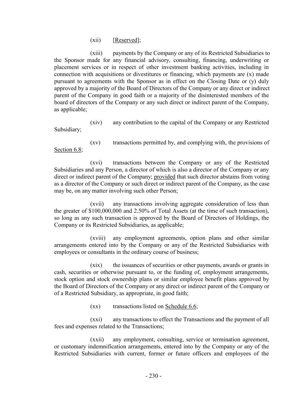 (xii) [Reserved]; (xiii) payments by the Company or any of its Restricted Subsidiaries to the Sponsor made for any financial advisory, consulting, financing, underwriting or placement services or in respect of other investment banking activities, including in connection with acquisitions or divestitures or financing, which payments are (x) made pursuant to agreements with the Sponsor as in effect on the Closing Date or (y) duly approved by a majority of the Board of Directors of the Company or any direct or indirect parent of the Company in good faith or a majority of the disinterested members of the board of directors of the Company or any such direct or indirect parent of the Company, as applicable; (xiv) any contribution to the capital of the Company or any Restricted Subsidiary; (xv) transactions permitted by, and complying with, the provisions of Section 6.8; (xvi) transactions between the Company or any of the Restricted Subsidiaries and any Person, a director of which is also a director of the Company or any direct or indirect parent of the Company; provided that such director abstains from voting as a director of the Company or such direct or indirect parent of the Company, as the case may be, on any matter involving such other Person; (xvii) any transactions involving aggregate consideration of less than the greater of $100,000,000 and 2.50% of Total Assets (at the time of such transaction), so long as any such transaction is approved by the Board of Directors of Holdings, the Company or its Restricted Subsidiaries, as applicable; (xviii) any employment agreements, option plans and other similar arrangements entered into by the Company or any of the Restricted Subsidiaries with employees or consultants in the ordinary course of business; (xix) the issuances of securities or other payments, awards or grants in cash, securities or otherwise pursuant to, or the funding of, employment arrangements, stock option and stock ownership plans or similar employee benefit plans approved by the Board of Directors of the Company or any direct or indirect parent of the Company or of a Restricted Subsidiary, as appropriate, in good faith; (xx) transactions listed on Schedule 6.6; (xxi) any transactions to effect the Transactions and the payment of all fees and expenses related to the Transactions; (xxii) any employment, consulting, service or termination agreement, or customary indemnification arrangements, entered into by the Company or any of the Restricted Subsidiaries with current, former or future officers and employees of the - 230 -