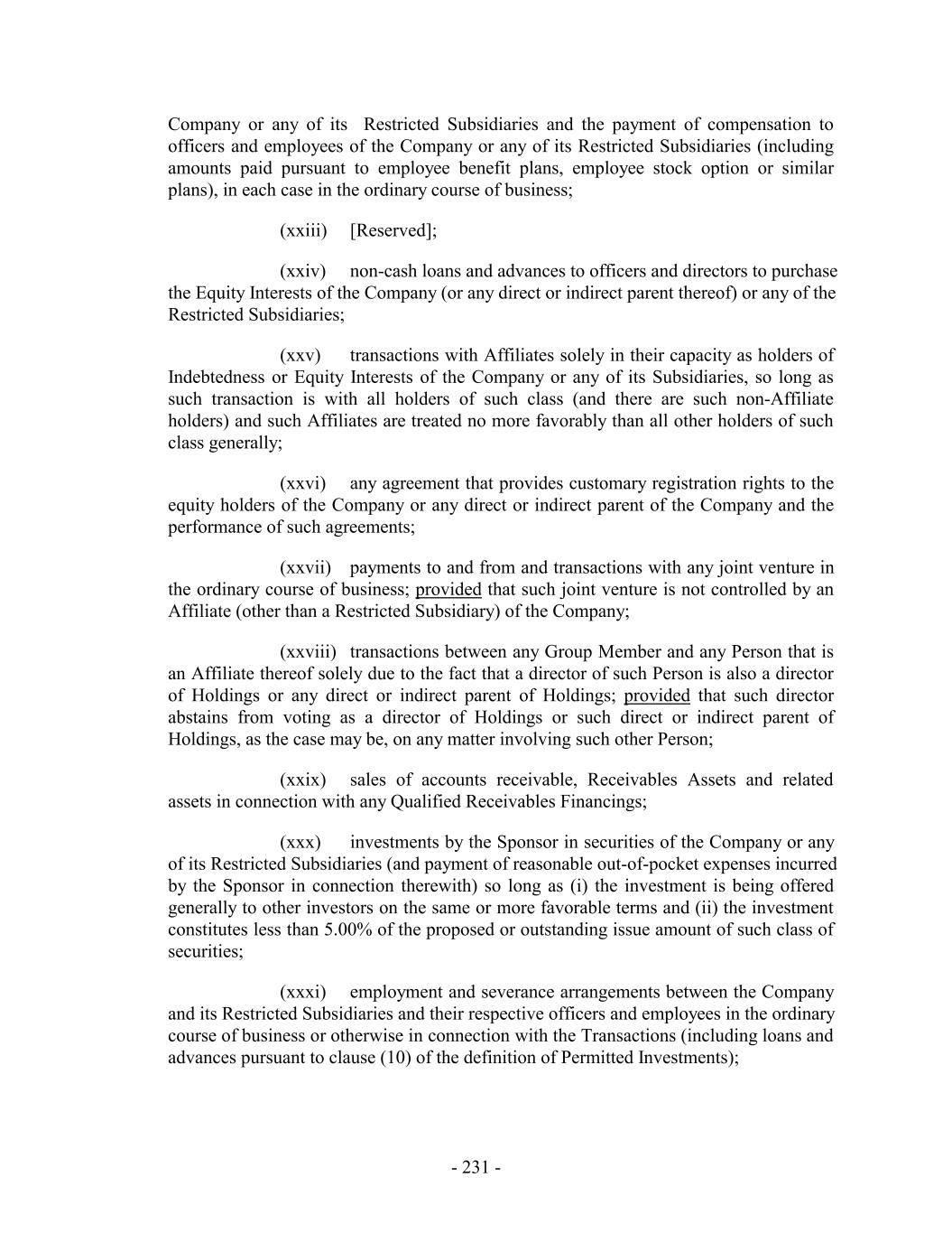 Company or any of its Restricted Subsidiaries and the payment of compensation to officers and employees of the Company or any of its Restricted Subsidiaries (including amounts paid pursuant to employee benefit plans, employee stock option or similar plans), in each case in the ordinary course of business; (xxiii) [Reserved]; (xxiv) non-cash loans and advances to officers and directors to purchase the Equity Interests of the Company (or any direct or indirect parent thereof) or any of the Restricted Subsidiaries; (xxv) transactions with Affiliates solely in their capacity as holders of Indebtedness or Equity Interests of the Company or any of its Subsidiaries, so long as such transaction is with all holders of such class (and there are such non-Affiliate holders) and such Affiliates are treated no more favorably than all other holders of such class generally; (xxvi) any agreement that provides customary registration rights to the equity holders of the Company or any direct or indirect parent of the Company and the performance of such agreements; (xxvii) payments to and from and transactions with any joint venture in the ordinary course of business; provided that such joint venture is not controlled by an Affiliate (other than a Restricted Subsidiary) of the Company; (xxviii) transactions between any Group Member and any Person that is an Affiliate thereof solely due to the fact that a director of such Person is also a director of Holdings or any direct or indirect parent of Holdings; provided that such director abstains from voting as a director of Holdings or such direct or indirect parent of Holdings, as the case may be, on any matter involving such other Person; (xxix) sales of accounts receivable, Receivables Assets and related assets in connection with any Qualified Receivables Financings; (xxx) investments by the Sponsor in securities of the Company or any of its Restricted Subsidiaries (and payment of reasonable out-of-pocket expenses incurred by the Sponsor in connection therewith) so long as (i) the investment is being offered generally to other investors on the same or more favorable terms and (ii) the investment constitutes less than 5.00% of the proposed or outstanding issue amount of such class of securities; (xxxi) employment and severance arrangements between the Company and its Restricted Subsidiaries and their respective officers and employees in the ordinary course of business or otherwise in connection with the Transactions (including loans and advances pursuant to clause (10) of the definition of Permitted Investments); - 231 -