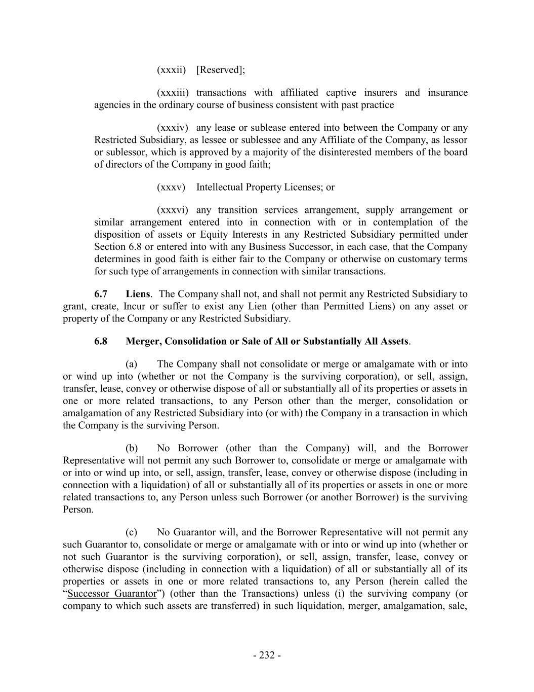 (xxxii) [Reserved]; (xxxiii) transactions with affiliated captive insurers and insurance agencies in the ordinary course of business consistent with past practice (xxxiv) any lease or sublease entered into between the Company or any Restricted Subsidiary, as lessee or sublessee and any Affiliate of the Company, as lessor or sublessor, which is approved by a majority of the disinterested members of the board of directors of the Company in good faith; (xxxv) Intellectual Property Licenses; or (xxxvi) any transition services arrangement, supply arrangement or similar arrangement entered into in connection with or in contemplation of the disposition of assets or Equity Interests in any Restricted Subsidiary permitted under Section 6.8 or entered into with any Business Successor, in each case, that the Company determines in good faith is either fair to the Company or otherwise on customary terms for such type of arrangements in connection with similar transactions. 6.7 Liens. The Company shall not, and shall not permit any Restricted Subsidiary to grant, create, Incur or suffer to exist any Lien (other than Permitted Liens) on any asset or property of the Company or any Restricted Subsidiary. 6.8 Merger, Consolidation or Sale of All or Substantially All Assets. (a) The Company shall not consolidate or merge or amalgamate with or into or wind up into (whether or not the Company is the surviving corporation), or sell, assign, transfer, lease, convey or otherwise dispose of all or substantially all of its properties or assets in one or more related transactions, to any Person other than the merger, consolidation or amalgamation of any Restricted Subsidiary into (or with) the Company in a transaction in which the Company is the surviving Person. (b) No Borrower (other than the Company) will, and the Borrower Representative will not permit any such Borrower to, consolidate or merge or amalgamate with or into or wind up into, or sell, assign, transfer, lease, convey or otherwise dispose (including in connection with a liquidation) of all or substantially all of its properties or assets in one or more related transactions to, any Person unless such Borrower (or another Borrower) is the surviving Person. (c) No Guarantor will, and the Borrower Representative will not permit any such Guarantor to, consolidate or merge or amalgamate with or into or wind up into (whether or not such Guarantor is the surviving corporation), or sell, assign, transfer, lease, convey or otherwise dispose (including in connection with a liquidation) of all or substantially all of its properties or assets in one or more related transactions to, any Person (herein called the “Successor Guarantor”) (other than the Transactions) unless (i) the surviving company (or company to which such assets are transferred) in such liquidation, merger, amalgamation, sale, - 232 -