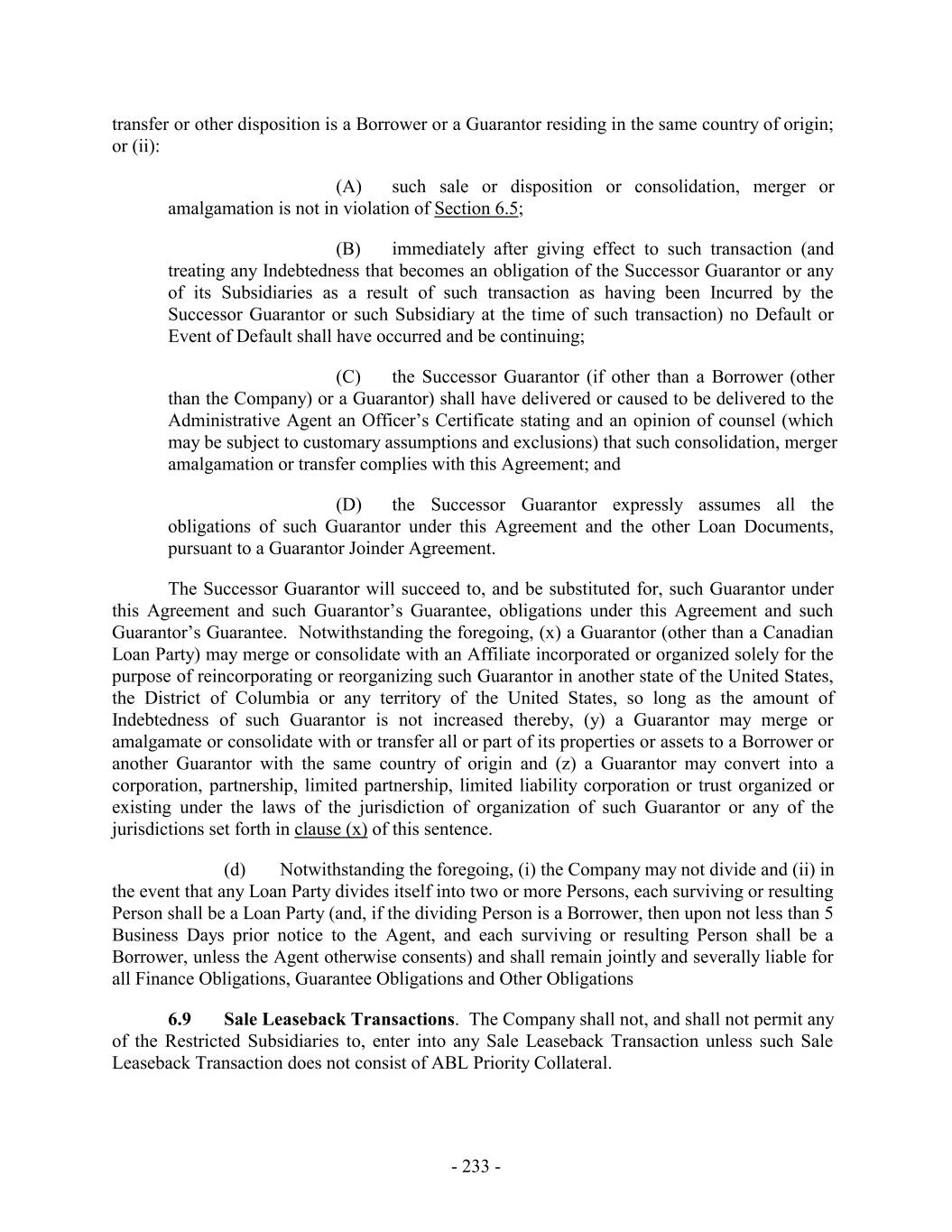 transfer or other disposition is a Borrower or a Guarantor residing in the same country of origin; or (ii): (A) such sale or disposition or consolidation, merger or amalgamation is not in violation of Section 6.5; (B) immediately after giving effect to such transaction (and treating any Indebtedness that becomes an obligation of the Successor Guarantor or any of its Subsidiaries as a result of such transaction as having been Incurred by the Successor Guarantor or such Subsidiary at the time of such transaction) no Default or Event of Default shall have occurred and be continuing; (C) the Successor Guarantor (if other than a Borrower (other than the Company) or a Guarantor) shall have delivered or caused to be delivered to the Administrative Agent an Officer’s Certificate stating and an opinion of counsel (which may be subject to customary assumptions and exclusions) that such consolidation, merger amalgamation or transfer complies with this Agreement; and (D) the Successor Guarantor expressly assumes all the obligations of such Guarantor under this Agreement and the other Loan Documents, pursuant to a Guarantor Joinder Agreement. The Successor Guarantor will succeed to, and be substituted for, such Guarantor under this Agreement and such Guarantor’s Guarantee, obligations under this Agreement and such Guarantor’s Guarantee. Notwithstanding the foregoing, (x) a Guarantor (other than a Canadian Loan Party) may merge or consolidate with an Affiliate incorporated or organized solely for the purpose of reincorporating or reorganizing such Guarantor in another state of the United States, the District of Columbia or any territory of the United States, so long as the amount of Indebtedness of such Guarantor is not increased thereby, (y) a Guarantor may merge or amalgamate or consolidate with or transfer all or part of its properties or assets to a Borrower or another Guarantor with the same country of origin and (z) a Guarantor may convert into a corporation, partnership, limited partnership, limited liability corporation or trust organized or existing under the laws of the jurisdiction of organization of such Guarantor or any of the jurisdictions set forth in clause (x) of this sentence. (d) Notwithstanding the foregoing, (i) the Company may not divide and (ii) in the event that any Loan Party divides itself into two or more Persons, each surviving or resulting Person shall be a Loan Party (and, if the dividing Person is a Borrower, then upon not less than 5 Business Days prior notice to the Agent, and each surviving or resulting Person shall be a Borrower, unless the Agent otherwise consents) and shall remain jointly and severally liable for all Finance Obligations, Guarantee Obligations and Other Obligations 6.9 Sale Leaseback Transactions. The Company shall not, and shall not permit any of the Restricted Subsidiaries to, enter into any Sale Leaseback Transaction unless such Sale Leaseback Transaction does not consist of ABL Priority Collateral. - 233 -