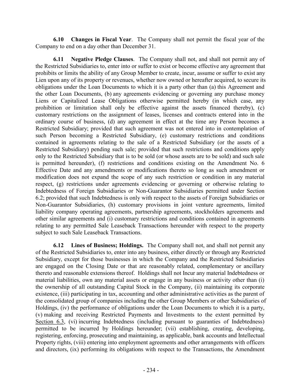 6.10 Changes in Fiscal Year. The Company shall not permit the fiscal year of the Company to end on a day other than December 31. 6.11 Negative Pledge Clauses. The Company shall not, and shall not permit any of the Restricted Subsidiaries to, enter into or suffer to exist or become effective any agreement that prohibits or limits the ability of any Group Member to create, incur, assume or suffer to exist any Lien upon any of its property or revenues, whether now owned or hereafter acquired, to secure its obligations under the Loan Documents to which it is a party other than (a) this Agreement and the other Loan Documents, (b) any agreements evidencing or governing any purchase money Liens or Capitalized Lease Obligations otherwise permitted hereby (in which case, any prohibition or limitation shall only be effective against the assets financed thereby), (c) customary restrictions on the assignment of leases, licenses and contracts entered into in the ordinary course of business, (d) any agreement in effect at the time any Person becomes a Restricted Subsidiary; provided that such agreement was not entered into in contemplation of such Person becoming a Restricted Subsidiary, (e) customary restrictions and conditions contained in agreements relating to the sale of a Restricted Subsidiary (or the assets of a Restricted Subsidiary) pending such sale; provided that such restrictions and conditions apply only to the Restricted Subsidiary that is to be sold (or whose assets are to be sold) and such sale is permitted hereunder), (f) restrictions and conditions existing on the Amendment No. 6 Effective Date and any amendments or modifications thereto so long as such amendment or modification does not expand the scope of any such restriction or condition in any material respect, (g) restrictions under agreements evidencing or governing or otherwise relating to Indebtedness of Foreign Subsidiaries or Non-Guarantor Subsidiaries permitted under Section 6.2; provided that such Indebtedness is only with respect to the assets of Foreign Subsidiaries or Non-Guarantor Subsidiaries, (h) customary provisions in joint venture agreements, limited liability company operating agreements, partnership agreements, stockholders agreements and other similar agreements and (i) customary restrictions and conditions contained in agreements relating to any permitted Sale Leaseback Transactions hereunder with respect to the property subject to such Sale Leaseback Transactions. 6.12 Lines of Business; Holdings. The Company shall not, and shall not permit any of the Restricted Subsidiaries to, enter into any business, either directly or through any Restricted Subsidiary, except for those businesses in which the Company and the Restricted Subsidiaries are engaged on the Closing Date or that are reasonably related, complementary or ancillary thereto and reasonable extensions thereof. Holdings shall not Incur any material Indebtedness or material liabilities, own any material assets or engage in any business or activity other than (i) the ownership of all outstanding Capital Stock in the Company, (ii) maintaining its corporate existence, (iii) participating in tax, accounting and other administrative activities as the parent of the consolidated group of companies including the other Group Members or other Subsidiaries of Holdings, (iv) the performance of obligations under the Loan Documents to which it is a party, (v) making and receiving Restricted Payments and Investments to the extent permitted by Section 6.3, (vi) incurring Indebtedness (including pursuant to guaranties of Indebtedness) permitted to be incurred by Holdings hereunder; (vii) establishing, creating, developing, registering, enforcing, prosecuting and maintaining, as applicable, bank accounts and Intellectual Property rights, (viii) entering into employment agreements and other arrangements with officers and directors, (ix) performing its obligations with respect to the Transactions, the Amendment - 234 -