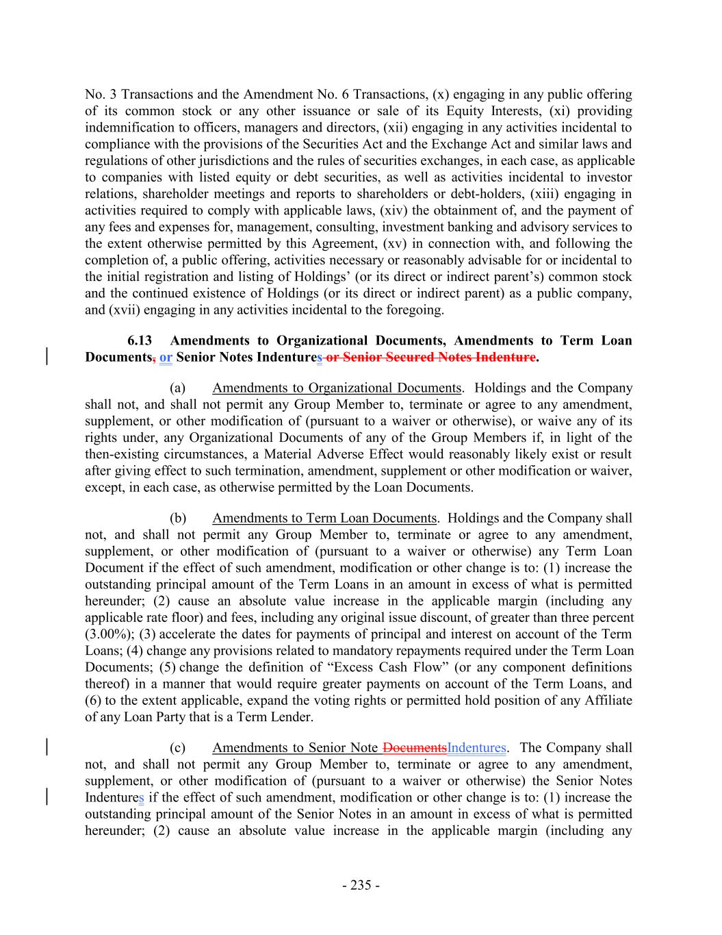 No. 3 Transactions and the Amendment No. 6 Transactions, (x) engaging in any public offering of its common stock or any other issuance or sale of its Equity Interests, (xi) providing indemnification to officers, managers and directors, (xii) engaging in any activities incidental to compliance with the provisions of the Securities Act and the Exchange Act and similar laws and regulations of other jurisdictions and the rules of securities exchanges, in each case, as applicable to companies with listed equity or debt securities, as well as activities incidental to investor relations, shareholder meetings and reports to shareholders or debt-holders, (xiii) engaging in activities required to comply with applicable laws, (xiv) the obtainment of, and the payment of any fees and expenses for, management, consulting, investment banking and advisory services to the extent otherwise permitted by this Agreement, (xv) in connection with, and following the completion of, a public offering, activities necessary or reasonably advisable for or incidental to the initial registration and listing of Holdings’ (or its direct or indirect parent’s) common stock and the continued existence of Holdings (or its direct or indirect parent) as a public company, and (xvii) engaging in any activities incidental to the foregoing. 6.13 Amendments to Organizational Documents, Amendments to Term Loan Documents, or Senior Notes Indentures or Senior Secured Notes Indenture. (a) Amendments to Organizational Documents. Holdings and the Company shall not, and shall not permit any Group Member to, terminate or agree to any amendment, supplement, or other modification of (pursuant to a waiver or otherwise), or waive any of its rights under, any Organizational Documents of any of the Group Members if, in light of the then-existing circumstances, a Material Adverse Effect would reasonably likely exist or result after giving effect to such termination, amendment, supplement or other modification or waiver, except, in each case, as otherwise permitted by the Loan Documents. (b) Amendments to Term Loan Documents. Holdings and the Company shall not, and shall not permit any Group Member to, terminate or agree to any amendment, supplement, or other modification of (pursuant to a waiver or otherwise) any Term Loan Document if the effect of such amendment, modification or other change is to: (1) increase the outstanding principal amount of the Term Loans in an amount in excess of what is permitted hereunder; (2) cause an absolute value increase in the applicable margin (including any applicable rate floor) and fees, including any original issue discount, of greater than three percent (3.00%); (3) accelerate the dates for payments of principal and interest on account of the Term Loans; (4) change any provisions related to mandatory repayments required under the Term Loan Documents; (5) change the definition of “Excess Cash Flow” (or any component definitions thereof) in a manner that would require greater payments on account of the Term Loans, and (6) to the extent applicable, expand the voting rights or permitted hold position of any Affiliate of any Loan Party that is a Term Lender. (c) Amendments to Senior Note DocumentsIndentures. The Company shall not, and shall not permit any Group Member to, terminate or agree to any amendment, supplement, or other modification of (pursuant to a waiver or otherwise) the Senior Notes Indentures if the effect of such amendment, modification or other change is to: (1) increase the outstanding principal amount of the Senior Notes in an amount in excess of what is permitted hereunder; (2) cause an absolute value increase in the applicable margin (including any - 235 -