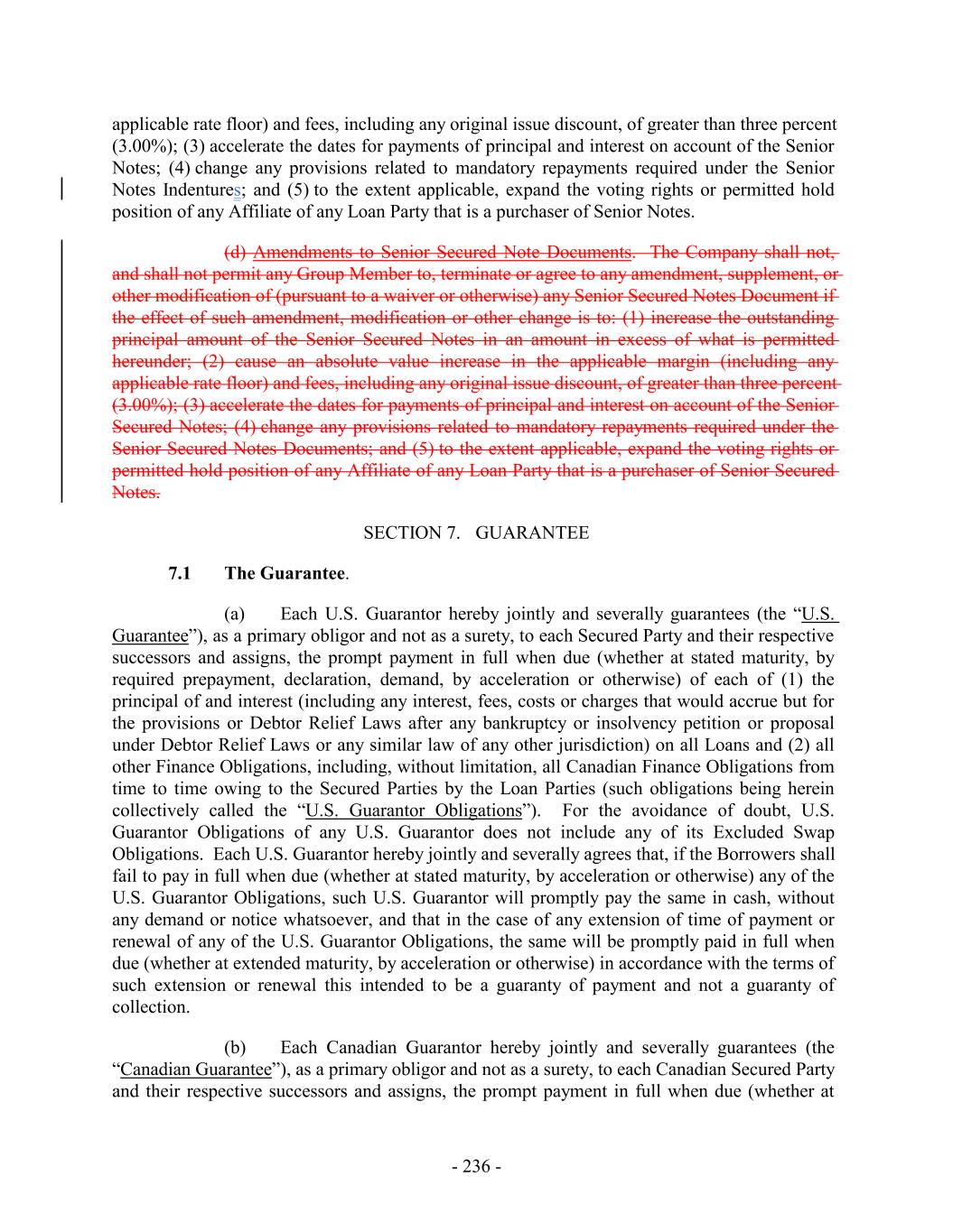 applicable rate floor) and fees, including any original issue discount, of greater than three percent (3.00%); (3) accelerate the dates for payments of principal and interest on account of the Senior Notes; (4) change any provisions related to mandatory repayments required under the Senior Notes Indentures; and (5) to the extent applicable, expand the voting rights or permitted hold position of any Affiliate of any Loan Party that is a purchaser of Senior Notes. (d) Amendments to Senior Secured Note Documents. The Company shall not, and shall not permit any Group Member to, terminate or agree to any amendment, supplement, or other modification of (pursuant to a waiver or otherwise) any Senior Secured Notes Document if the effect of such amendment, modification or other change is to: (1) increase the outstanding principal amount of the Senior Secured Notes in an amount in excess of what is permitted hereunder; (2) cause an absolute value increase in the applicable margin (including any applicable rate floor) and fees, including any original issue discount, of greater than three percent (3.00%); (3) accelerate the dates for payments of principal and interest on account of the Senior Secured Notes; (4) change any provisions related to mandatory repayments required under the Senior Secured Notes Documents; and (5) to the extent applicable, expand the voting rights or permitted hold position of any Affiliate of any Loan Party that is a purchaser of Senior Secured Notes. SECTION 7. GUARANTEE 7.1 The Guarantee. (a) Each U.S. Guarantor hereby jointly and severally guarantees (the “U.S. Guarantee”), as a primary obligor and not as a surety, to each Secured Party and their respective successors and assigns, the prompt payment in full when due (whether at stated maturity, by required prepayment, declaration, demand, by acceleration or otherwise) of each of (1) the principal of and interest (including any interest, fees, costs or charges that would accrue but for the provisions or Debtor Relief Laws after any bankruptcy or insolvency petition or proposal under Debtor Relief Laws or any similar law of any other jurisdiction) on all Loans and (2) all other Finance Obligations, including, without limitation, all Canadian Finance Obligations from time to time owing to the Secured Parties by the Loan Parties (such obligations being herein collectively called the “U.S. Guarantor Obligations”). For the avoidance of doubt, U.S. Guarantor Obligations of any U.S. Guarantor does not include any of its Excluded Swap Obligations. Each U.S. Guarantor hereby jointly and severally agrees that, if the Borrowers shall fail to pay in full when due (whether at stated maturity, by acceleration or otherwise) any of the U.S. Guarantor Obligations, such U.S. Guarantor will promptly pay the same in cash, without any demand or notice whatsoever, and that in the case of any extension of time of payment or renewal of any of the U.S. Guarantor Obligations, the same will be promptly paid in full when due (whether at extended maturity, by acceleration or otherwise) in accordance with the terms of such extension or renewal this intended to be a guaranty of payment and not a guaranty of collection. (b) Each Canadian Guarantor hereby jointly and severally guarantees (the “Canadian Guarantee”), as a primary obligor and not as a surety, to each Canadian Secured Party and their respective successors and assigns, the prompt payment in full when due (whether at - 236 -