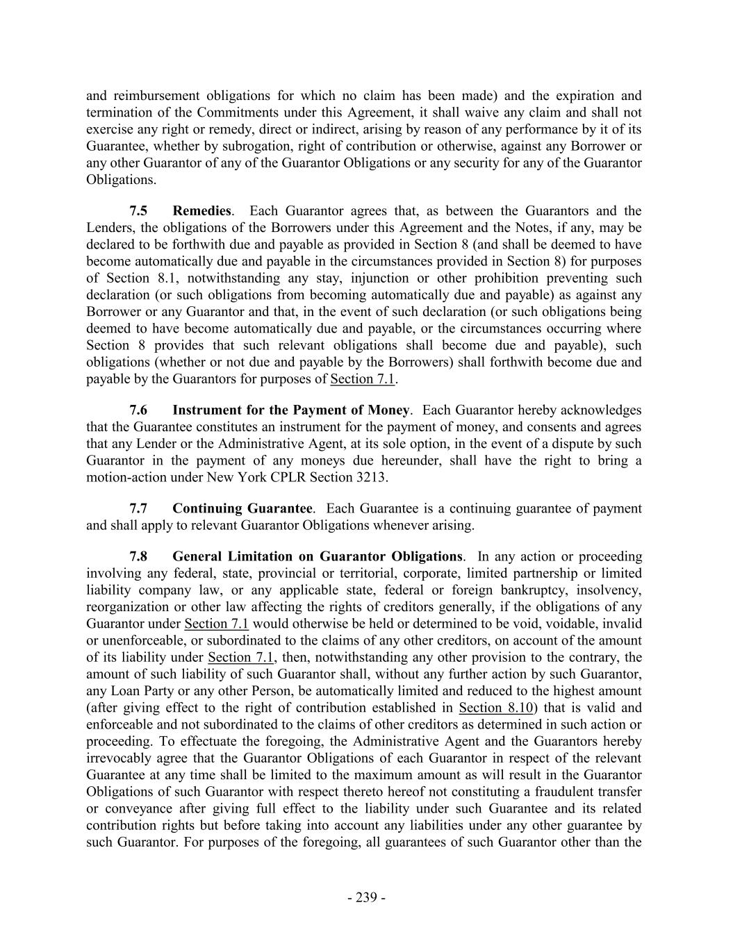 and reimbursement obligations for which no claim has been made) and the expiration and termination of the Commitments under this Agreement, it shall waive any claim and shall not exercise any right or remedy, direct or indirect, arising by reason of any performance by it of its Guarantee, whether by subrogation, right of contribution or otherwise, against any Borrower or any other Guarantor of any of the Guarantor Obligations or any security for any of the Guarantor Obligations. 7.5 Remedies. Each Guarantor agrees that, as between the Guarantors and the Lenders, the obligations of the Borrowers under this Agreement and the Notes, if any, may be declared to be forthwith due and payable as provided in Section 8 (and shall be deemed to have become automatically due and payable in the circumstances provided in Section 8) for purposes of Section 8.1, notwithstanding any stay, injunction or other prohibition preventing such declaration (or such obligations from becoming automatically due and payable) as against any Borrower or any Guarantor and that, in the event of such declaration (or such obligations being deemed to have become automatically due and payable, or the circumstances occurring where Section 8 provides that such relevant obligations shall become due and payable), such obligations (whether or not due and payable by the Borrowers) shall forthwith become due and payable by the Guarantors for purposes of Section 7.1. 7.6 Instrument for the Payment of Money. Each Guarantor hereby acknowledges that the Guarantee constitutes an instrument for the payment of money, and consents and agrees that any Lender or the Administrative Agent, at its sole option, in the event of a dispute by such Guarantor in the payment of any moneys due hereunder, shall have the right to bring a motion-action under New York CPLR Section 3213. 7.7 Continuing Guarantee. Each Guarantee is a continuing guarantee of payment and shall apply to relevant Guarantor Obligations whenever arising. 7.8 General Limitation on Guarantor Obligations. In any action or proceeding involving any federal, state, provincial or territorial, corporate, limited partnership or limited liability company law, or any applicable state, federal or foreign bankruptcy, insolvency, reorganization or other law affecting the rights of creditors generally, if the obligations of any Guarantor under Section 7.1 would otherwise be held or determined to be void, voidable, invalid or unenforceable, or subordinated to the claims of any other creditors, on account of the amount of its liability under Section 7.1, then, notwithstanding any other provision to the contrary, the amount of such liability of such Guarantor shall, without any further action by such Guarantor, any Loan Party or any other Person, be automatically limited and reduced to the highest amount (after giving effect to the right of contribution established in Section 8.10) that is valid and enforceable and not subordinated to the claims of other creditors as determined in such action or proceeding. To effectuate the foregoing, the Administrative Agent and the Guarantors hereby irrevocably agree that the Guarantor Obligations of each Guarantor in respect of the relevant Guarantee at any time shall be limited to the maximum amount as will result in the Guarantor Obligations of such Guarantor with respect thereto hereof not constituting a fraudulent transfer or conveyance after giving full effect to the liability under such Guarantee and its related contribution rights but before taking into account any liabilities under any other guarantee by such Guarantor. For purposes of the foregoing, all guarantees of such Guarantor other than the - 239 -