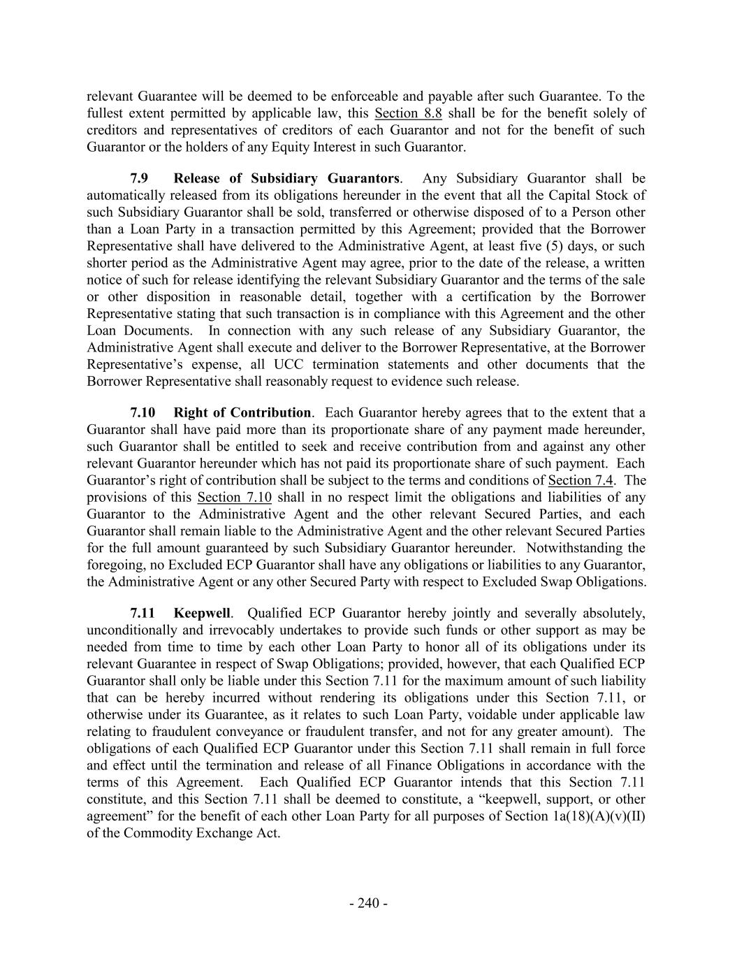 relevant Guarantee will be deemed to be enforceable and payable after such Guarantee. To the fullest extent permitted by applicable law, this Section 8.8 shall be for the benefit solely of creditors and representatives of creditors of each Guarantor and not for the benefit of such Guarantor or the holders of any Equity Interest in such Guarantor. 7.9 Release of Subsidiary Guarantors. Any Subsidiary Guarantor shall be automatically released from its obligations hereunder in the event that all the Capital Stock of such Subsidiary Guarantor shall be sold, transferred or otherwise disposed of to a Person other than a Loan Party in a transaction permitted by this Agreement; provided that the Borrower Representative shall have delivered to the Administrative Agent, at least five (5) days, or such shorter period as the Administrative Agent may agree, prior to the date of the release, a written notice of such for release identifying the relevant Subsidiary Guarantor and the terms of the sale or other disposition in reasonable detail, together with a certification by the Borrower Representative stating that such transaction is in compliance with this Agreement and the other Loan Documents. In connection with any such release of any Subsidiary Guarantor, the Administrative Agent shall execute and deliver to the Borrower Representative, at the Borrower Representative’s expense, all UCC termination statements and other documents that the Borrower Representative shall reasonably request to evidence such release. 7.10 Right of Contribution. Each Guarantor hereby agrees that to the extent that a Guarantor shall have paid more than its proportionate share of any payment made hereunder, such Guarantor shall be entitled to seek and receive contribution from and against any other relevant Guarantor hereunder which has not paid its proportionate share of such payment. Each Guarantor’s right of contribution shall be subject to the terms and conditions of Section 7.4. The provisions of this Section 7.10 shall in no respect limit the obligations and liabilities of any Guarantor to the Administrative Agent and the other relevant Secured Parties, and each Guarantor shall remain liable to the Administrative Agent and the other relevant Secured Parties for the full amount guaranteed by such Subsidiary Guarantor hereunder. Notwithstanding the foregoing, no Excluded ECP Guarantor shall have any obligations or liabilities to any Guarantor, the Administrative Agent or any other Secured Party with respect to Excluded Swap Obligations. 7.11 Keepwell. Qualified ECP Guarantor hereby jointly and severally absolutely, unconditionally and irrevocably undertakes to provide such funds or other support as may be needed from time to time by each other Loan Party to honor all of its obligations under its relevant Guarantee in respect of Swap Obligations; provided, however, that each Qualified ECP Guarantor shall only be liable under this Section 7.11 for the maximum amount of such liability that can be hereby incurred without rendering its obligations under this Section 7.11, or otherwise under its Guarantee, as it relates to such Loan Party, voidable under applicable law relating to fraudulent conveyance or fraudulent transfer, and not for any greater amount). The obligations of each Qualified ECP Guarantor under this Section 7.11 shall remain in full force and effect until the termination and release of all Finance Obligations in accordance with the terms of this Agreement. Each Qualified ECP Guarantor intends that this Section 7.11 constitute, and this Section 7.11 shall be deemed to constitute, a “keepwell, support, or other agreement” for the benefit of each other Loan Party for all purposes of Section 1a(18)(A)(v)(II) of the Commodity Exchange Act. - 240 -