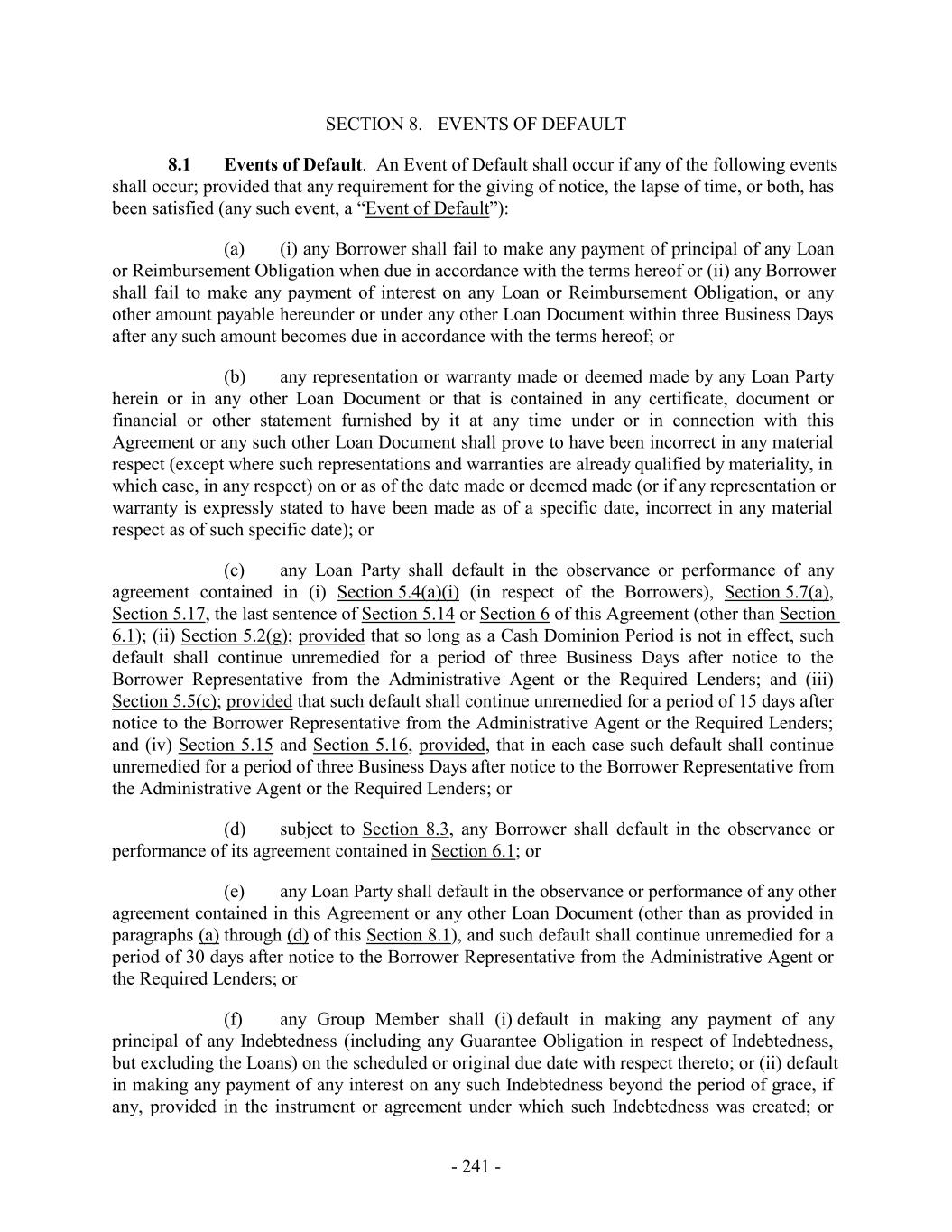 SECTION 8. EVENTS OF DEFAULT 8.1 Events of Default. An Event of Default shall occur if any of the following events shall occur; provided that any requirement for the giving of notice, the lapse of time, or both, has been satisfied (any such event, a “Event of Default”): (a) (i) any Borrower shall fail to make any payment of principal of any Loan or Reimbursement Obligation when due in accordance with the terms hereof or (ii) any Borrower shall fail to make any payment of interest on any Loan or Reimbursement Obligation, or any other amount payable hereunder or under any other Loan Document within three Business Days after any such amount becomes due in accordance with the terms hereof; or (b) any representation or warranty made or deemed made by any Loan Party herein or in any other Loan Document or that is contained in any certificate, document or financial or other statement furnished by it at any time under or in connection with this Agreement or any such other Loan Document shall prove to have been incorrect in any material respect (except where such representations and warranties are already qualified by materiality, in which case, in any respect) on or as of the date made or deemed made (or if any representation or warranty is expressly stated to have been made as of a specific date, incorrect in any material respect as of such specific date); or (c) any Loan Party shall default in the observance or performance of any agreement contained in (i) Section 5.4(a)(i) (in respect of the Borrowers), Section 5.7(a), Section 5.17, the last sentence of Section 5.14 or Section 6 of this Agreement (other than Section 6.1); (ii) Section 5.2(g); provided that so long as a Cash Dominion Period is not in effect, such default shall continue unremedied for a period of three Business Days after notice to the Borrower Representative from the Administrative Agent or the Required Lenders; and (iii) Section 5.5(c); provided that such default shall continue unremedied for a period of 15 days after notice to the Borrower Representative from the Administrative Agent or the Required Lenders; and (iv) Section 5.15 and Section 5.16, provided, that in each case such default shall continue unremedied for a period of three Business Days after notice to the Borrower Representative from the Administrative Agent or the Required Lenders; or (d) subject to Section 8.3, any Borrower shall default in the observance or performance of its agreement contained in Section 6.1; or (e) any Loan Party shall default in the observance or performance of any other agreement contained in this Agreement or any other Loan Document (other than as provided in paragraphs (a) through (d) of this Section 8.1), and such default shall continue unremedied for a period of 30 days after notice to the Borrower Representative from the Administrative Agent or the Required Lenders; or (f) any Group Member shall (i) default in making any payment of any principal of any Indebtedness (including any Guarantee Obligation in respect of Indebtedness, but excluding the Loans) on the scheduled or original due date with respect thereto; or (ii) default in making any payment of any interest on any such Indebtedness beyond the period of grace, if any, provided in the instrument or agreement under which such Indebtedness was created; or - 241 -