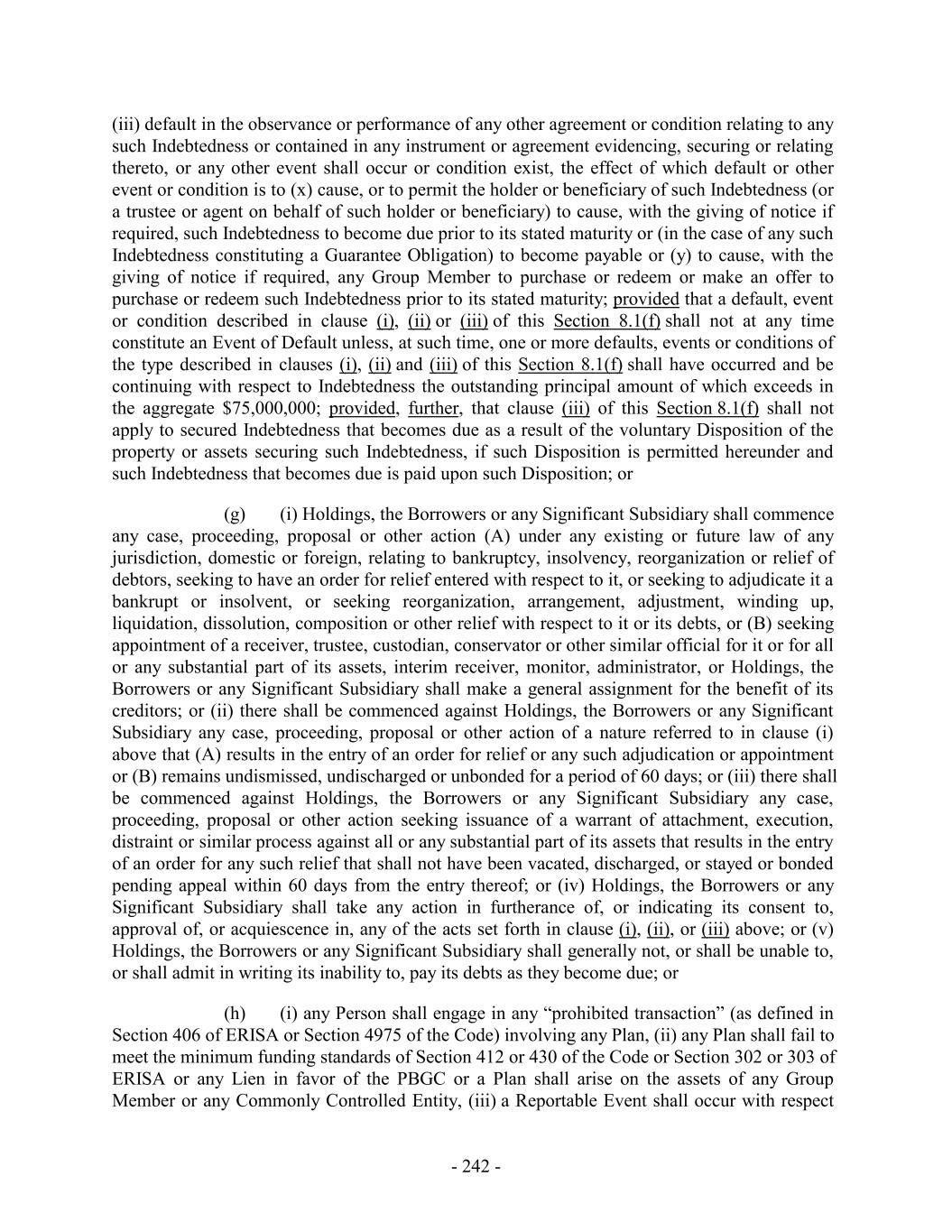 (iii) default in the observance or performance of any other agreement or condition relating to any such Indebtedness or contained in any instrument or agreement evidencing, securing or relating thereto, or any other event shall occur or condition exist, the effect of which default or other event or condition is to (x) cause, or to permit the holder or beneficiary of such Indebtedness (or a trustee or agent on behalf of such holder or beneficiary) to cause, with the giving of notice if required, such Indebtedness to become due prior to its stated maturity or (in the case of any such Indebtedness constituting a Guarantee Obligation) to become payable or (y) to cause, with the giving of notice if required, any Group Member to purchase or redeem or make an offer to purchase or redeem such Indebtedness prior to its stated maturity; provided that a default, event or condition described in clause (i), (ii) or (iii) of this Section 8.1(f) shall not at any time constitute an Event of Default unless, at such time, one or more defaults, events or conditions of the type described in clauses (i), (ii) and (iii) of this Section 8.1(f) shall have occurred and be continuing with respect to Indebtedness the outstanding principal amount of which exceeds in the aggregate $75,000,000; provided, further, that clause (iii) of this Section 8.1(f) shall not apply to secured Indebtedness that becomes due as a result of the voluntary Disposition of the property or assets securing such Indebtedness, if such Disposition is permitted hereunder and such Indebtedness that becomes due is paid upon such Disposition; or (g) (i) Holdings, the Borrowers or any Significant Subsidiary shall commence any case, proceeding, proposal or other action (A) under any existing or future law of any jurisdiction, domestic or foreign, relating to bankruptcy, insolvency, reorganization or relief of debtors, seeking to have an order for relief entered with respect to it, or seeking to adjudicate it a bankrupt or insolvent, or seeking reorganization, arrangement, adjustment, winding up, liquidation, dissolution, composition or other relief with respect to it or its debts, or (B) seeking appointment of a receiver, trustee, custodian, conservator or other similar official for it or for all or any substantial part of its assets, interim receiver, monitor, administrator, or Holdings, the Borrowers or any Significant Subsidiary shall make a general assignment for the benefit of its creditors; or (ii) there shall be commenced against Holdings, the Borrowers or any Significant Subsidiary any case, proceeding, proposal or other action of a nature referred to in clause (i) above that (A) results in the entry of an order for relief or any such adjudication or appointment or (B) remains undismissed, undischarged or unbonded for a period of 60 days; or (iii) there shall be commenced against Holdings, the Borrowers or any Significant Subsidiary any case, proceeding, proposal or other action seeking issuance of a warrant of attachment, execution, distraint or similar process against all or any substantial part of its assets that results in the entry of an order for any such relief that shall not have been vacated, discharged, or stayed or bonded pending appeal within 60 days from the entry thereof; or (iv) Holdings, the Borrowers or any Significant Subsidiary shall take any action in furtherance of, or indicating its consent to, approval of, or acquiescence in, any of the acts set forth in clause (i), (ii), or (iii) above; or (v) Holdings, the Borrowers or any Significant Subsidiary shall generally not, or shall be unable to, or shall admit in writing its inability to, pay its debts as they become due; or (h) (i) any Person shall engage in any “prohibited transaction” (as defined in Section 406 of ERISA or Section 4975 of the Code) involving any Plan, (ii) any Plan shall fail to meet the minimum funding standards of Section 412 or 430 of the Code or Section 302 or 303 of ERISA or any Lien in favor of the PBGC or a Plan shall arise on the assets of any Group Member or any Commonly Controlled Entity, (iii) a Reportable Event shall occur with respect - 242 -