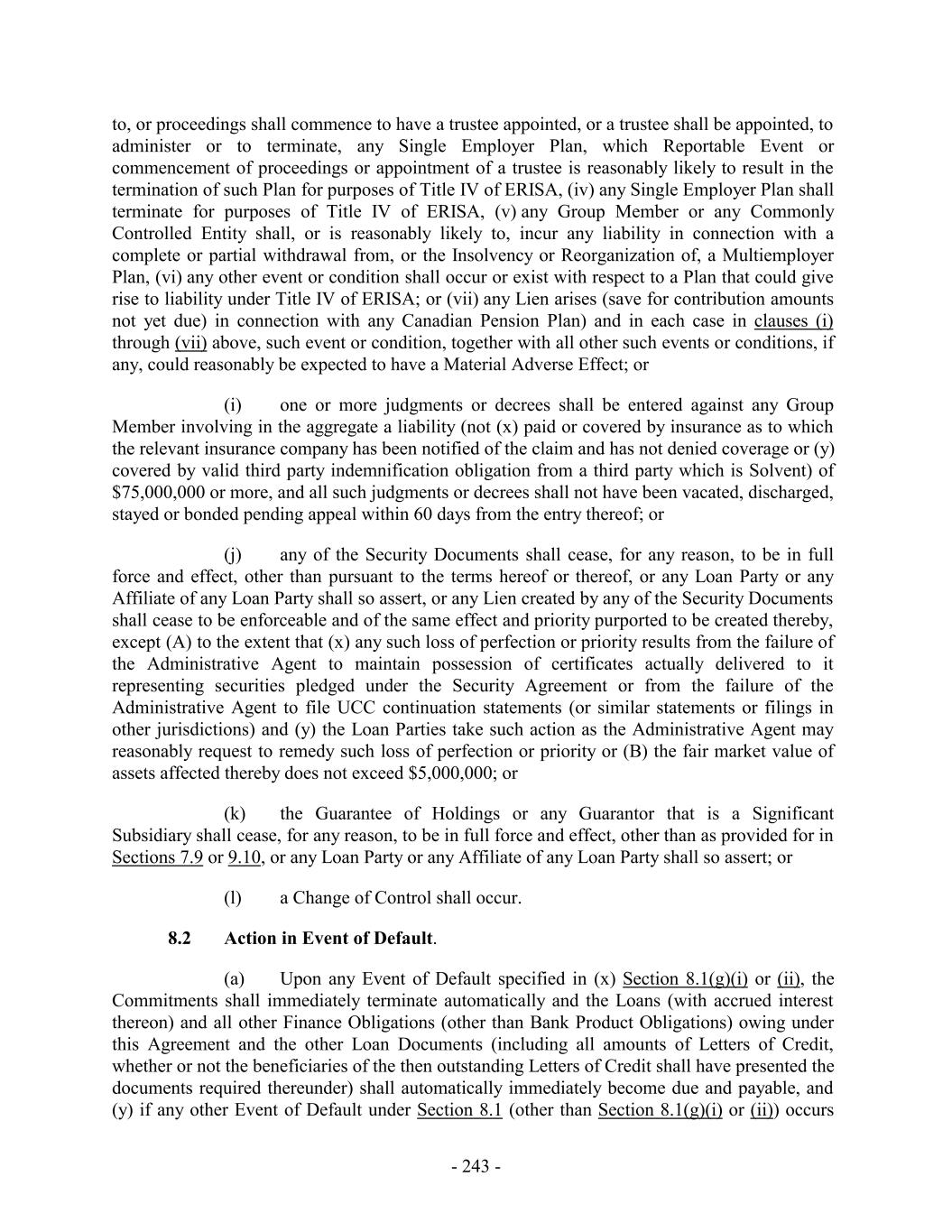 to, or proceedings shall commence to have a trustee appointed, or a trustee shall be appointed, to administer or to terminate, any Single Employer Plan, which Reportable Event or commencement of proceedings or appointment of a trustee is reasonably likely to result in the termination of such Plan for purposes of Title IV of ERISA, (iv) any Single Employer Plan shall terminate for purposes of Title IV of ERISA, (v) any Group Member or any Commonly Controlled Entity shall, or is reasonably likely to, incur any liability in connection with a complete or partial withdrawal from, or the Insolvency or Reorganization of, a Multiemployer Plan, (vi) any other event or condition shall occur or exist with respect to a Plan that could give rise to liability under Title IV of ERISA; or (vii) any Lien arises (save for contribution amounts not yet due) in connection with any Canadian Pension Plan) and in each case in clauses (i) through (vii) above, such event or condition, together with all other such events or conditions, if any, could reasonably be expected to have a Material Adverse Effect; or (i) one or more judgments or decrees shall be entered against any Group Member involving in the aggregate a liability (not (x) paid or covered by insurance as to which the relevant insurance company has been notified of the claim and has not denied coverage or (y) covered by valid third party indemnification obligation from a third party which is Solvent) of $75,000,000 or more, and all such judgments or decrees shall not have been vacated, discharged, stayed or bonded pending appeal within 60 days from the entry thereof; or (j) any of the Security Documents shall cease, for any reason, to be in full force and effect, other than pursuant to the terms hereof or thereof, or any Loan Party or any Affiliate of any Loan Party shall so assert, or any Lien created by any of the Security Documents shall cease to be enforceable and of the same effect and priority purported to be created thereby, except (A) to the extent that (x) any such loss of perfection or priority results from the failure of the Administrative Agent to maintain possession of certificates actually delivered to it representing securities pledged under the Security Agreement or from the failure of the Administrative Agent to file UCC continuation statements (or similar statements or filings in other jurisdictions) and (y) the Loan Parties take such action as the Administrative Agent may reasonably request to remedy such loss of perfection or priority or (B) the fair market value of assets affected thereby does not exceed $5,000,000; or (k) the Guarantee of Holdings or any Guarantor that is a Significant Subsidiary shall cease, for any reason, to be in full force and effect, other than as provided for in Sections 7.9 or 9.10, or any Loan Party or any Affiliate of any Loan Party shall so assert; or (l) a Change of Control shall occur. 8.2 Action in Event of Default. (a) Upon any Event of Default specified in (x) Section 8.1(g)(i) or (ii), the Commitments shall immediately terminate automatically and the Loans (with accrued interest thereon) and all other Finance Obligations (other than Bank Product Obligations) owing under this Agreement and the other Loan Documents (including all amounts of Letters of Credit, whether or not the beneficiaries of the then outstanding Letters of Credit shall have presented the documents required thereunder) shall automatically immediately become due and payable, and (y) if any other Event of Default under Section 8.1 (other than Section 8.1(g)(i) or (ii)) occurs - 243 -