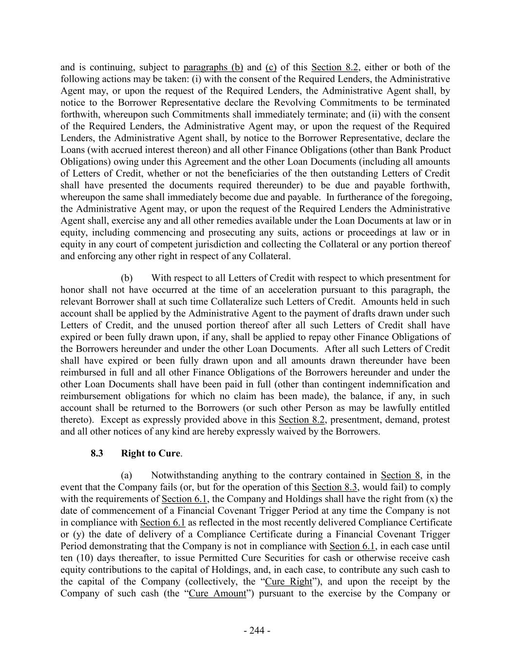 and is continuing, subject to paragraphs (b) and (c) of this Section 8.2, either or both of the following actions may be taken: (i) with the consent of the Required Lenders, the Administrative Agent may, or upon the request of the Required Lenders, the Administrative Agent shall, by notice to the Borrower Representative declare the Revolving Commitments to be terminated forthwith, whereupon such Commitments shall immediately terminate; and (ii) with the consent of the Required Lenders, the Administrative Agent may, or upon the request of the Required Lenders, the Administrative Agent shall, by notice to the Borrower Representative, declare the Loans (with accrued interest thereon) and all other Finance Obligations (other than Bank Product Obligations) owing under this Agreement and the other Loan Documents (including all amounts of Letters of Credit, whether or not the beneficiaries of the then outstanding Letters of Credit shall have presented the documents required thereunder) to be due and payable forthwith, whereupon the same shall immediately become due and payable. In furtherance of the foregoing, the Administrative Agent may, or upon the request of the Required Lenders the Administrative Agent shall, exercise any and all other remedies available under the Loan Documents at law or in equity, including commencing and prosecuting any suits, actions or proceedings at law or in equity in any court of competent jurisdiction and collecting the Collateral or any portion thereof and enforcing any other right in respect of any Collateral. (b) With respect to all Letters of Credit with respect to which presentment for honor shall not have occurred at the time of an acceleration pursuant to this paragraph, the relevant Borrower shall at such time Collateralize such Letters of Credit. Amounts held in such account shall be applied by the Administrative Agent to the payment of drafts drawn under such Letters of Credit, and the unused portion thereof after all such Letters of Credit shall have expired or been fully drawn upon, if any, shall be applied to repay other Finance Obligations of the Borrowers hereunder and under the other Loan Documents. After all such Letters of Credit shall have expired or been fully drawn upon and all amounts drawn thereunder have been reimbursed in full and all other Finance Obligations of the Borrowers hereunder and under the other Loan Documents shall have been paid in full (other than contingent indemnification and reimbursement obligations for which no claim has been made), the balance, if any, in such account shall be returned to the Borrowers (or such other Person as may be lawfully entitled thereto). Except as expressly provided above in this Section 8.2, presentment, demand, protest and all other notices of any kind are hereby expressly waived by the Borrowers. 8.3 Right to Cure. (a) Notwithstanding anything to the contrary contained in Section 8, in the event that the Company fails (or, but for the operation of this Section 8.3, would fail) to comply with the requirements of Section 6.1, the Company and Holdings shall have the right from (x) the date of commencement of a Financial Covenant Trigger Period at any time the Company is not in compliance with Section 6.1 as reflected in the most recently delivered Compliance Certificate or (y) the date of delivery of a Compliance Certificate during a Financial Covenant Trigger Period demonstrating that the Company is not in compliance with Section 6.1, in each case until ten (10) days thereafter, to issue Permitted Cure Securities for cash or otherwise receive cash equity contributions to the capital of Holdings, and, in each case, to contribute any such cash to the capital of the Company (collectively, the “Cure Right”), and upon the receipt by the Company of such cash (the “Cure Amount”) pursuant to the exercise by the Company or - 244 -