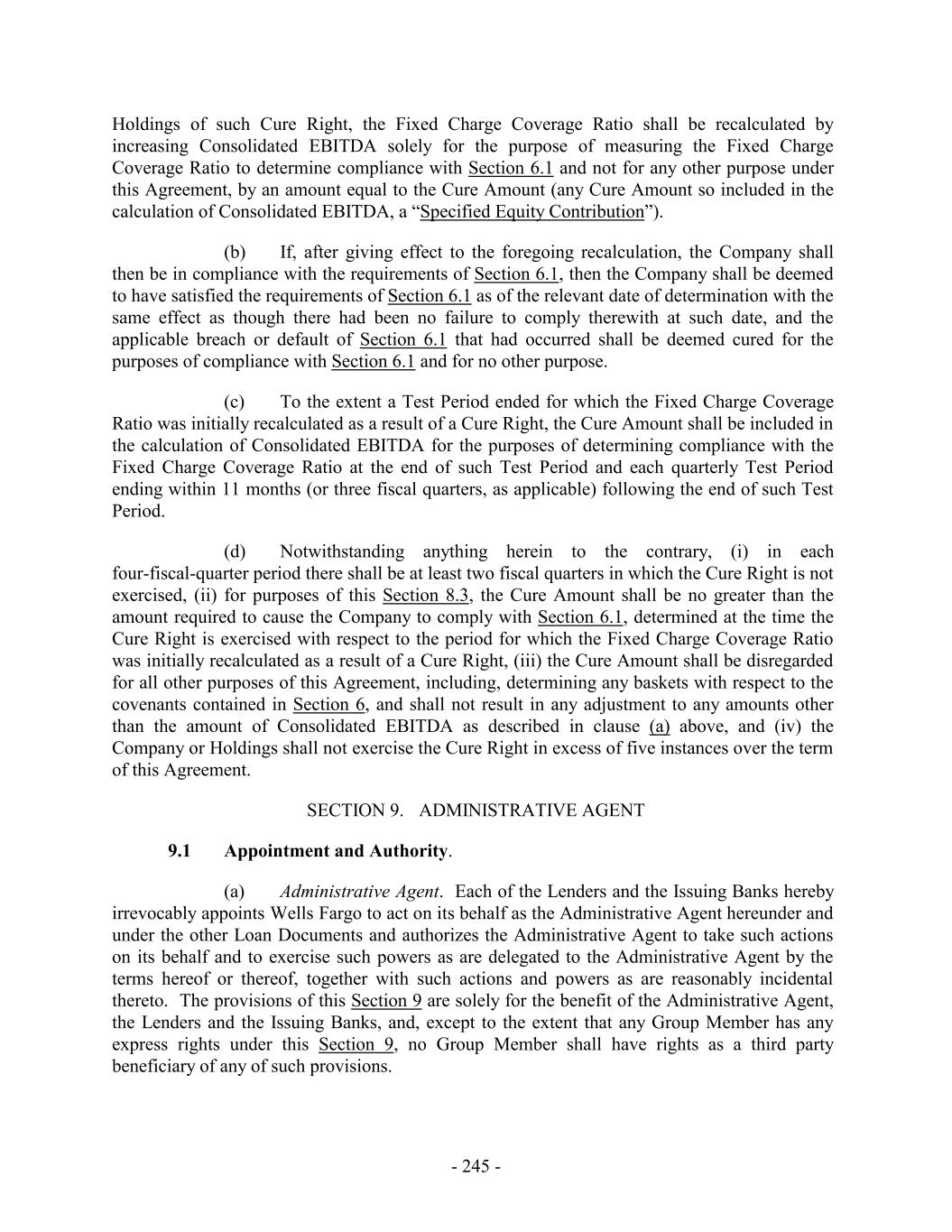 Holdings of such Cure Right, the Fixed Charge Coverage Ratio shall be recalculated by increasing Consolidated EBITDA solely for the purpose of measuring the Fixed Charge Coverage Ratio to determine compliance with Section 6.1 and not for any other purpose under this Agreement, by an amount equal to the Cure Amount (any Cure Amount so included in the calculation of Consolidated EBITDA, a “Specified Equity Contribution”). (b) If, after giving effect to the foregoing recalculation, the Company shall then be in compliance with the requirements of Section 6.1, then the Company shall be deemed to have satisfied the requirements of Section 6.1 as of the relevant date of determination with the same effect as though there had been no failure to comply therewith at such date, and the applicable breach or default of Section 6.1 that had occurred shall be deemed cured for the purposes of compliance with Section 6.1 and for no other purpose. (c) To the extent a Test Period ended for which the Fixed Charge Coverage Ratio was initially recalculated as a result of a Cure Right, the Cure Amount shall be included in the calculation of Consolidated EBITDA for the purposes of determining compliance with the Fixed Charge Coverage Ratio at the end of such Test Period and each quarterly Test Period ending within 11 months (or three fiscal quarters, as applicable) following the end of such Test Period. (d) Notwithstanding anything herein to the contrary, (i) in each four-fiscal-quarter period there shall be at least two fiscal quarters in which the Cure Right is not exercised, (ii) for purposes of this Section 8.3, the Cure Amount shall be no greater than the amount required to cause the Company to comply with Section 6.1, determined at the time the Cure Right is exercised with respect to the period for which the Fixed Charge Coverage Ratio was initially recalculated as a result of a Cure Right, (iii) the Cure Amount shall be disregarded for all other purposes of this Agreement, including, determining any baskets with respect to the covenants contained in Section 6, and shall not result in any adjustment to any amounts other than the amount of Consolidated EBITDA as described in clause (a) above, and (iv) the Company or Holdings shall not exercise the Cure Right in excess of five instances over the term of this Agreement. SECTION 9. ADMINISTRATIVE AGENT 9.1 Appointment and Authority. (a) Administrative Agent. Each of the Lenders and the Issuing Banks hereby irrevocably appoints Wells Fargo to act on its behalf as the Administrative Agent hereunder and under the other Loan Documents and authorizes the Administrative Agent to take such actions on its behalf and to exercise such powers as are delegated to the Administrative Agent by the terms hereof or thereof, together with such actions and powers as are reasonably incidental thereto. The provisions of this Section 9 are solely for the benefit of the Administrative Agent, the Lenders and the Issuing Banks, and, except to the extent that any Group Member has any express rights under this Section 9, no Group Member shall have rights as a third party beneficiary of any of such provisions. - 245 -