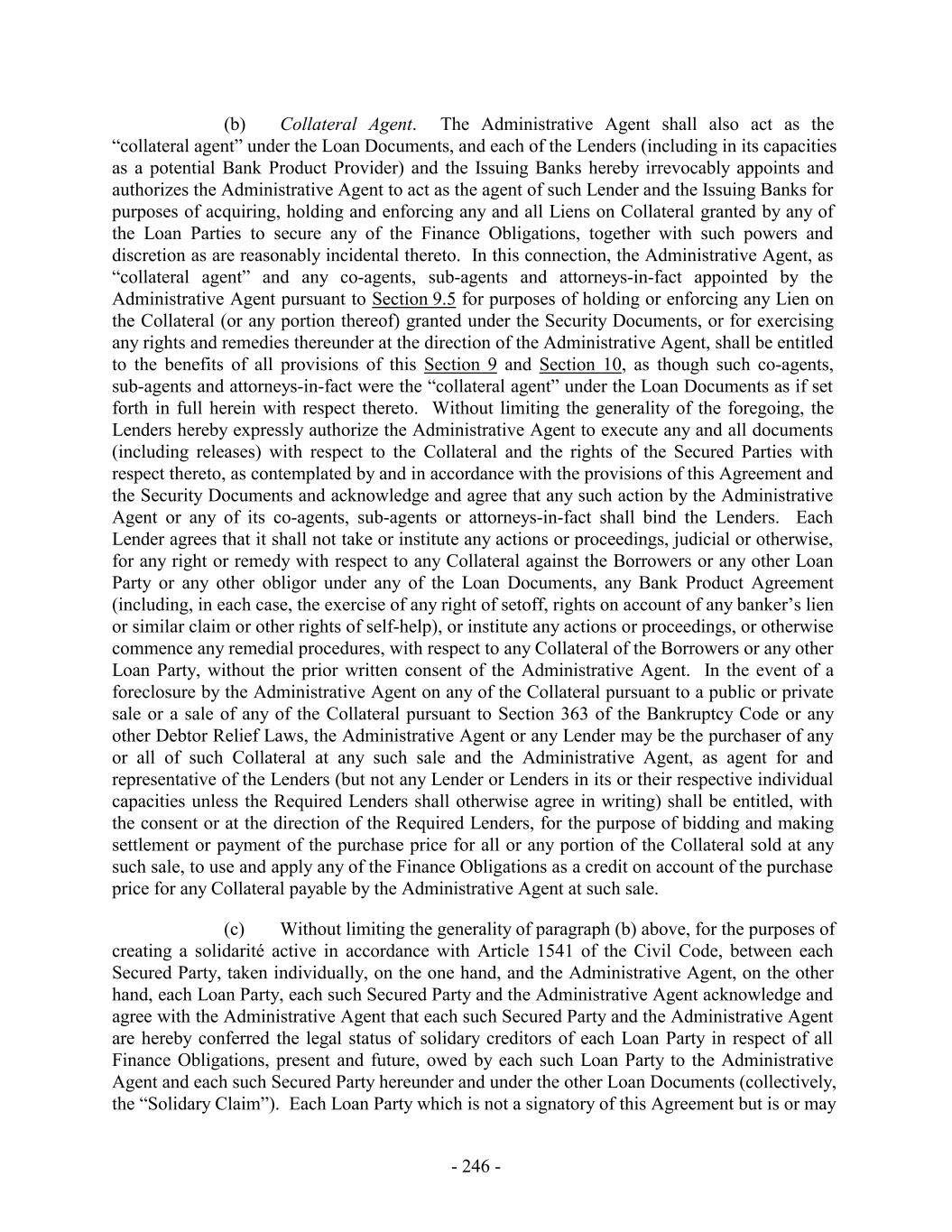 (b) Collateral Agent. The Administrative Agent shall also act as the “collateral agent” under the Loan Documents, and each of the Lenders (including in its capacities as a potential Bank Product Provider) and the Issuing Banks hereby irrevocably appoints and authorizes the Administrative Agent to act as the agent of such Lender and the Issuing Banks for purposes of acquiring, holding and enforcing any and all Liens on Collateral granted by any of the Loan Parties to secure any of the Finance Obligations, together with such powers and discretion as are reasonably incidental thereto. In this connection, the Administrative Agent, as “collateral agent” and any co-agents, sub-agents and attorneys-in-fact appointed by the Administrative Agent pursuant to Section 9.5 for purposes of holding or enforcing any Lien on the Collateral (or any portion thereof) granted under the Security Documents, or for exercising any rights and remedies thereunder at the direction of the Administrative Agent, shall be entitled to the benefits of all provisions of this Section 9 and Section 10, as though such co-agents, sub-agents and attorneys-in-fact were the “collateral agent” under the Loan Documents as if set forth in full herein with respect thereto. Without limiting the generality of the foregoing, the Lenders hereby expressly authorize the Administrative Agent to execute any and all documents (including releases) with respect to the Collateral and the rights of the Secured Parties with respect thereto, as contemplated by and in accordance with the provisions of this Agreement and the Security Documents and acknowledge and agree that any such action by the Administrative Agent or any of its co-agents, sub-agents or attorneys-in-fact shall bind the Lenders. Each Lender agrees that it shall not take or institute any actions or proceedings, judicial or otherwise, for any right or remedy with respect to any Collateral against the Borrowers or any other Loan Party or any other obligor under any of the Loan Documents, any Bank Product Agreement (including, in each case, the exercise of any right of setoff, rights on account of any banker’s lien or similar claim or other rights of self-help), or institute any actions or proceedings, or otherwise commence any remedial procedures, with respect to any Collateral of the Borrowers or any other Loan Party, without the prior written consent of the Administrative Agent. In the event of a foreclosure by the Administrative Agent on any of the Collateral pursuant to a public or private sale or a sale of any of the Collateral pursuant to Section 363 of the Bankruptcy Code or any other Debtor Relief Laws, the Administrative Agent or any Lender may be the purchaser of any or all of such Collateral at any such sale and the Administrative Agent, as agent for and representative of the Lenders (but not any Lender or Lenders in its or their respective individual capacities unless the Required Lenders shall otherwise agree in writing) shall be entitled, with the consent or at the direction of the Required Lenders, for the purpose of bidding and making settlement or payment of the purchase price for all or any portion of the Collateral sold at any such sale, to use and apply any of the Finance Obligations as a credit on account of the purchase price for any Collateral payable by the Administrative Agent at such sale. (c) Without limiting the generality of paragraph (b) above, for the purposes of creating a solidarité active in accordance with Article 1541 of the Civil Code, between each Secured Party, taken individually, on the one hand, and the Administrative Agent, on the other hand, each Loan Party, each such Secured Party and the Administrative Agent acknowledge and agree with the Administrative Agent that each such Secured Party and the Administrative Agent are hereby conferred the legal status of solidary creditors of each Loan Party in respect of all Finance Obligations, present and future, owed by each such Loan Party to the Administrative Agent and each such Secured Party hereunder and under the other Loan Documents (collectively, the “Solidary Claim”). Each Loan Party which is not a signatory of this Agreement but is or may - 246 -