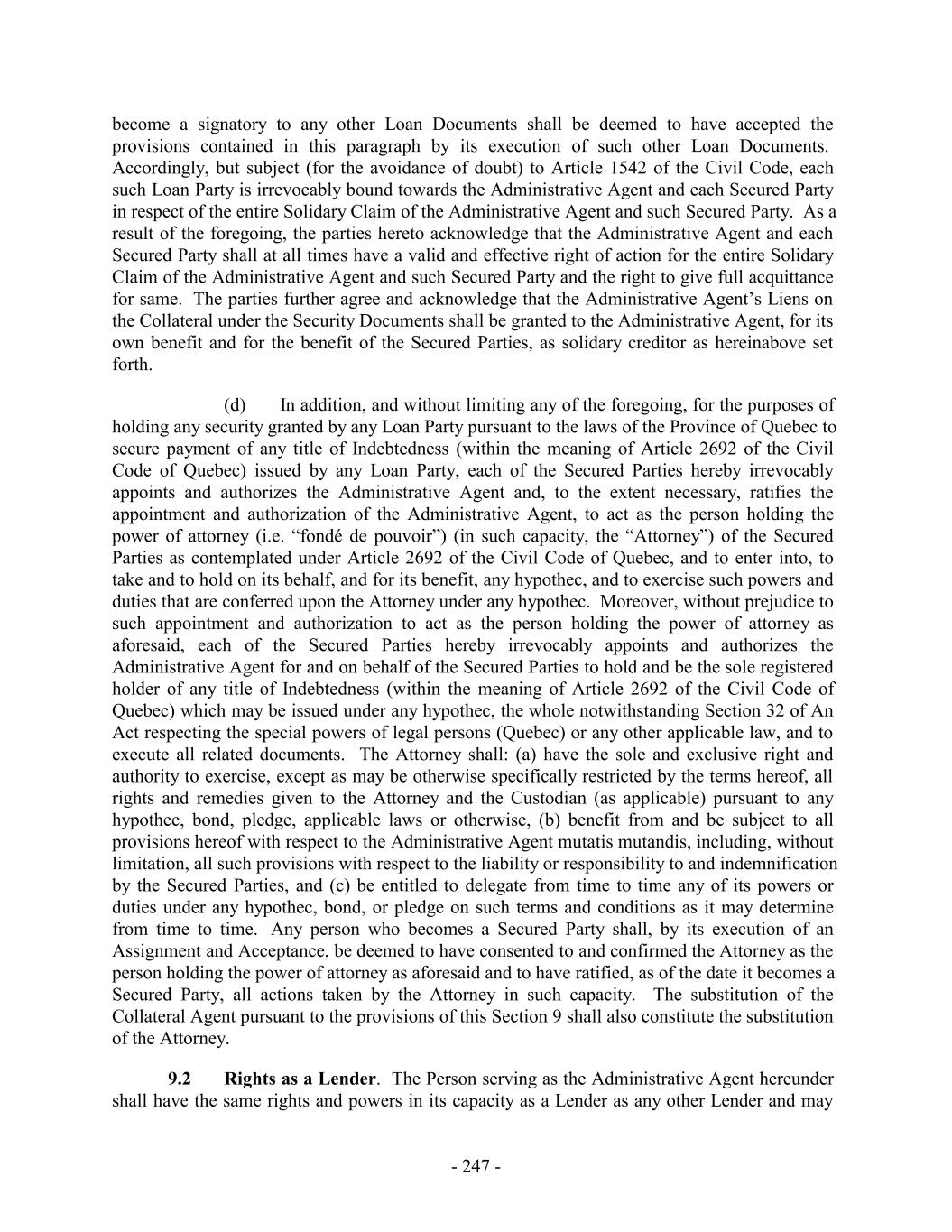 become a signatory to any other Loan Documents shall be deemed to have accepted the provisions contained in this paragraph by its execution of such other Loan Documents. Accordingly, but subject (for the avoidance of doubt) to Article 1542 of the Civil Code, each such Loan Party is irrevocably bound towards the Administrative Agent and each Secured Party in respect of the entire Solidary Claim of the Administrative Agent and such Secured Party. As a result of the foregoing, the parties hereto acknowledge that the Administrative Agent and each Secured Party shall at all times have a valid and effective right of action for the entire Solidary Claim of the Administrative Agent and such Secured Party and the right to give full acquittance for same. The parties further agree and acknowledge that the Administrative Agent’s Liens on the Collateral under the Security Documents shall be granted to the Administrative Agent, for its own benefit and for the benefit of the Secured Parties, as solidary creditor as hereinabove set forth. (d) In addition, and without limiting any of the foregoing, for the purposes of holding any security granted by any Loan Party pursuant to the laws of the Province of Quebec to secure payment of any title of Indebtedness (within the meaning of Article 2692 of the Civil Code of Quebec) issued by any Loan Party, each of the Secured Parties hereby irrevocably appoints and authorizes the Administrative Agent and, to the extent necessary, ratifies the appointment and authorization of the Administrative Agent, to act as the person holding the power of attorney (i.e. “fondé de pouvoir”) (in such capacity, the “Attorney”) of the Secured Parties as contemplated under Article 2692 of the Civil Code of Quebec, and to enter into, to take and to hold on its behalf, and for its benefit, any hypothec, and to exercise such powers and duties that are conferred upon the Attorney under any hypothec. Moreover, without prejudice to such appointment and authorization to act as the person holding the power of attorney as aforesaid, each of the Secured Parties hereby irrevocably appoints and authorizes the Administrative Agent for and on behalf of the Secured Parties to hold and be the sole registered holder of any title of Indebtedness (within the meaning of Article 2692 of the Civil Code of Quebec) which may be issued under any hypothec, the whole notwithstanding Section 32 of An Act respecting the special powers of legal persons (Quebec) or any other applicable law, and to execute all related documents. The Attorney shall: (a) have the sole and exclusive right and authority to exercise, except as may be otherwise specifically restricted by the terms hereof, all rights and remedies given to the Attorney and the Custodian (as applicable) pursuant to any hypothec, bond, pledge, applicable laws or otherwise, (b) benefit from and be subject to all provisions hereof with respect to the Administrative Agent mutatis mutandis, including, without limitation, all such provisions with respect to the liability or responsibility to and indemnification by the Secured Parties, and (c) be entitled to delegate from time to time any of its powers or duties under any hypothec, bond, or pledge on such terms and conditions as it may determine from time to time. Any person who becomes a Secured Party shall, by its execution of an Assignment and Acceptance, be deemed to have consented to and confirmed the Attorney as the person holding the power of attorney as aforesaid and to have ratified, as of the date it becomes a Secured Party, all actions taken by the Attorney in such capacity. The substitution of the Collateral Agent pursuant to the provisions of this Section 9 shall also constitute the substitution of the Attorney. 9.2 Rights as a Lender. The Person serving as the Administrative Agent hereunder shall have the same rights and powers in its capacity as a Lender as any other Lender and may - 247 -