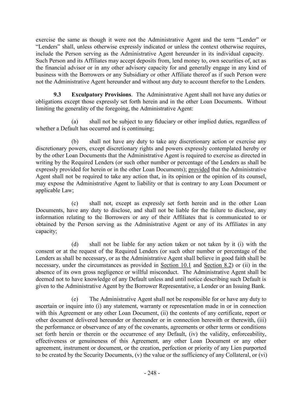 exercise the same as though it were not the Administrative Agent and the term “Lender” or “Lenders” shall, unless otherwise expressly indicated or unless the context otherwise requires, include the Person serving as the Administrative Agent hereunder in its individual capacity. Such Person and its Affiliates may accept deposits from, lend money to, own securities of, act as the financial advisor or in any other advisory capacity for and generally engage in any kind of business with the Borrowers or any Subsidiary or other Affiliate thereof as if such Person were not the Administrative Agent hereunder and without any duty to account therefor to the Lenders. 9.3 Exculpatory Provisions. The Administrative Agent shall not have any duties or obligations except those expressly set forth herein and in the other Loan Documents. Without limiting the generality of the foregoing, the Administrative Agent: (a) shall not be subject to any fiduciary or other implied duties, regardless of whether a Default has occurred and is continuing; (b) shall not have any duty to take any discretionary action or exercise any discretionary powers, except discretionary rights and powers expressly contemplated hereby or by the other Loan Documents that the Administrative Agent is required to exercise as directed in writing by the Required Lenders (or such other number or percentage of the Lenders as shall be expressly provided for herein or in the other Loan Documents); provided that the Administrative Agent shall not be required to take any action that, in its opinion or the opinion of its counsel, may expose the Administrative Agent to liability or that is contrary to any Loan Document or applicable Law; (c) shall not, except as expressly set forth herein and in the other Loan Documents, have any duty to disclose, and shall not be liable for the failure to disclose, any information relating to the Borrowers or any of their Affiliates that is communicated to or obtained by the Person serving as the Administrative Agent or any of its Affiliates in any capacity; (d) shall not be liable for any action taken or not taken by it (i) with the consent or at the request of the Required Lenders (or such other number or percentage of the Lenders as shall be necessary, or as the Administrative Agent shall believe in good faith shall be necessary, under the circumstances as provided in Section 10.1 and Section 8.2) or (ii) in the absence of its own gross negligence or willful misconduct. The Administrative Agent shall be deemed not to have knowledge of any Default unless and until notice describing such Default is given to the Administrative Agent by the Borrower Representative, a Lender or an Issuing Bank. (e) The Administrative Agent shall not be responsible for or have any duty to ascertain or inquire into (i) any statement, warranty or representation made in or in connection with this Agreement or any other Loan Document, (ii) the contents of any certificate, report or other document delivered hereunder or thereunder or in connection herewith or therewith, (iii) the performance or observance of any of the covenants, agreements or other terms or conditions set forth herein or therein or the occurrence of any Default, (iv) the validity, enforceability, effectiveness or genuineness of this Agreement, any other Loan Document or any other agreement, instrument or document, or the creation, perfection or priority of any Lien purported to be created by the Security Documents, (v) the value or the sufficiency of any Collateral, or (vi) - 248 -