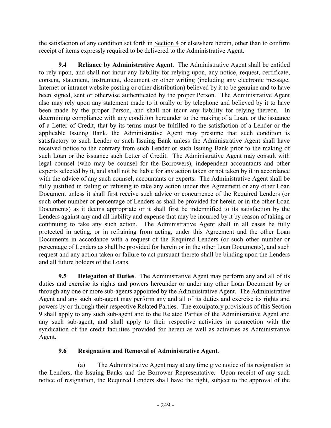the satisfaction of any condition set forth in Section 4 or elsewhere herein, other than to confirm receipt of items expressly required to be delivered to the Administrative Agent. 9.4 Reliance by Administrative Agent. The Administrative Agent shall be entitled to rely upon, and shall not incur any liability for relying upon, any notice, request, certificate, consent, statement, instrument, document or other writing (including any electronic message, Internet or intranet website posting or other distribution) believed by it to be genuine and to have been signed, sent or otherwise authenticated by the proper Person. The Administrative Agent also may rely upon any statement made to it orally or by telephone and believed by it to have been made by the proper Person, and shall not incur any liability for relying thereon. In determining compliance with any condition hereunder to the making of a Loan, or the issuance of a Letter of Credit, that by its terms must be fulfilled to the satisfaction of a Lender or the applicable Issuing Bank, the Administrative Agent may presume that such condition is satisfactory to such Lender or such Issuing Bank unless the Administrative Agent shall have received notice to the contrary from such Lender or such Issuing Bank prior to the making of such Loan or the issuance such Letter of Credit. The Administrative Agent may consult with legal counsel (who may be counsel for the Borrowers), independent accountants and other experts selected by it, and shall not be liable for any action taken or not taken by it in accordance with the advice of any such counsel, accountants or experts. The Administrative Agent shall be fully justified in failing or refusing to take any action under this Agreement or any other Loan Document unless it shall first receive such advice or concurrence of the Required Lenders (or such other number or percentage of Lenders as shall be provided for herein or in the other Loan Documents) as it deems appropriate or it shall first be indemnified to its satisfaction by the Lenders against any and all liability and expense that may be incurred by it by reason of taking or continuing to take any such action. The Administrative Agent shall in all cases be fully protected in acting, or in refraining from acting, under this Agreement and the other Loan Documents in accordance with a request of the Required Lenders (or such other number or percentage of Lenders as shall be provided for herein or in the other Loan Documents), and such request and any action taken or failure to act pursuant thereto shall be binding upon the Lenders and all future holders of the Loans. 9.5 Delegation of Duties. The Administrative Agent may perform any and all of its duties and exercise its rights and powers hereunder or under any other Loan Document by or through any one or more sub-agents appointed by the Administrative Agent. The Administrative Agent and any such sub-agent may perform any and all of its duties and exercise its rights and powers by or through their respective Related Parties. The exculpatory provisions of this Section 9 shall apply to any such sub-agent and to the Related Parties of the Administrative Agent and any such sub-agent, and shall apply to their respective activities in connection with the syndication of the credit facilities provided for herein as well as activities as Administrative Agent. 9.6 Resignation and Removal of Administrative Agent. (a) The Administrative Agent may at any time give notice of its resignation to the Lenders, the Issuing Banks and the Borrower Representative. Upon receipt of any such notice of resignation, the Required Lenders shall have the right, subject to the approval of the - 249 -