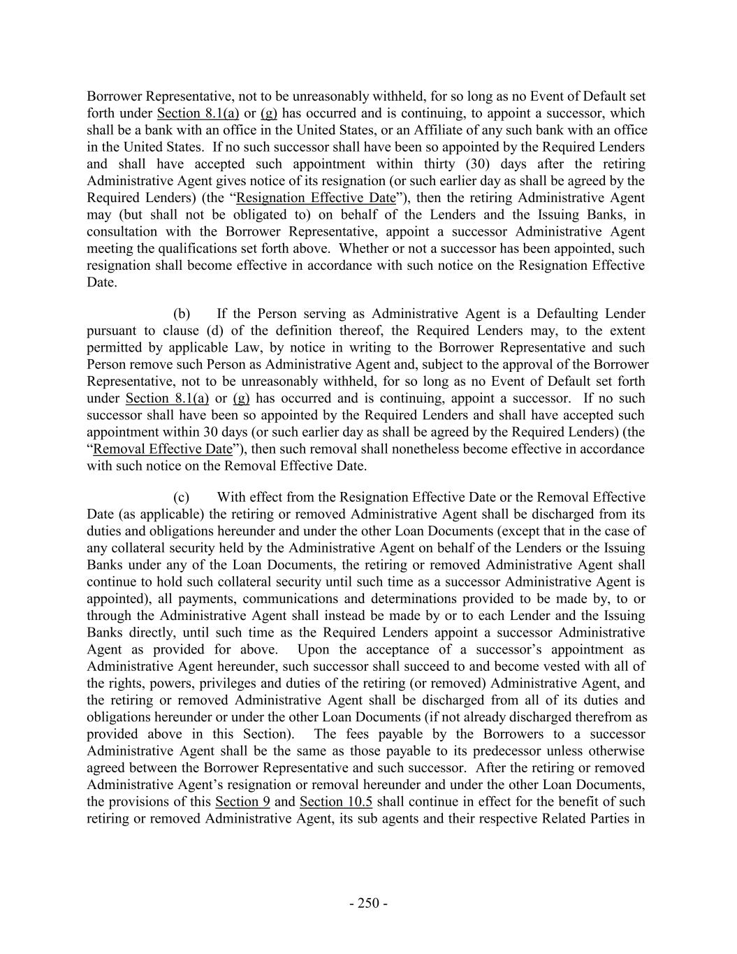 Borrower Representative, not to be unreasonably withheld, for so long as no Event of Default set forth under Section 8.1(a) or (g) has occurred and is continuing, to appoint a successor, which shall be a bank with an office in the United States, or an Affiliate of any such bank with an office in the United States. If no such successor shall have been so appointed by the Required Lenders and shall have accepted such appointment within thirty (30) days after the retiring Administrative Agent gives notice of its resignation (or such earlier day as shall be agreed by the Required Lenders) (the “Resignation Effective Date”), then the retiring Administrative Agent may (but shall not be obligated to) on behalf of the Lenders and the Issuing Banks, in consultation with the Borrower Representative, appoint a successor Administrative Agent meeting the qualifications set forth above. Whether or not a successor has been appointed, such resignation shall become effective in accordance with such notice on the Resignation Effective Date. (b) If the Person serving as Administrative Agent is a Defaulting Lender pursuant to clause (d) of the definition thereof, the Required Lenders may, to the extent permitted by applicable Law, by notice in writing to the Borrower Representative and such Person remove such Person as Administrative Agent and, subject to the approval of the Borrower Representative, not to be unreasonably withheld, for so long as no Event of Default set forth under Section 8.1(a) or (g) has occurred and is continuing, appoint a successor. If no such successor shall have been so appointed by the Required Lenders and shall have accepted such appointment within 30 days (or such earlier day as shall be agreed by the Required Lenders) (the “Removal Effective Date”), then such removal shall nonetheless become effective in accordance with such notice on the Removal Effective Date. (c) With effect from the Resignation Effective Date or the Removal Effective Date (as applicable) the retiring or removed Administrative Agent shall be discharged from its duties and obligations hereunder and under the other Loan Documents (except that in the case of any collateral security held by the Administrative Agent on behalf of the Lenders or the Issuing Banks under any of the Loan Documents, the retiring or removed Administrative Agent shall continue to hold such collateral security until such time as a successor Administrative Agent is appointed), all payments, communications and determinations provided to be made by, to or through the Administrative Agent shall instead be made by or to each Lender and the Issuing Banks directly, until such time as the Required Lenders appoint a successor Administrative Agent as provided for above. Upon the acceptance of a successor’s appointment as Administrative Agent hereunder, such successor shall succeed to and become vested with all of the rights, powers, privileges and duties of the retiring (or removed) Administrative Agent, and the retiring or removed Administrative Agent shall be discharged from all of its duties and obligations hereunder or under the other Loan Documents (if not already discharged therefrom as provided above in this Section). The fees payable by the Borrowers to a successor Administrative Agent shall be the same as those payable to its predecessor unless otherwise agreed between the Borrower Representative and such successor. After the retiring or removed Administrative Agent’s resignation or removal hereunder and under the other Loan Documents, the provisions of this Section 9 and Section 10.5 shall continue in effect for the benefit of such retiring or removed Administrative Agent, its sub agents and their respective Related Parties in - 250 -