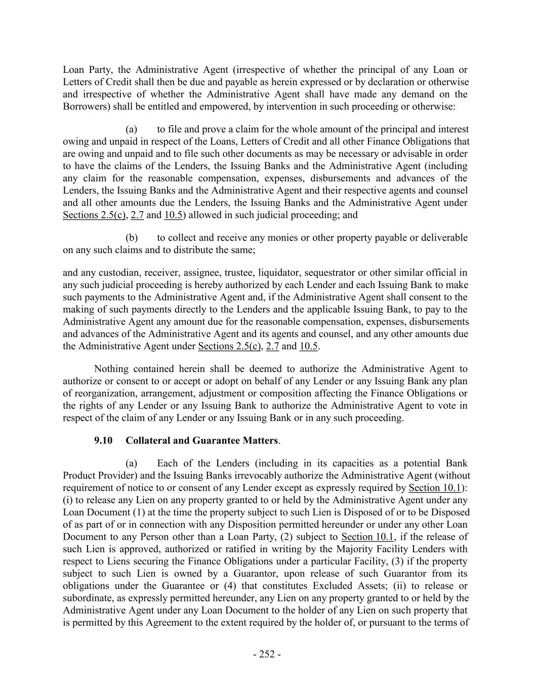 Loan Party, the Administrative Agent (irrespective of whether the principal of any Loan or Letters of Credit shall then be due and payable as herein expressed or by declaration or otherwise and irrespective of whether the Administrative Agent shall have made any demand on the Borrowers) shall be entitled and empowered, by intervention in such proceeding or otherwise: (a) to file and prove a claim for the whole amount of the principal and interest owing and unpaid in respect of the Loans, Letters of Credit and all other Finance Obligations that are owing and unpaid and to file such other documents as may be necessary or advisable in order to have the claims of the Lenders, the Issuing Banks and the Administrative Agent (including any claim for the reasonable compensation, expenses, disbursements and advances of the Lenders, the Issuing Banks and the Administrative Agent and their respective agents and counsel and all other amounts due the Lenders, the Issuing Banks and the Administrative Agent under Sections 2.5(c), 2.7 and 10.5) allowed in such judicial proceeding; and (b) to collect and receive any monies or other property payable or deliverable on any such claims and to distribute the same; and any custodian, receiver, assignee, trustee, liquidator, sequestrator or other similar official in any such judicial proceeding is hereby authorized by each Lender and each Issuing Bank to make such payments to the Administrative Agent and, if the Administrative Agent shall consent to the making of such payments directly to the Lenders and the applicable Issuing Bank, to pay to the Administrative Agent any amount due for the reasonable compensation, expenses, disbursements and advances of the Administrative Agent and its agents and counsel, and any other amounts due the Administrative Agent under Sections 2.5(c), 2.7 and 10.5. Nothing contained herein shall be deemed to authorize the Administrative Agent to authorize or consent to or accept or adopt on behalf of any Lender or any Issuing Bank any plan of reorganization, arrangement, adjustment or composition affecting the Finance Obligations or the rights of any Lender or any Issuing Bank to authorize the Administrative Agent to vote in respect of the claim of any Lender or any Issuing Bank or in any such proceeding. 9.10 Collateral and Guarantee Matters. (a) Each of the Lenders (including in its capacities as a potential Bank Product Provider) and the Issuing Banks irrevocably authorize the Administrative Agent (without requirement of notice to or consent of any Lender except as expressly required by Section 10.1): (i) to release any Lien on any property granted to or held by the Administrative Agent under any Loan Document (1) at the time the property subject to such Lien is Disposed of or to be Disposed of as part of or in connection with any Disposition permitted hereunder or under any other Loan Document to any Person other than a Loan Party, (2) subject to Section 10.1, if the release of such Lien is approved, authorized or ratified in writing by the Majority Facility Lenders with respect to Liens securing the Finance Obligations under a particular Facility, (3) if the property subject to such Lien is owned by a Guarantor, upon release of such Guarantor from its obligations under the Guarantee or (4) that constitutes Excluded Assets; (ii) to release or subordinate, as expressly permitted hereunder, any Lien on any property granted to or held by the Administrative Agent under any Loan Document to the holder of any Lien on such property that is permitted by this Agreement to the extent required by the holder of, or pursuant to the terms of - 252 -