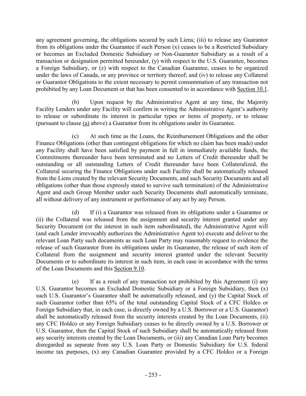 any agreement governing, the obligations secured by such Liens; (iii) to release any Guarantor from its obligations under the Guarantee if such Person (x) ceases to be a Restricted Subsidiary or becomes an Excluded Domestic Subsidiary or Non-Guarantor Subsidiary as a result of a transaction or designation permitted hereunder, (y) with respect to the U.S. Guarantee, becomes a Foreign Subsidiary, or (z) with respect to the Canadian Guarantee, ceases to be organized under the laws of Canada, or any province or territory thereof; and (iv) to release any Collateral or Guarantor Obligations to the extent necessary to permit consummation of any transaction not prohibited by any Loan Document or that has been consented to in accordance with Section 10.1. (b) Upon request by the Administrative Agent at any time, the Majority Facility Lenders under any Facility will confirm in writing the Administrative Agent’s authority to release or subordinate its interest in particular types or items of property, or to release (pursuant to clause (a) above) a Guarantor from its obligations under its Guarantee. (c) At such time as the Loans, the Reimbursement Obligations and the other Finance Obligations (other than contingent obligations for which no claim has been made) under any Facility shall have been satisfied by payment in full in immediately available funds, the Commitments thereunder have been terminated and no Letters of Credit thereunder shall be outstanding or all outstanding Letters of Credit thereunder have been Collateralized, the Collateral securing the Finance Obligations under such Facility shall be automatically released from the Liens created by the relevant Security Documents, and such Security Documents and all obligations (other than those expressly stated to survive such termination) of the Administrative Agent and each Group Member under such Security Documents shall automatically terminate, all without delivery of any instrument or performance of any act by any Person. (d) If (i) a Guarantor was released from its obligations under a Guarantee or (ii) the Collateral was released from the assignment and security interest granted under any Security Document (or the interest in such item subordinated), the Administrative Agent will (and each Lender irrevocably authorizes the Administrative Agent to) execute and deliver to the relevant Loan Party such documents as such Loan Party may reasonably request to evidence the release of such Guarantor from its obligations under its Guarantee, the release of such item of Collateral from the assignment and security interest granted under the relevant Security Documents or to subordinate its interest in such item, in each case in accordance with the terms of the Loan Documents and this Section 9.10. (e) If as a result of any transaction not prohibited by this Agreement (i) any U.S. Guarantor becomes an Excluded Domestic Subsidiary or a Foreign Subsidiary, then (x) such U.S. Guarantor’s Guarantee shall be automatically released, and (y) the Capital Stock of such Guarantor (other than 65% of the total outstanding Capital Stock of a CFC Holdco or Foreign Subsidiary that, in each case, is directly owned by a U.S. Borrower or a U.S. Guarantor) shall be automatically released from the security interests created by the Loan Documents, (ii) any CFC Holdco or any Foreign Subsidiary ceases to be directly owned by a U.S. Borrower or U.S. Guarantor, then the Capital Stock of such Subsidiary shall be automatically released from any security interests created by the Loan Documents, or (iii) any Canadian Loan Party becomes disregarded as separate from any U.S. Loan Party or Domestic Subsidiary for U.S. federal income tax purposes, (x) any Canadian Guarantee provided by a CFC Holdco or a Foreign - 253 -