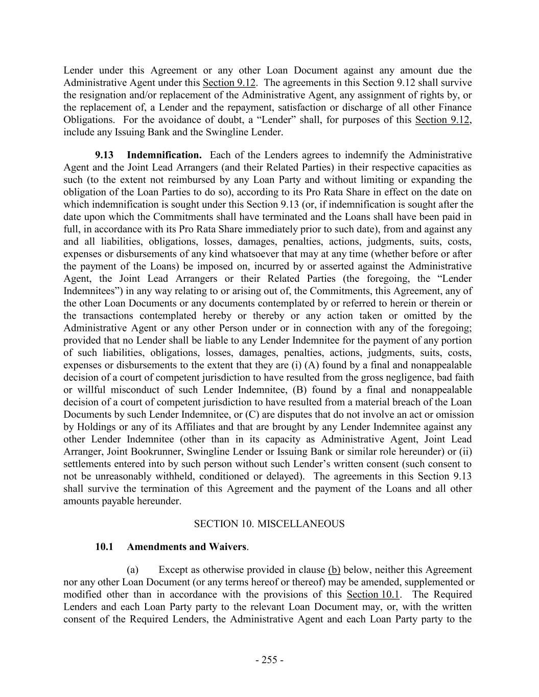 Lender under this Agreement or any other Loan Document against any amount due the Administrative Agent under this Section 9.12. The agreements in this Section 9.12 shall survive the resignation and/or replacement of the Administrative Agent, any assignment of rights by, or the replacement of, a Lender and the repayment, satisfaction or discharge of all other Finance Obligations. For the avoidance of doubt, a “Lender” shall, for purposes of this Section 9.12, include any Issuing Bank and the Swingline Lender. 9.13 Indemnification. Each of the Lenders agrees to indemnify the Administrative Agent and the Joint Lead Arrangers (and their Related Parties) in their respective capacities as such (to the extent not reimbursed by any Loan Party and without limiting or expanding the obligation of the Loan Parties to do so), according to its Pro Rata Share in effect on the date on which indemnification is sought under this Section 9.13 (or, if indemnification is sought after the date upon which the Commitments shall have terminated and the Loans shall have been paid in full, in accordance with its Pro Rata Share immediately prior to such date), from and against any and all liabilities, obligations, losses, damages, penalties, actions, judgments, suits, costs, expenses or disbursements of any kind whatsoever that may at any time (whether before or after the payment of the Loans) be imposed on, incurred by or asserted against the Administrative Agent, the Joint Lead Arrangers or their Related Parties (the foregoing, the “Lender Indemnitees”) in any way relating to or arising out of, the Commitments, this Agreement, any of the other Loan Documents or any documents contemplated by or referred to herein or therein or the transactions contemplated hereby or thereby or any action taken or omitted by the Administrative Agent or any other Person under or in connection with any of the foregoing; provided that no Lender shall be liable to any Lender Indemnitee for the payment of any portion of such liabilities, obligations, losses, damages, penalties, actions, judgments, suits, costs, expenses or disbursements to the extent that they are (i) (A) found by a final and nonappealable decision of a court of competent jurisdiction to have resulted from the gross negligence, bad faith or willful misconduct of such Lender Indemnitee, (B) found by a final and nonappealable decision of a court of competent jurisdiction to have resulted from a material breach of the Loan Documents by such Lender Indemnitee, or (C) are disputes that do not involve an act or omission by Holdings or any of its Affiliates and that are brought by any Lender Indemnitee against any other Lender Indemnitee (other than in its capacity as Administrative Agent, Joint Lead Arranger, Joint Bookrunner, Swingline Lender or Issuing Bank or similar role hereunder) or (ii) settlements entered into by such person without such Lender’s written consent (such consent to not be unreasonably withheld, conditioned or delayed). The agreements in this Section 9.13 shall survive the termination of this Agreement and the payment of the Loans and all other amounts payable hereunder. SECTION 10. MISCELLANEOUS 10.1 Amendments and Waivers. (a) Except as otherwise provided in clause (b) below, neither this Agreement nor any other Loan Document (or any terms hereof or thereof) may be amended, supplemented or modified other than in accordance with the provisions of this Section 10.1. The Required Lenders and each Loan Party party to the relevant Loan Document may, or, with the written consent of the Required Lenders, the Administrative Agent and each Loan Party party to the - 255 -
