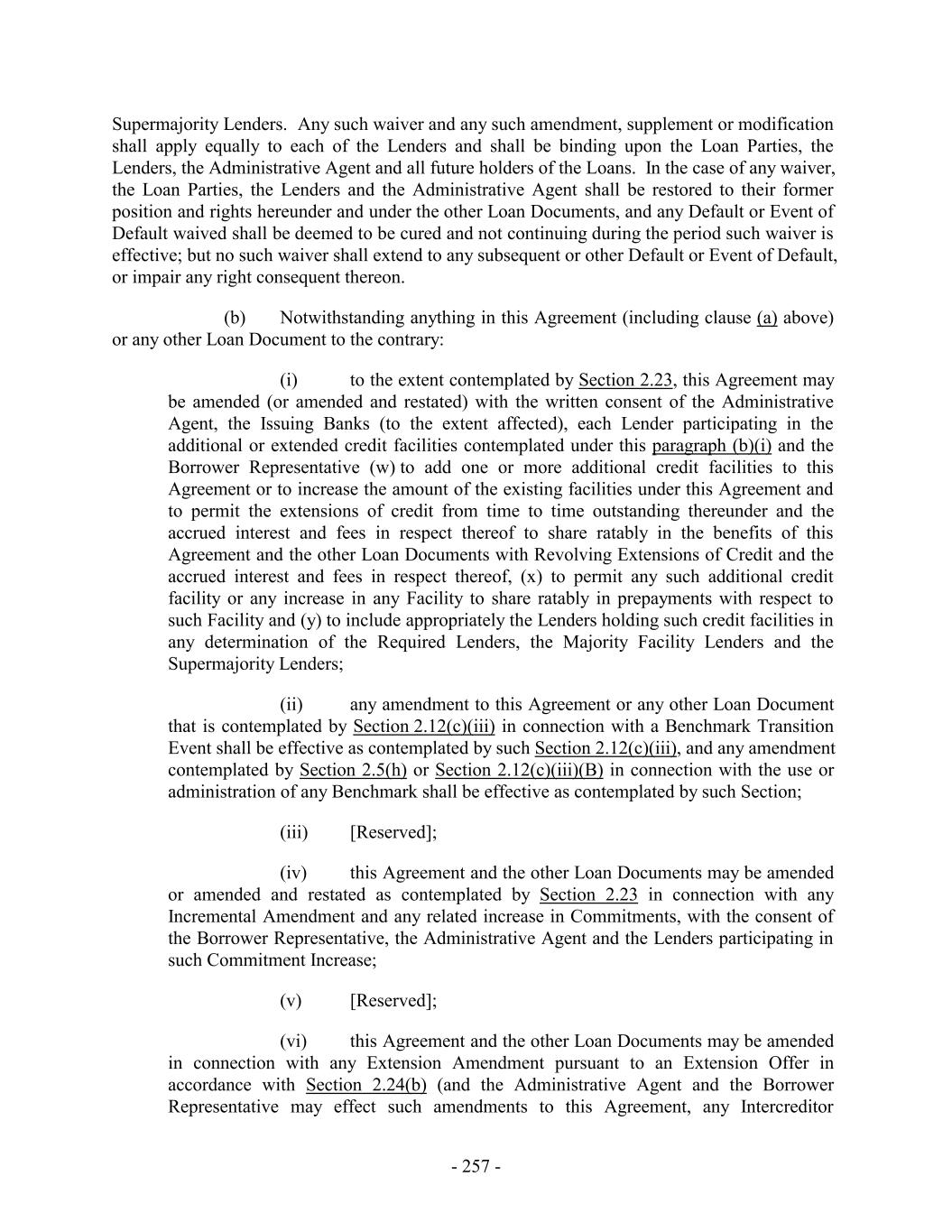 Supermajority Lenders. Any such waiver and any such amendment, supplement or modification shall apply equally to each of the Lenders and shall be binding upon the Loan Parties, the Lenders, the Administrative Agent and all future holders of the Loans. In the case of any waiver, the Loan Parties, the Lenders and the Administrative Agent shall be restored to their former position and rights hereunder and under the other Loan Documents, and any Default or Event of Default waived shall be deemed to be cured and not continuing during the period such waiver is effective; but no such waiver shall extend to any subsequent or other Default or Event of Default, or impair any right consequent thereon. (b) Notwithstanding anything in this Agreement (including clause (a) above) or any other Loan Document to the contrary: (i) to the extent contemplated by Section 2.23, this Agreement may be amended (or amended and restated) with the written consent of the Administrative Agent, the Issuing Banks (to the extent affected), each Lender participating in the additional or extended credit facilities contemplated under this paragraph (b)(i) and the Borrower Representative (w) to add one or more additional credit facilities to this Agreement or to increase the amount of the existing facilities under this Agreement and to permit the extensions of credit from time to time outstanding thereunder and the accrued interest and fees in respect thereof to share ratably in the benefits of this Agreement and the other Loan Documents with Revolving Extensions of Credit and the accrued interest and fees in respect thereof, (x) to permit any such additional credit facility or any increase in any Facility to share ratably in prepayments with respect to such Facility and (y) to include appropriately the Lenders holding such credit facilities in any determination of the Required Lenders, the Majority Facility Lenders and the Supermajority Lenders; (ii) any amendment to this Agreement or any other Loan Document that is contemplated by Section 2.12(c)(iii) in connection with a Benchmark Transition Event shall be effective as contemplated by such Section 2.12(c)(iii), and any amendment contemplated by Section 2.5(h) or Section 2.12(c)(iii)(B) in connection with the use or administration of any Benchmark shall be effective as contemplated by such Section; (iii) [Reserved]; (iv) this Agreement and the other Loan Documents may be amended or amended and restated as contemplated by Section 2.23 in connection with any Incremental Amendment and any related increase in Commitments, with the consent of the Borrower Representative, the Administrative Agent and the Lenders participating in such Commitment Increase; (v) [Reserved]; (vi) this Agreement and the other Loan Documents may be amended in connection with any Extension Amendment pursuant to an Extension Offer in accordance with Section 2.24(b) (and the Administrative Agent and the Borrower Representative may effect such amendments to this Agreement, any Intercreditor - 257 -