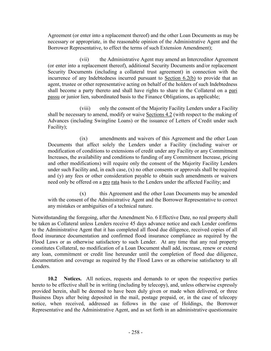 Agreement (or enter into a replacement thereof) and the other Loan Documents as may be necessary or appropriate, in the reasonable opinion of the Administrative Agent and the Borrower Representative, to effect the terms of such Extension Amendment); (vii) the Administrative Agent may amend an Intercreditor Agreement (or enter into a replacement thereof), additional Security Documents and/or replacement Security Documents (including a collateral trust agreement) in connection with the incurrence of any Indebtedness incurred pursuant to Section 6.2(b) to provide that an agent, trustee or other representative acting on behalf of the holders of such Indebtedness shall become a party thereto and shall have rights to share in the Collateral on a pari passu or junior lien, subordinated basis to the Finance Obligations, as applicable; (viii) only the consent of the Majority Facility Lenders under a Facility shall be necessary to amend, modify or waive Sections 4.2 (with respect to the making of Advances (including Swingline Loans) or the issuance of Letters of Credit under such Facility); (ix) amendments and waivers of this Agreement and the other Loan Documents that affect solely the Lenders under a Facility (including waiver or modification of conditions to extensions of credit under any Facility or any Commitment Increases, the availability and conditions to funding of any Commitment Increase, pricing and other modifications) will require only the consent of the Majority Facility Lenders under such Facility and, in each case, (x) no other consents or approvals shall be required and (y) any fees or other consideration payable to obtain such amendments or waivers need only be offered on a pro rata basis to the Lenders under the affected Facility; and (x) this Agreement and the other Loan Documents may be amended with the consent of the Administrative Agent and the Borrower Representative to correct any mistakes or ambiguities of a technical nature. Notwithstanding the foregoing, after the Amendment No. 6 Effective Date, no real property shall be taken as Collateral unless Lenders receive 45 days advance notice and each Lender confirms to the Administrative Agent that it has completed all flood due diligence, received copies of all flood insurance documentation and confirmed flood insurance compliance as required by the Flood Laws or as otherwise satisfactory to such Lender. At any time that any real property constitutes Collateral, no modification of a Loan Document shall add, increase, renew or extend any loan, commitment or credit line hereunder until the completion of flood due diligence, documentation and coverage as required by the Flood Laws or as otherwise satisfactory to all Lenders. 10.2 Notices. All notices, requests and demands to or upon the respective parties hereto to be effective shall be in writing (including by telecopy), and, unless otherwise expressly provided herein, shall be deemed to have been duly given or made when delivered, or three Business Days after being deposited in the mail, postage prepaid, or, in the case of telecopy notice, when received, addressed as follows in the case of Holdings, the Borrower Representative and the Administrative Agent, and as set forth in an administrative questionnaire - 258 -