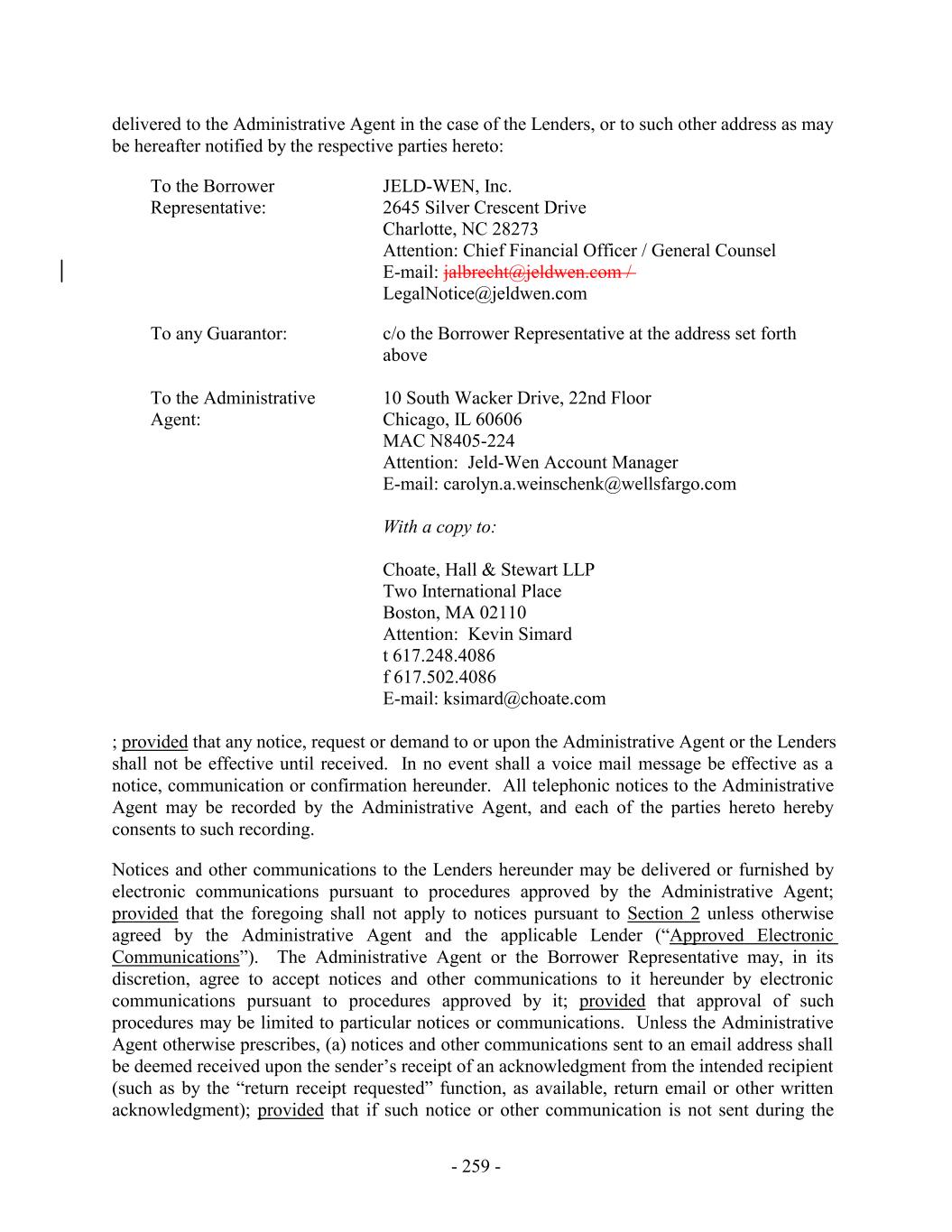 - 259 - To any Guarantor: c/o the Borrower Representative at the address set forth above To the Borrower Representative: To the Administrative Agent: JELD-WEN, Inc. 2645 Silver Crescent Drive Charlotte, NC 28273 Attention: Chief Financial Officer / General Counsel E-mail: jalbrecht@jeldwen.com / LegalNotice@jeldwen.com 10 South Wacker Drive, 22nd Floor Chicago, IL 60606 MAC N8405-224 Attention: Jeld-Wen Account Manager E-mail: carolyn.a.weinschenk@wellsfargo.com With a copy to: Choate, Hall & Stewart LLP Two International Place Boston, MA 02110 Attention: Kevin Simard t 617.248.4086 f 617.502.4086 E-mail: ksimard@choate.com delivered to the Administrative Agent in the case of the Lenders, or to such other address as may be hereafter notified by the respective parties hereto: ; provided that any notice, request or demand to or upon the Administrative Agent or the Lenders shall not be effective until received. In no event shall a voice mail message be effective as a notice, communication or confirmation hereunder. All telephonic notices to the Administrative Agent may be recorded by the Administrative Agent, and each of the parties hereto hereby consents to such recording. Notices and other communications to the Lenders hereunder may be delivered or furnished by electronic communications pursuant to procedures approved by the Administrative Agent; provided that the foregoing shall not apply to notices pursuant to Section 2 unless otherwise agreed by the Administrative Agent and the applicable Lender (“Approved Electronic Communications”). The Administrative Agent or the Borrower Representative may, in its discretion, agree to accept notices and other communications to it hereunder by electronic communications pursuant to procedures approved by it; provided that approval of such procedures may be limited to particular notices or communications. Unless the Administrative Agent otherwise prescribes, (a) notices and other communications sent to an email address shall be deemed received upon the sender’s receipt of an acknowledgment from the intended recipient (such as by the “return receipt requested” function, as available, return email or other written acknowledgment); provided that if such notice or other communication is not sent during the