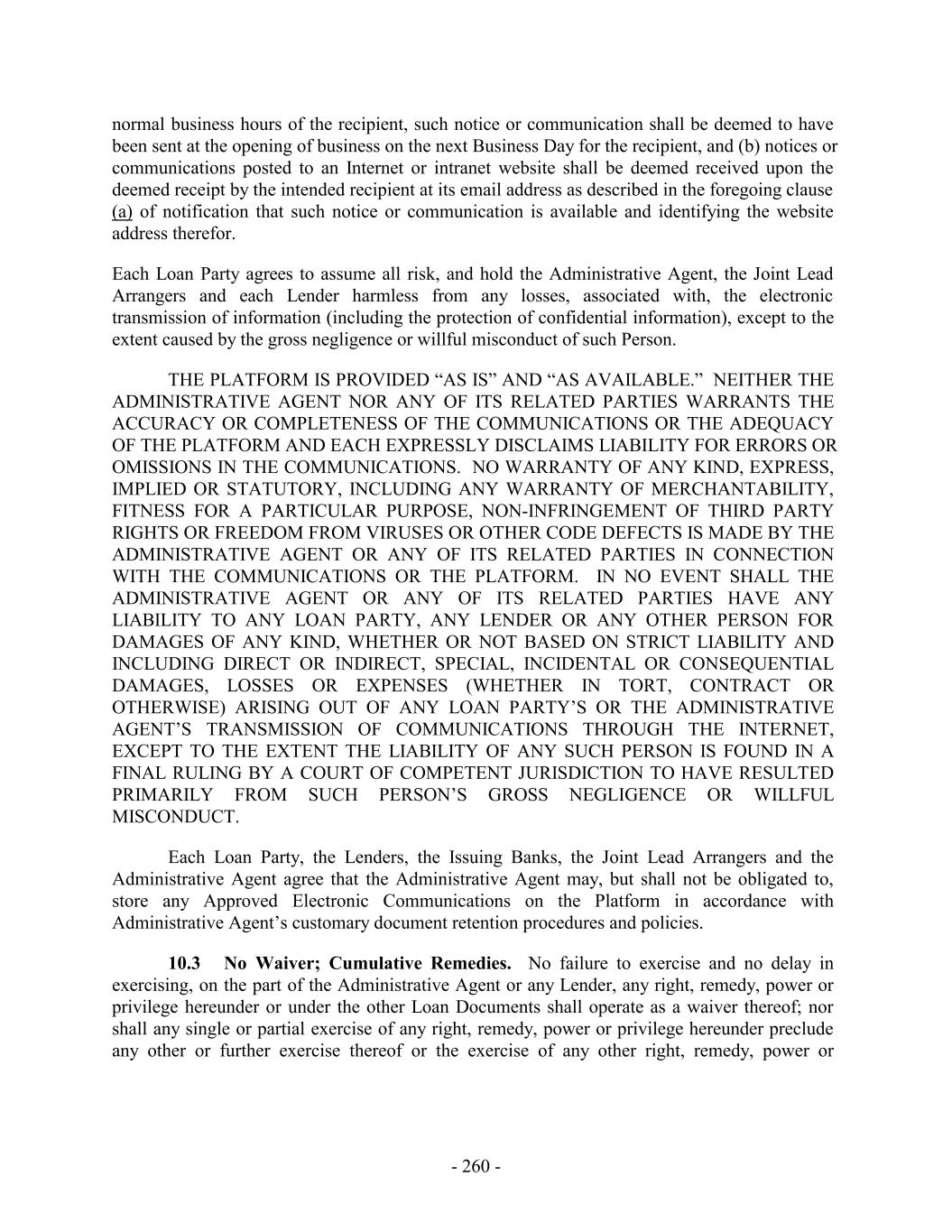 normal business hours of the recipient, such notice or communication shall be deemed to have been sent at the opening of business on the next Business Day for the recipient, and (b) notices or communications posted to an Internet or intranet website shall be deemed received upon the deemed receipt by the intended recipient at its email address as described in the foregoing clause (a) of notification that such notice or communication is available and identifying the website address therefor. Each Loan Party agrees to assume all risk, and hold the Administrative Agent, the Joint Lead Arrangers and each Lender harmless from any losses, associated with, the electronic transmission of information (including the protection of confidential information), except to the extent caused by the gross negligence or willful misconduct of such Person. THE PLATFORM IS PROVIDED “AS IS” AND “AS AVAILABLE.” NEITHER THE ADMINISTRATIVE AGENT NOR ANY OF ITS RELATED PARTIES WARRANTS THE ACCURACY OR COMPLETENESS OF THE COMMUNICATIONS OR THE ADEQUACY OF THE PLATFORM AND EACH EXPRESSLY DISCLAIMS LIABILITY FOR ERRORS OR OMISSIONS IN THE COMMUNICATIONS. NO WARRANTY OF ANY KIND, EXPRESS, IMPLIED OR STATUTORY, INCLUDING ANY WARRANTY OF MERCHANTABILITY, FITNESS FOR A PARTICULAR PURPOSE, NON-INFRINGEMENT OF THIRD PARTY RIGHTS OR FREEDOM FROM VIRUSES OR OTHER CODE DEFECTS IS MADE BY THE ADMINISTRATIVE AGENT OR ANY OF ITS RELATED PARTIES IN CONNECTION WITH THE COMMUNICATIONS OR THE PLATFORM. IN NO EVENT SHALL THE ADMINISTRATIVE AGENT OR ANY OF ITS RELATED PARTIES HAVE ANY LIABILITY TO ANY LOAN PARTY, ANY LENDER OR ANY OTHER PERSON FOR DAMAGES OF ANY KIND, WHETHER OR NOT BASED ON STRICT LIABILITY AND INCLUDING DIRECT OR INDIRECT, SPECIAL, INCIDENTAL OR CONSEQUENTIAL DAMAGES, LOSSES OR EXPENSES (WHETHER IN TORT, CONTRACT OR OTHERWISE) ARISING OUT OF ANY LOAN PARTY’S OR THE ADMINISTRATIVE AGENT’S TRANSMISSION OF COMMUNICATIONS THROUGH THE INTERNET, EXCEPT TO THE EXTENT THE LIABILITY OF ANY SUCH PERSON IS FOUND IN A FINAL RULING BY A COURT OF COMPETENT JURISDICTION TO HAVE RESULTED PRIMARILY FROM SUCH PERSON’S GROSS NEGLIGENCE OR WILLFUL MISCONDUCT. Each Loan Party, the Lenders, the Issuing Banks, the Joint Lead Arrangers and the Administrative Agent agree that the Administrative Agent may, but shall not be obligated to, store any Approved Electronic Communications on the Platform in accordance with Administrative Agent’s customary document retention procedures and policies. 10.3 No Waiver; Cumulative Remedies. No failure to exercise and no delay in exercising, on the part of the Administrative Agent or any Lender, any right, remedy, power or privilege hereunder or under the other Loan Documents shall operate as a waiver thereof; nor shall any single or partial exercise of any right, remedy, power or privilege hereunder preclude any other or further exercise thereof or the exercise of any other right, remedy, power or - 260 -