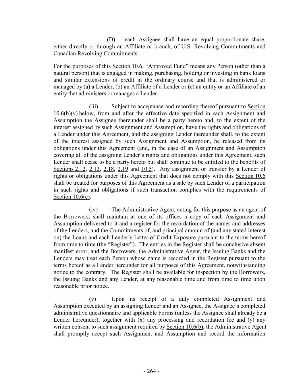 (D) each Assignee shall have an equal proportionate share, either directly or through an Affiliate or branch, of U.S. Revolving Commitments and Canadian Revolving Commitments. For the purposes of this Section 10.6, “Approved Fund” means any Person (other than a natural person) that is engaged in making, purchasing, holding or investing in bank loans and similar extensions of credit in the ordinary course and that is administered or managed by (a) a Lender, (b) an Affiliate of a Lender or (c) an entity or an Affiliate of an entity that administers or manages a Lender. (iii) Subject to acceptance and recording thereof pursuant to Section 10.6(b)(v) below, from and after the effective date specified in each Assignment and Assumption the Assignee thereunder shall be a party hereto and, to the extent of the interest assigned by such Assignment and Assumption, have the rights and obligations of a Lender under this Agreement, and the assigning Lender thereunder shall, to the extent of the interest assigned by such Assignment and Assumption, be released from its obligations under this Agreement (and, in the case of an Assignment and Assumption covering all of the assigning Lender’s rights and obligations under this Agreement, such Lender shall cease to be a party hereto but shall continue to be entitled to the benefits of Sections 2.12, 2.13, 2.18, 2.19 and 10.5). Any assignment or transfer by a Lender of rights or obligations under this Agreement that does not comply with this Section 10.6 shall be treated for purposes of this Agreement as a sale by such Lender of a participation in such rights and obligations if such transaction complies with the requirements of Section 10.6(c). (iv) The Administrative Agent, acting for this purpose as an agent of the Borrowers, shall maintain at one of its offices a copy of each Assignment and Assumption delivered to it and a register for the recordation of the names and addresses of the Lenders, and the Commitments of, and principal amount of (and any stated interest on) the Loans and each Lender’s Letter of Credit Exposure pursuant to the terms hereof from time to time (the “Register”). The entries in the Register shall be conclusive absent manifest error, and the Borrowers, the Administrative Agent, the Issuing Banks and the Lenders may treat each Person whose name is recorded in the Register pursuant to the terms hereof as a Lender hereunder for all purposes of this Agreement, notwithstanding notice to the contrary. The Register shall be available for inspection by the Borrowers, the Issuing Banks and any Lender, at any reasonable time and from time to time upon reasonable prior notice. (v) Upon its receipt of a duly completed Assignment and Assumption executed by an assigning Lender and an Assignee, the Assignee’s completed administrative questionnaire and applicable Forms (unless the Assignee shall already be a Lender hereunder), together with (x) any processing and recordation fee and (y) any written consent to such assignment required by Section 10.6(b), the Administrative Agent shall promptly accept such Assignment and Assumption and record the information - 264 -
