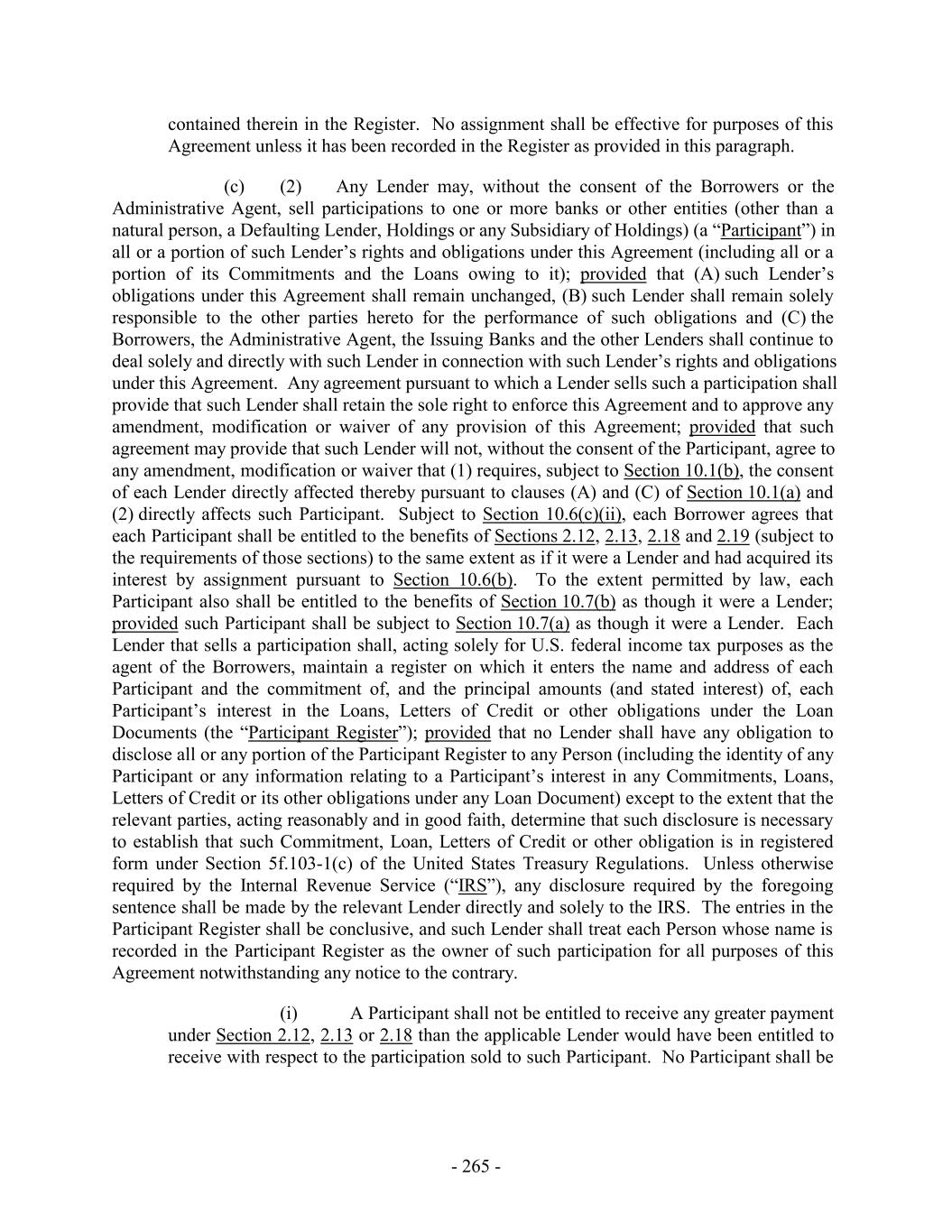 contained therein in the Register. No assignment shall be effective for purposes of this Agreement unless it has been recorded in the Register as provided in this paragraph. (c) (2) Any Lender may, without the consent of the Borrowers or the Administrative Agent, sell participations to one or more banks or other entities (other than a natural person, a Defaulting Lender, Holdings or any Subsidiary of Holdings) (a “Participant”) in all or a portion of such Lender’s rights and obligations under this Agreement (including all or a portion of its Commitments and the Loans owing to it); provided that (A) such Lender’s obligations under this Agreement shall remain unchanged, (B) such Lender shall remain solely responsible to the other parties hereto for the performance of such obligations and (C) the Borrowers, the Administrative Agent, the Issuing Banks and the other Lenders shall continue to deal solely and directly with such Lender in connection with such Lender’s rights and obligations under this Agreement. Any agreement pursuant to which a Lender sells such a participation shall provide that such Lender shall retain the sole right to enforce this Agreement and to approve any amendment, modification or waiver of any provision of this Agreement; provided that such agreement may provide that such Lender will not, without the consent of the Participant, agree to any amendment, modification or waiver that (1) requires, subject to Section 10.1(b), the consent of each Lender directly affected thereby pursuant to clauses (A) and (C) of Section 10.1(a) and (2) directly affects such Participant. Subject to Section 10.6(c)(ii), each Borrower agrees that each Participant shall be entitled to the benefits of Sections 2.12, 2.13, 2.18 and 2.19 (subject to the requirements of those sections) to the same extent as if it were a Lender and had acquired its interest by assignment pursuant to Section 10.6(b). To the extent permitted by law, each Participant also shall be entitled to the benefits of Section 10.7(b) as though it were a Lender; provided such Participant shall be subject to Section 10.7(a) as though it were a Lender. Each Lender that sells a participation shall, acting solely for U.S. federal income tax purposes as the agent of the Borrowers, maintain a register on which it enters the name and address of each Participant and the commitment of, and the principal amounts (and stated interest) of, each Participant’s interest in the Loans, Letters of Credit or other obligations under the Loan Documents (the “Participant Register”); provided that no Lender shall have any obligation to disclose all or any portion of the Participant Register to any Person (including the identity of any Participant or any information relating to a Participant’s interest in any Commitments, Loans, Letters of Credit or its other obligations under any Loan Document) except to the extent that the relevant parties, acting reasonably and in good faith, determine that such disclosure is necessary to establish that such Commitment, Loan, Letters of Credit or other obligation is in registered form under Section 5f.103-1(c) of the United States Treasury Regulations. Unless otherwise required by the Internal Revenue Service (“IRS”), any disclosure required by the foregoing sentence shall be made by the relevant Lender directly and solely to the IRS. The entries in the Participant Register shall be conclusive, and such Lender shall treat each Person whose name is recorded in the Participant Register as the owner of such participation for all purposes of this Agreement notwithstanding any notice to the contrary. (i) A Participant shall not be entitled to receive any greater payment under Section 2.12, 2.13 or 2.18 than the applicable Lender would have been entitled to receive with respect to the participation sold to such Participant. No Participant shall be - 265 -